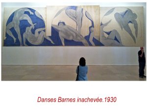Matisse a clairement pensé l’étendue des surfaces, comme une question, non de quantité, mais de qualité;.On lui prête cette phrase : » 2m2 de bleu, sont plus bleu que 2cm2 du même bleu ». L’érendue de la couleur, permet d’apprécier sa qualité de lumière et donc de spatialité. Elle devient une réalité et la couleur n’est plus une tonalité connotée sur un tableau/fenêtre, mais une réalité physique sur une surface/mur, tangible. Ainsi son intérêt pour les grandes surfaces, le conduit naturellement aux peintures murales, notamment avec la commande de Barnes, le philanthrope américain. Ici, il s’impose la même recherche de forme épuréer, de ligne et d’arabesque que dans sa recherche de couleurs.