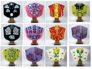 Il conçoit même les chasubles des officiants, qui se trouvent alors acteurs d’une performance artistique…devenant comme des poissons rouges dans leur bocal..monde à part, espace protégé, lumineux..