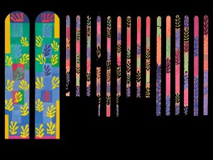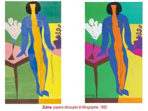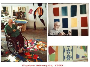 Matisse atteint d’arthrose, ne peut plus peindre et opte pour le découpage de formes dans de grands papiers peints. Il décrit cette action comme une taille directe dans la couleur, comme une sculpture. La couleur devient matériau, sculpture plane produisant des centaines de pièces à partir desquelles composer des figures et silhouettes lumineuses et légères.