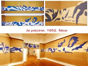 Le passage de ces nus bleus aux figures déconstruites et bondissantes de la piscine est logique. Une piscine est au corps ce que la chapelle est pour l’esprit. Un lieu ou le corps est en apesanteur, séparé du monde, protecteur et purifiant. Une nouvelle fois, Matisse trouve une occasion d’expérimenter un environnement architectural avec le principe d’une immersion totale. On retrouve biensûr la fascination pour le bocal de possons rouges..enfin tangible pour un genre humain en quête de luxe, calme et volupté. Du début à la fin de son travail artistique, il démontre une grande cohérence dans sa quête et dans les moyens mis en oeuvre.