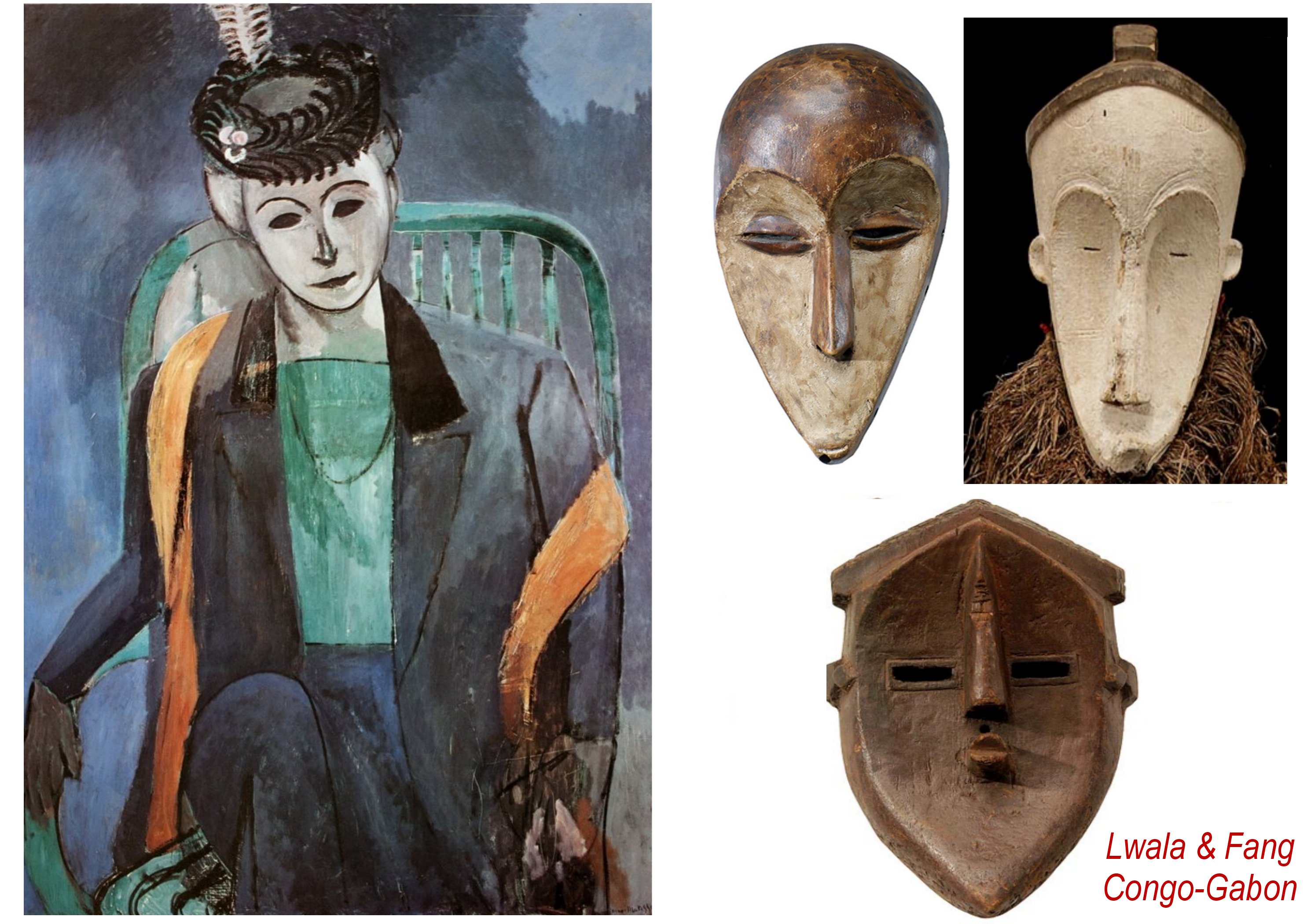 Comme la plupart de ses contemporains en quête de moyens d’expressions à même de traduire des dimensions spirituelles, Matisse voit dans les masques africains, des modèles d’épure et d’universalité par leur usage de signes au lieu d’imitations. Il reprend ces modèles dans ce portrait de Mme Matisse.