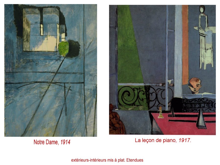 Bien que très soucieux de la 1ere guerre mondiale ( trop âgé pour la faire). Matisse se tient à son projet de n’exéciter que des oeuvres sans tensions. Ici, une lég_re mélancolie exprimée par les gris colorés et une certaine solitude. De grandes lignes structurant des espaces ouverts. Figures flottant, comme des rideaux. Tissu/mur et fenêtre à la fois.