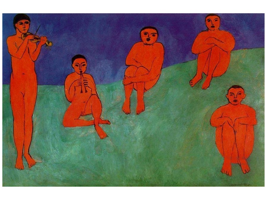 Avec la 2eme partie de ce dyptyque, Matisse nous renseigne sur son approche des arts cathartiques, qui selon Pythagore et les traditions, nous soulagent et nous lavent de nos scories et souillures matérielles. Mais il dissocie nettement, pour les harmoniser, les pratiques Apolliniennes et les pratiques Dyonisiaques. Ici, Matisse utilise le même arrangement coloré et la même disposition de figures. A droite et deboutr l’instrument à corde, apollinien, à gauche, tassés, soufflant et chantant, des crops, près du sol, produisant comme Dyonisos des sons venant du corps et du souffle.. Selon le mythe de Apollon et Marsyas, Apollon ùéprise ( comme Athéna) les instruments à vent de Pan le satyre, dont Marsyas, satyre aussi use, jusqu’à l’écorcher vif et doter Mydas d’oreilles d’âne pour avoir donné l’avantage à Marsyas. Mais ici, ces 2 pratiques sont réunies et se complètent.