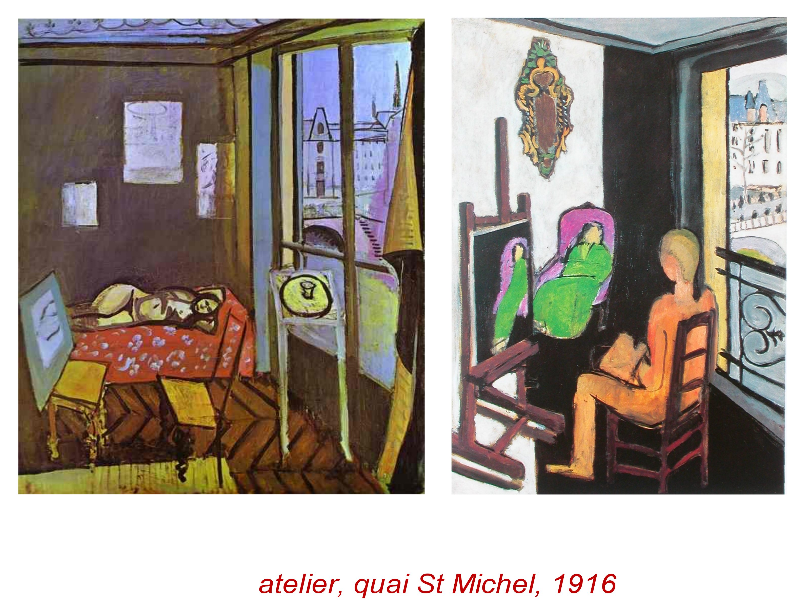 Dans ces 2 oeuvres, nous retrouvons un coin d’atelier ou à chaque fois, Matisse propose les différents aspects du réel. l’intérieur à gauche, rassurant et apaisant. l’angle de la pièce séparant les fauteuils et canapés, ou encore chevalets et peinture, de la droite, lien avec le monde extérieur, de la fen^tre et aussi du regard de l’artiste, qui comme vide, ici, se fait le simple vecteur de la transfromation vers l’épure..