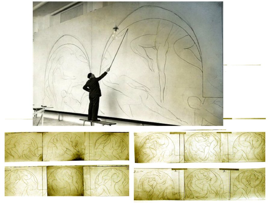 Matisse a clairement pensé l’étendue des surfaces, comme une question, non de quantité, mais de qualité;.On lui prête cette phrase : » 2m2 de bleu, sont plus bleu que 2cm2 du même bleu ». L’érendue de la couleur, permet d’apprécier sa qualité de lumière et donc de spatialité. Elle devient une réalité et la couleur n’est plus une tonalité connotée sur un tableau/fenêtre, mais une réalité physique sur une surface/mur, tangible. Ainsi son intérêt pour les grandes surfaces, le conduit naturellement aux peintures murales, notamment avec la commande de Barnes, le philanthrope américain. Ici, il s’impose la même recherche de forme épuréer, de ligne et d’arabesque que dans sa recherche de couleurs.