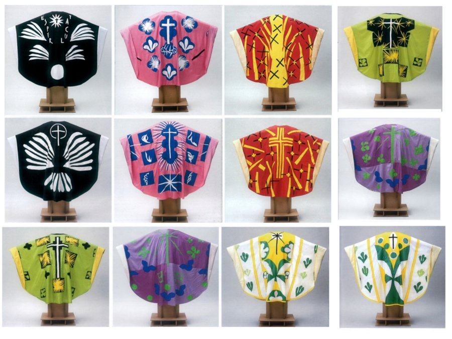 Il conçoit même les chasubles des officiants, qui se trouvent alors acteurs d’une performance artistique…devenant comme des poissons rouges dans leur bocal..monde à part, espace protégé, lumineux..