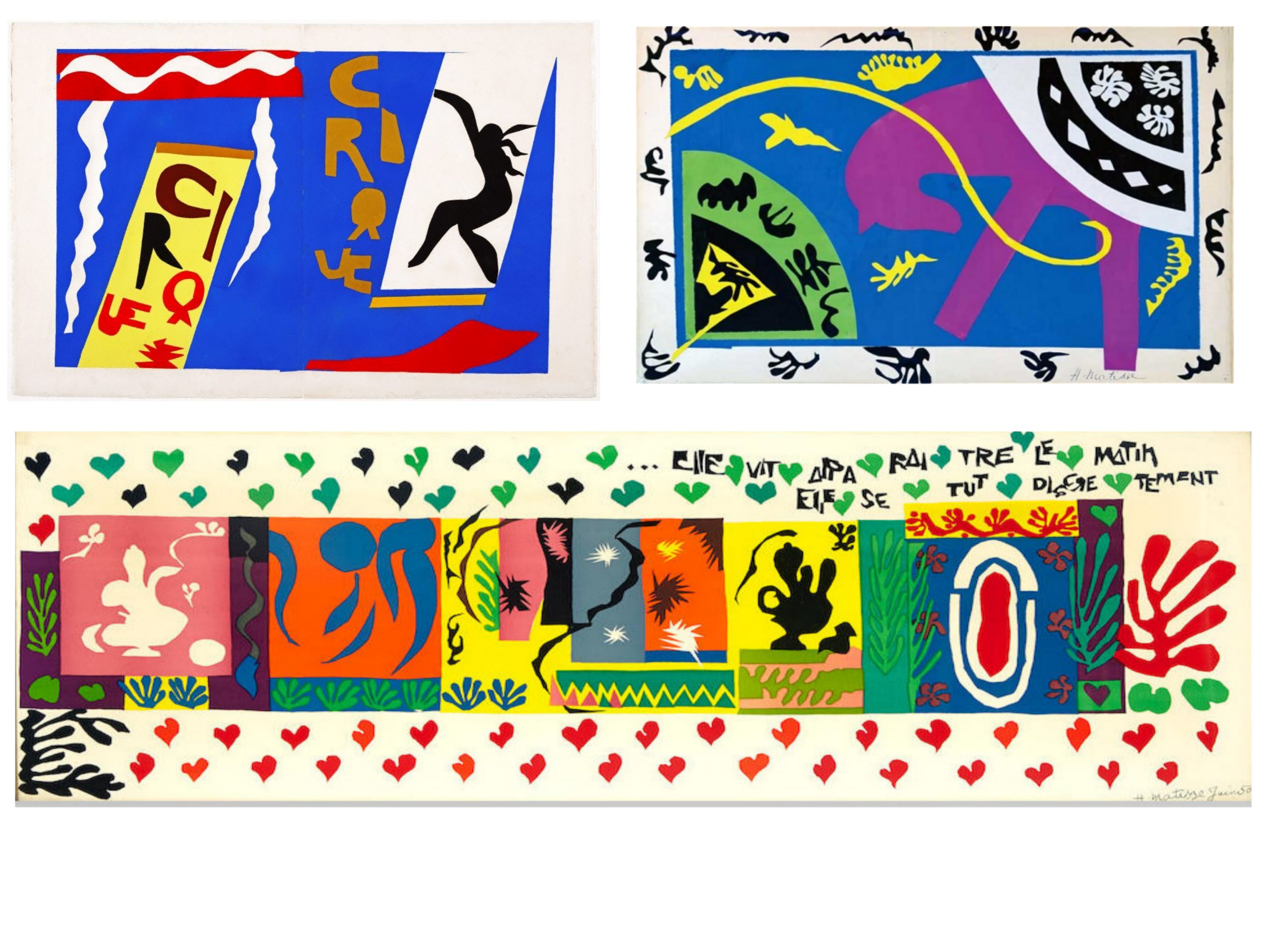 Matisse transpose aisément ses papiers découpés en lithographies, car les a-plats obtenus se prêtent particulièrement à cette technique et permettent des multiples. De même l’épure et la simplicité des formes, associées comme il le revendique aux couleurs adpatées, concourrent à un art aisément apréhensible et compatible avec le monde de l’affiche. Matisse, à la fin de sa vie, dans les années 50..sera d’ailleurs une des très grande référence des artistes du Pop Art.
