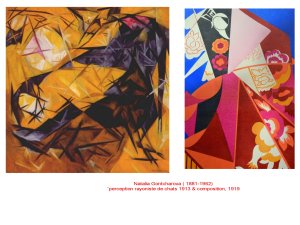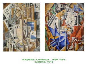 Comme un grand nombre de jeunes artistes, elle se saisit immédiatement du nouveau langage cubiste. Voyant la, une manière de traiter le grand désir de modernité qui enflamme toute cette jeunesse russe, coincée dans l’univers archaïque du tasarisme. Elle approche cependant le monde de la couleur, écarté par Picasso et Braque dans leur période analytique.Ces peintures datent de 1910, à peine 3 ans après les « demoiselles d’Avignon ». On mesure bien la rapidité des échanges, et la capacité de compréhension de cette génération.