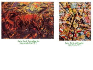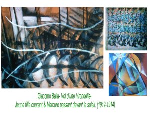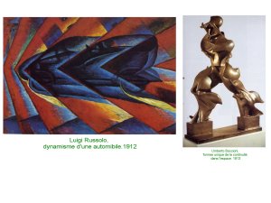 En Italie, l’aspiration futurste, repose sur un groupe de jeunes artistes, frustrés des retards de l’ Italie, en matière de modernité, de technologie. Le poids du passé est trop fort et ils aspirent aux accidents, aux conflits, aux catastrophes pour balayer lees traditions. Fascination pour le mouvement et le dynamisme.