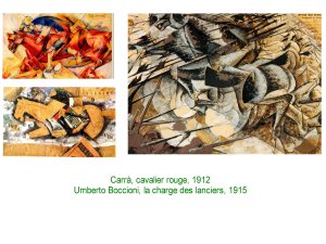 Guerres et conflits, charges de cavaliers..Tout ce qui peut basculer et bousculer le monde. Certains verront dans le fascisme mussolinien, un idéal de modernité viriliste et technophile, à la hauter de leurs aspirations.