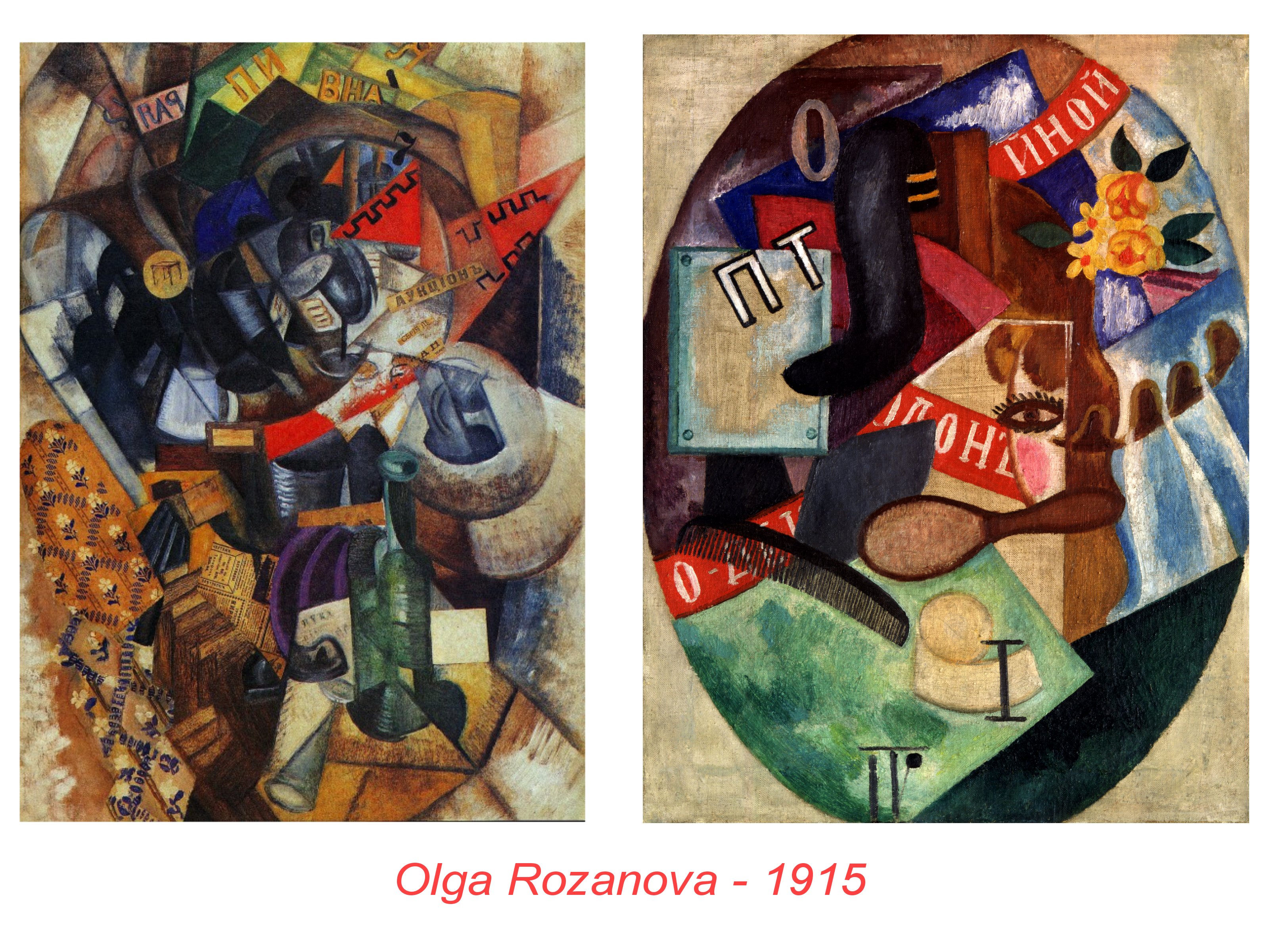 Mais Alexandra Exter est loin d’être la seule femme artiste de cette période bouillonnante. Ce n’est pas un hasard que de nombreuses jeunes femmes, se soient engouffrées dans la brèche créée dans l’art institutionnel et patriarcal, hérité du 19e siècle. Olga Rozanova, 1886-1918 est l’une des plus précoces et audacieuses artistes dece moment.Dès 1910 elle écrit un manifeste moderniste.