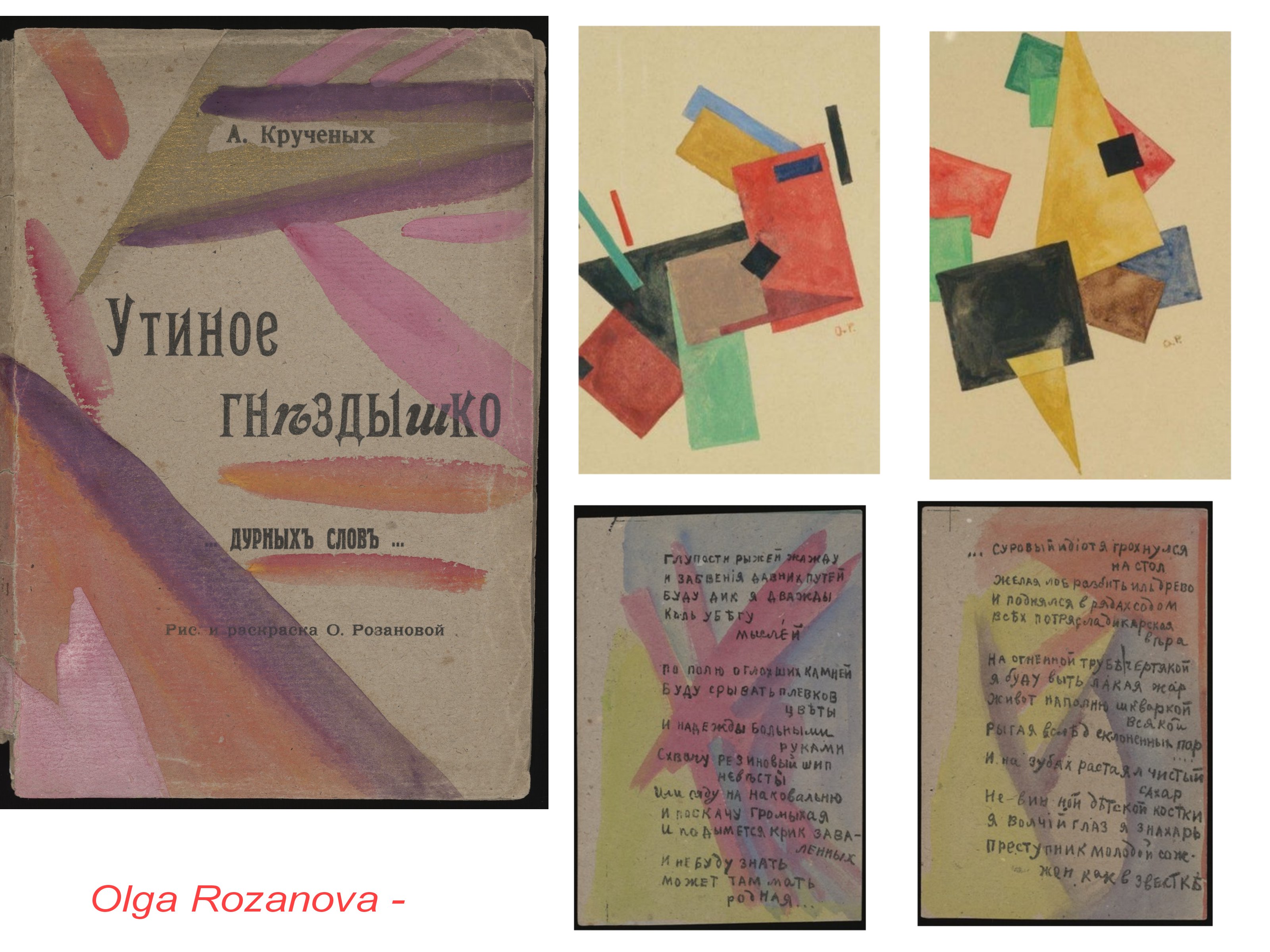 Dans cette série d’illustrations non figuratives et de jeux typographiques, on peut voir une proximité avec la prose du transsibérien, de sa compatriote Sonia Delaunay(Stern ( Ukrainienne).