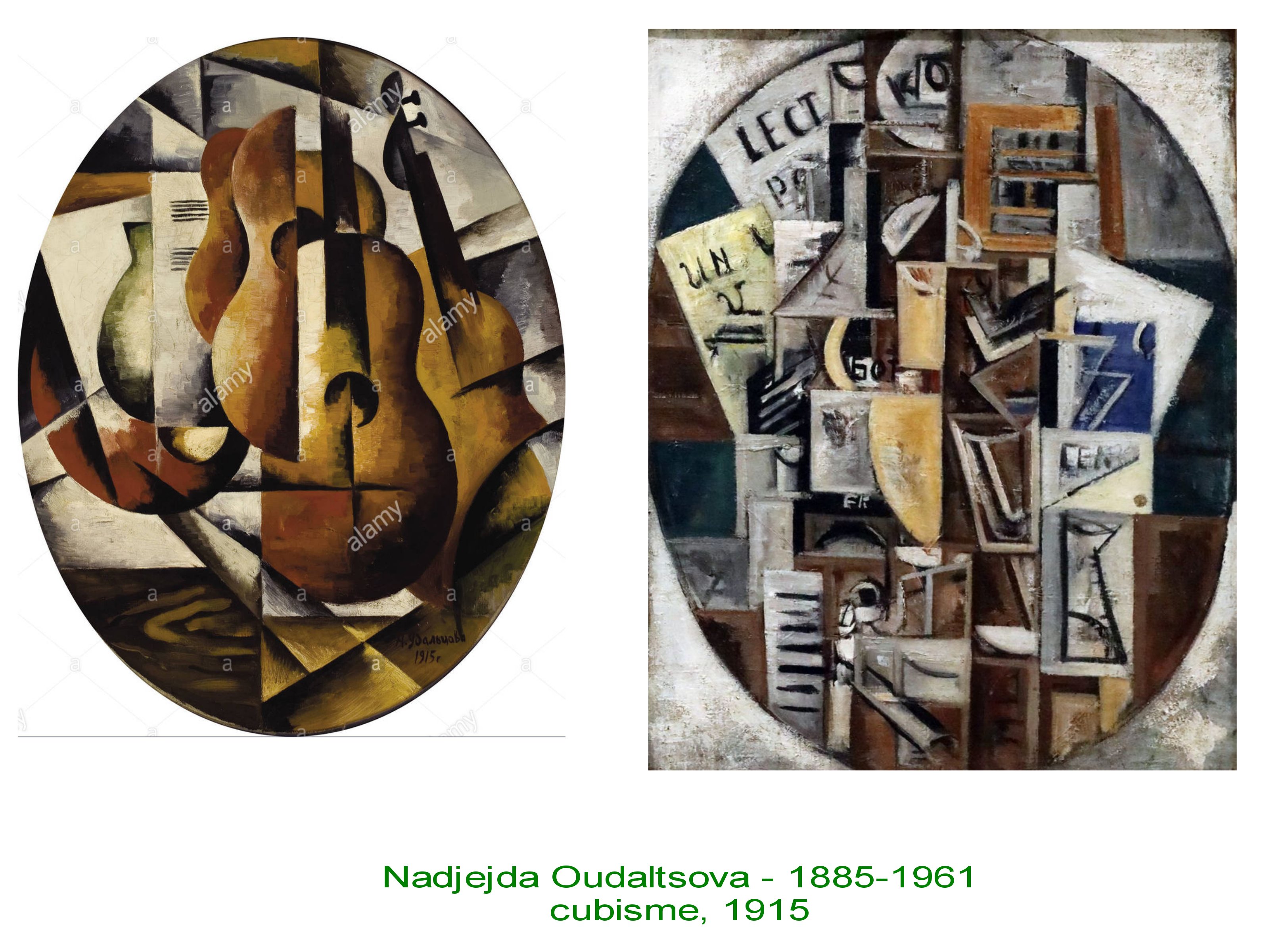 Nadejda Ouldatsova, saist très bien la logique du format ovale des cubistes, comme référence à la réalité de la perception oculaire ( la vision n’est pas « rectangulaire ». Elle démontre aussi la compréhension de la notion de « signes » capables de traduire une réalité et non de l’imiter. Signes des formes, des matières, des fonctions, des volumes…