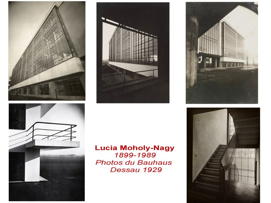Dans le domaine de la photographie, longtemps elle aussi délaissée par les artistes masculins, de nombreuses jeunes femmes s’engouffrent, telle Lucia Moholy-Nagy, qui herche et trouve des angles de vue exprimant la modernité des bâtiments de la nouvelle école de Dessau.