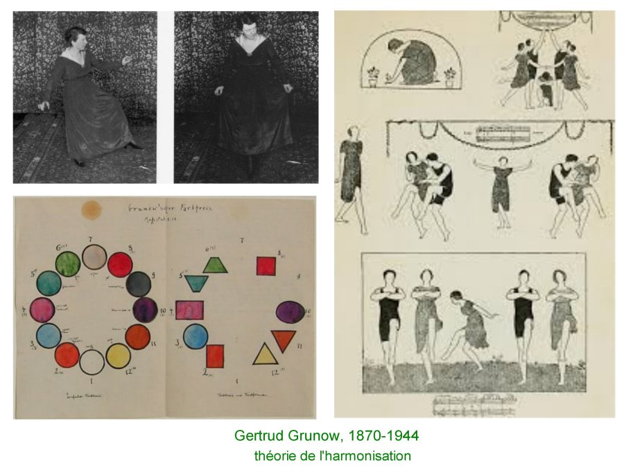 Gertrud Grunow, venant de la hrande tradition de la danse, inaugure des pas, attitudes et notations nouvelles, en s’appuyant sur le langage inaugural du Bauhaus, cercles, triangles et carrés et couleurs primaires.