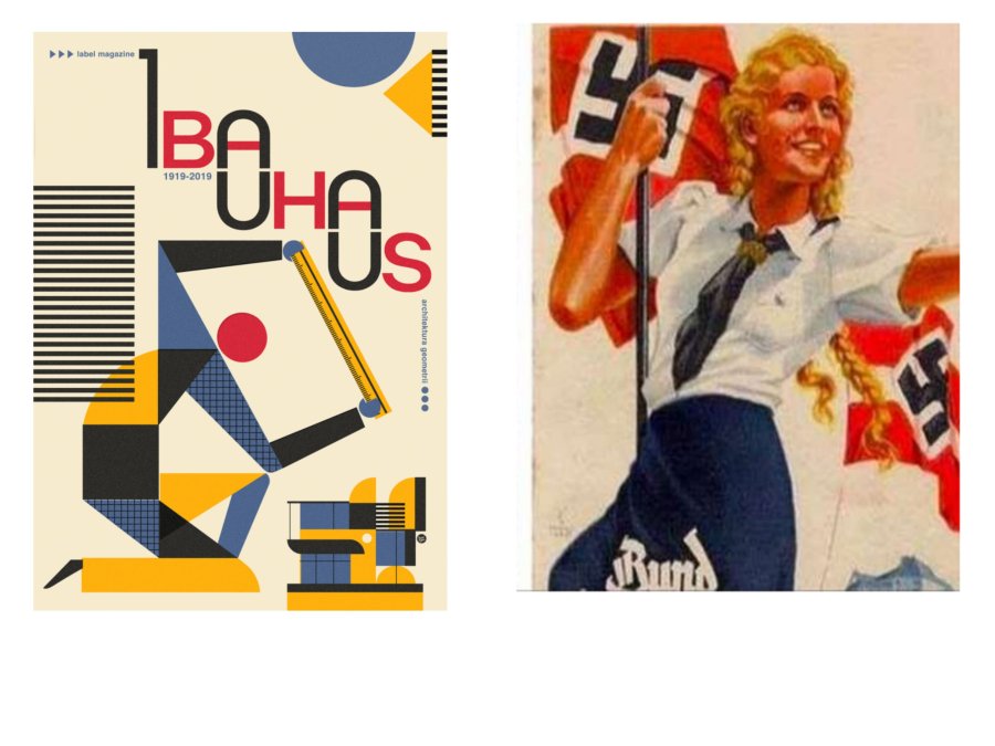 Il suffit de comparer des affiches contemporaines, des Nazis et du Bauhaus pour voir l’abyme qui sépare ces composantes de l’ allemangne de l’entre 2 guerres. Le conservatisme radicalement réactionnaire, genré et raciste des nazis est le contrepoint exact des la modernité et de l’internationalisme ouvert du Bauhaus.