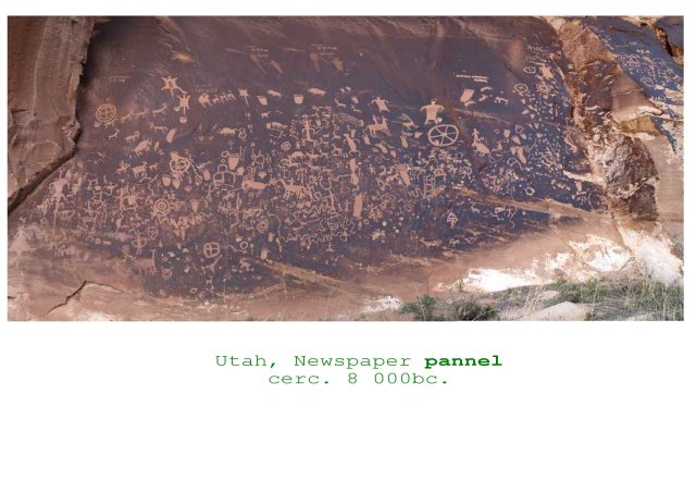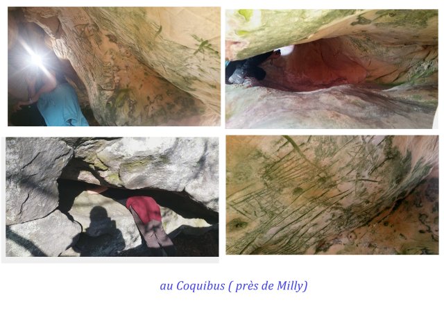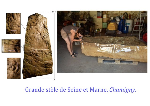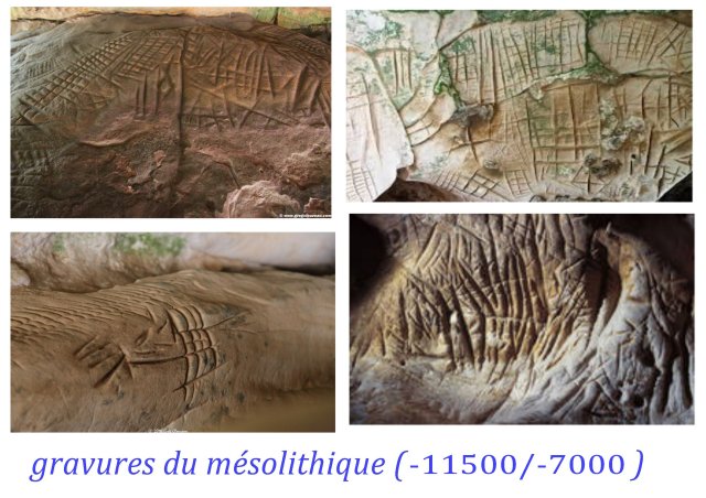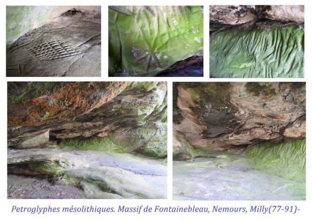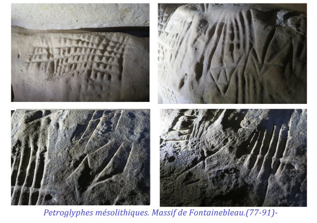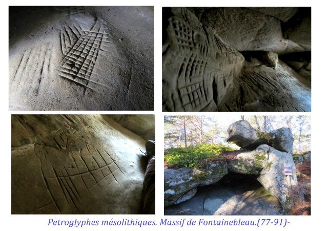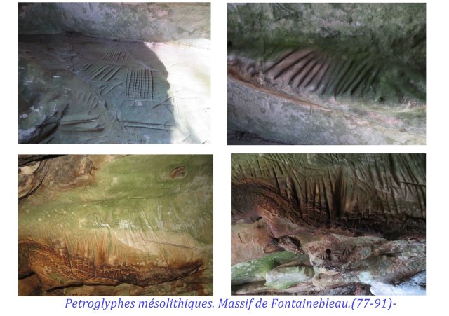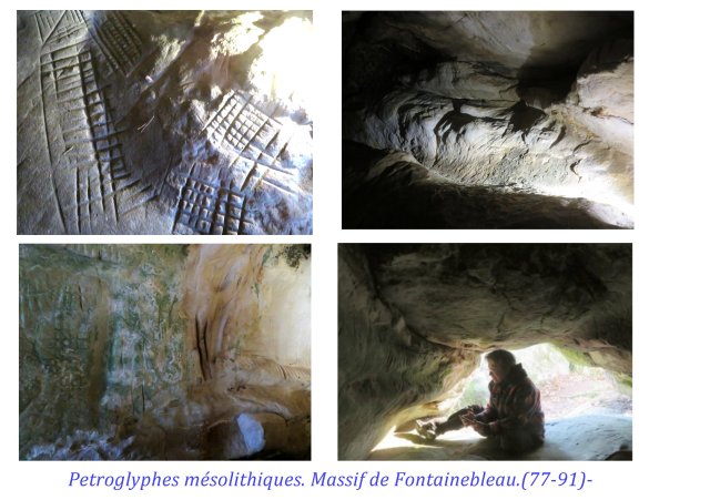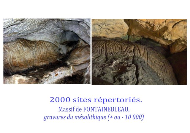 Cette galerie se termine par des documents récents, relatifs aux gravures du massif de Fontainebleau. Les plus anciennes, stries régulières, sont datées de cette période du mésolithique, les plus récentes, du néolithique ( grandes stèles anthropomorphes et palettes gravées de motifs humanoïdes et animaliers, notamment des cerfs.