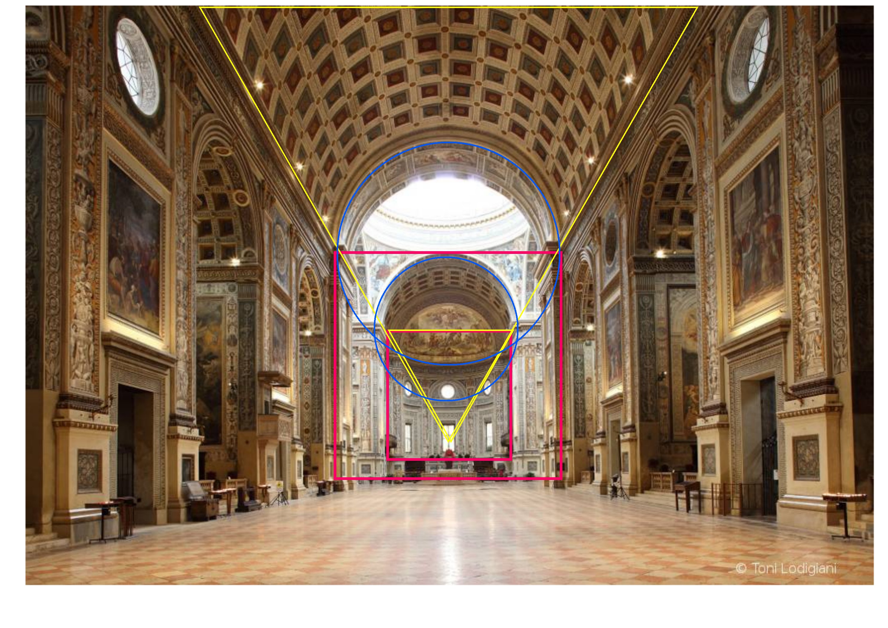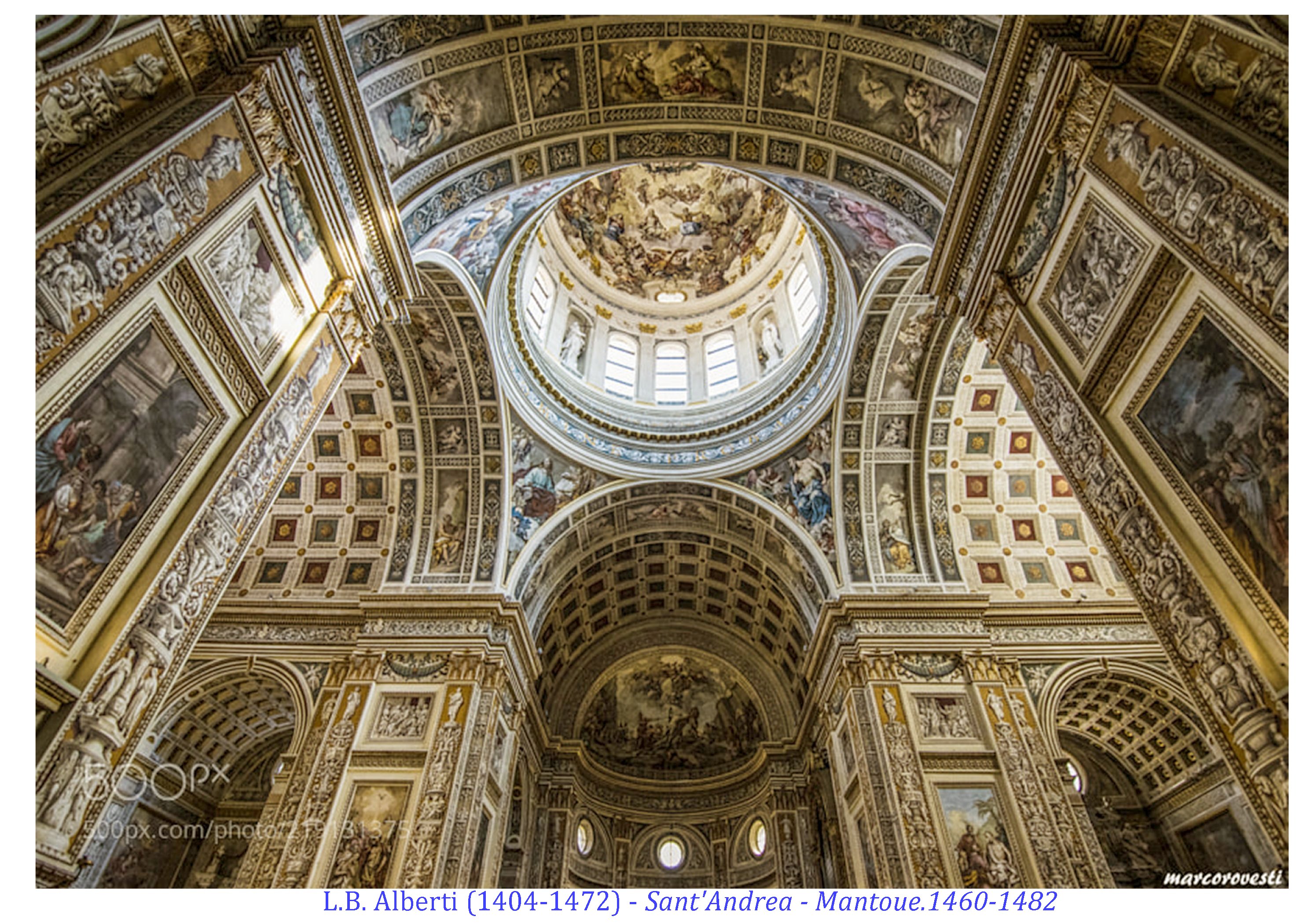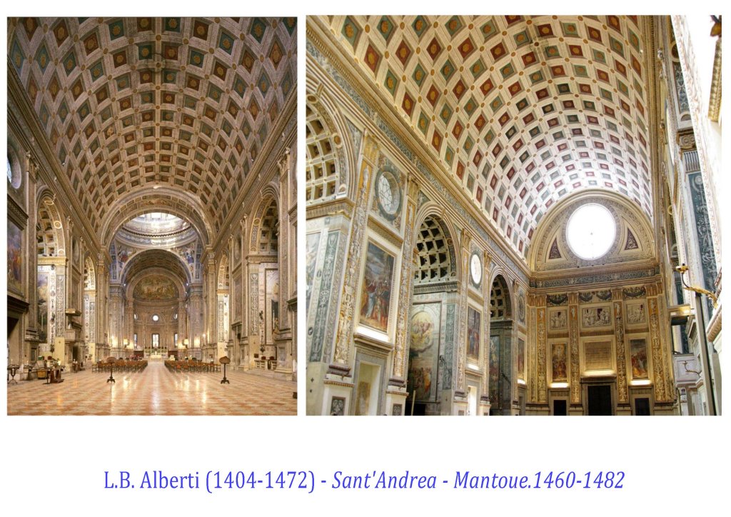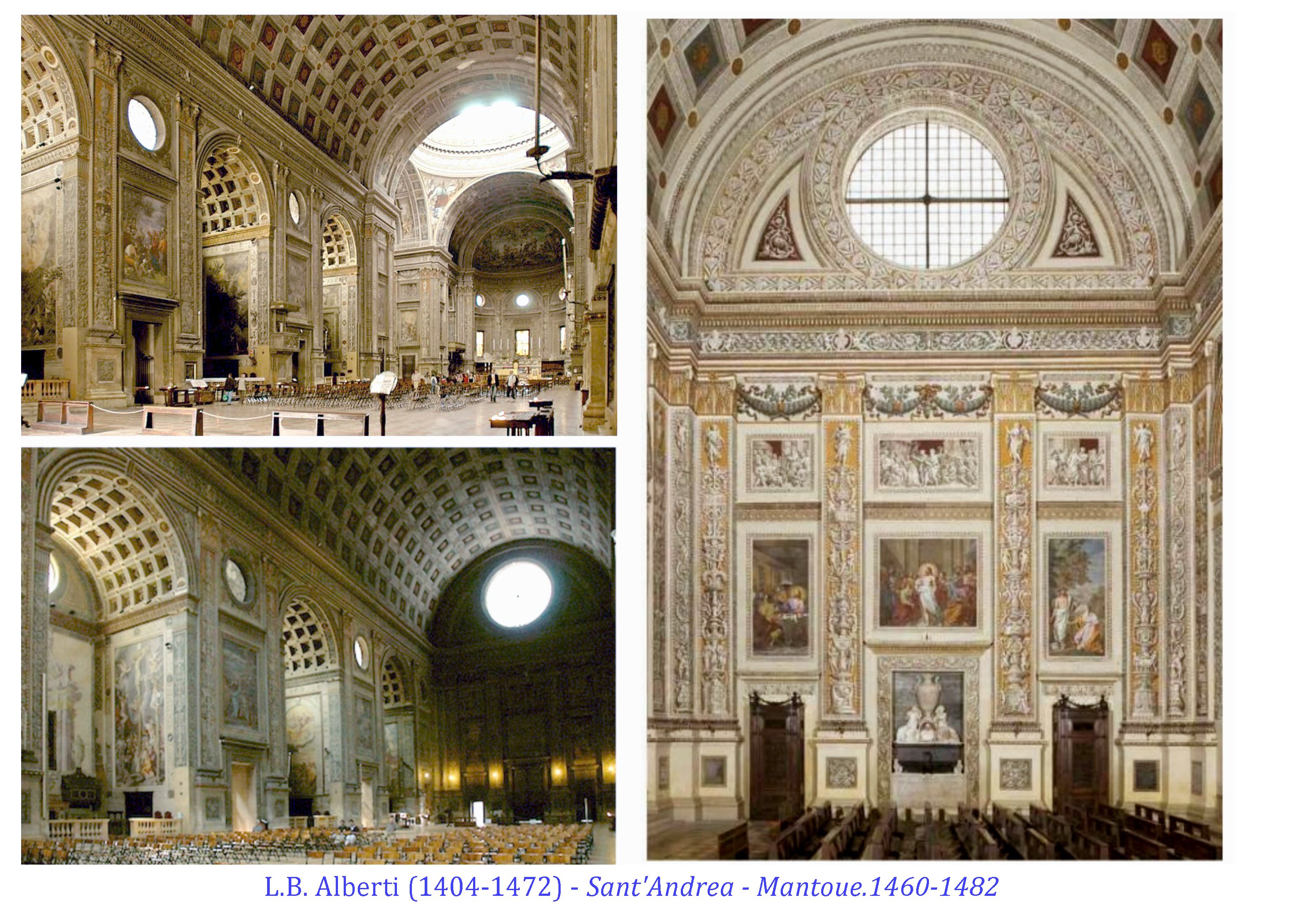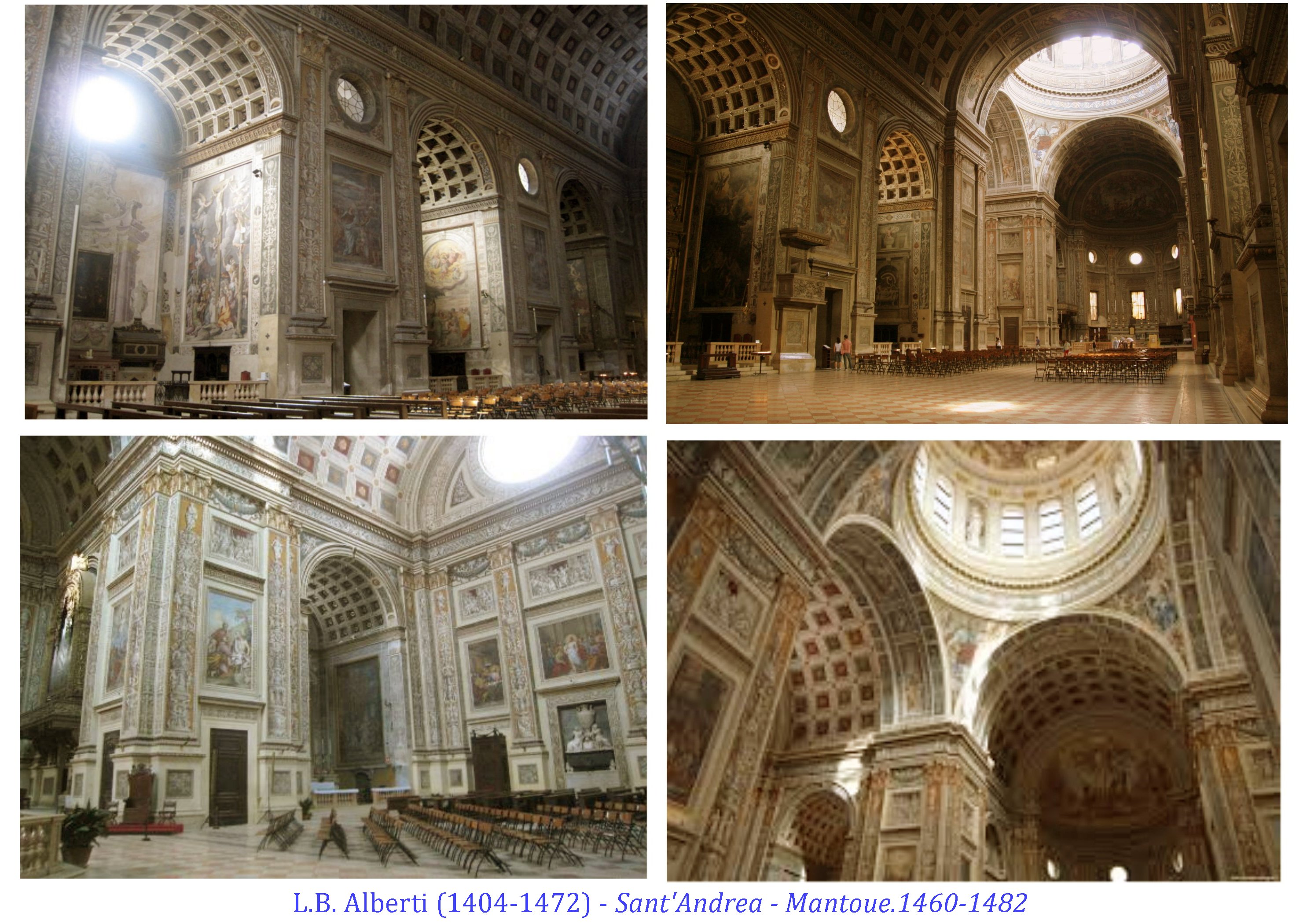 L’Église Sant’ Andrea est l’aboutissement de cette théorie et sert de repère à de nombreux architectes. Cette architecture met en scène la perspective, par ses lignes de fuites, le cadrillages des plafonds en caisson, les formes claires des voûtes en berceau et des arcs plein- ceintre.