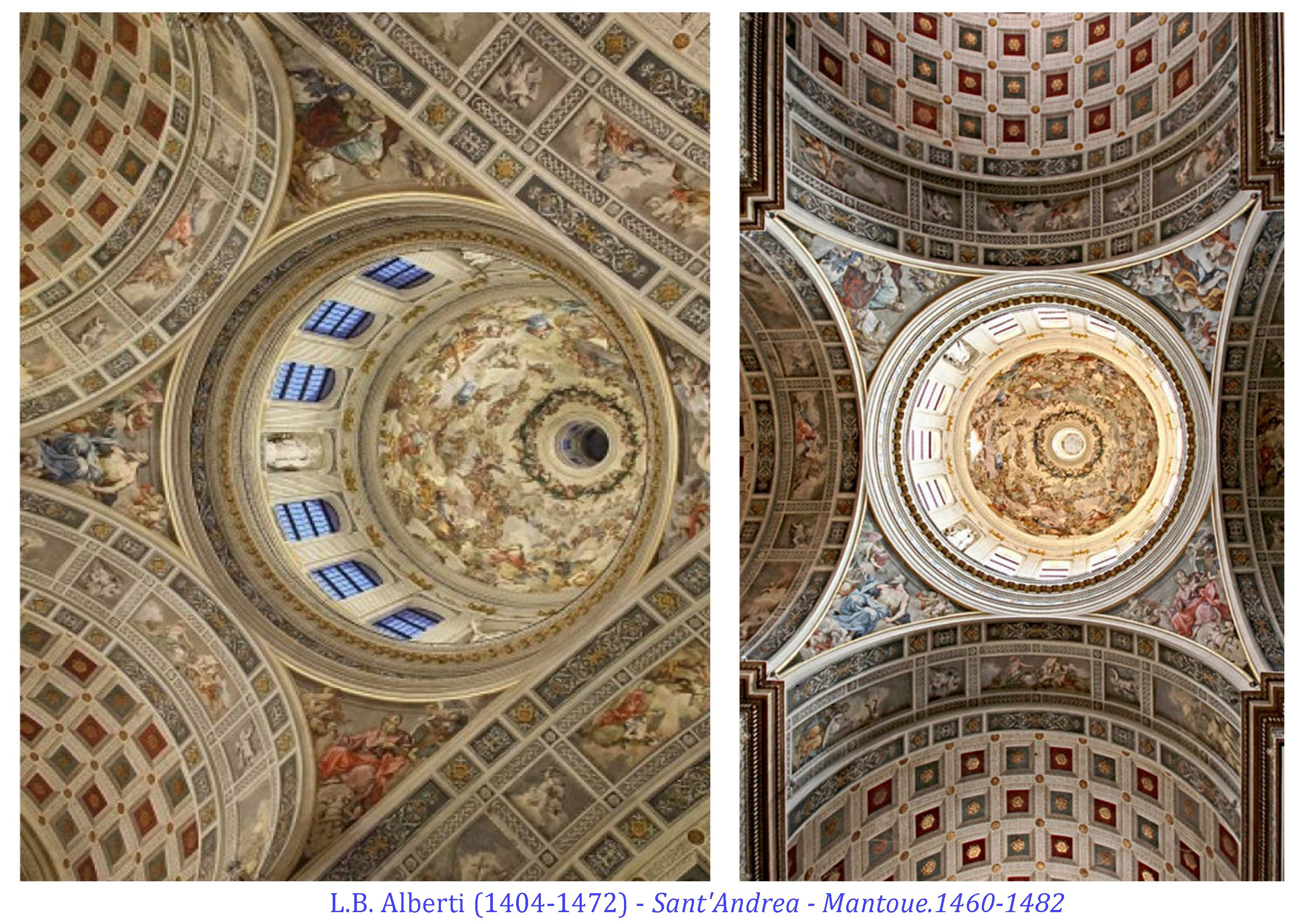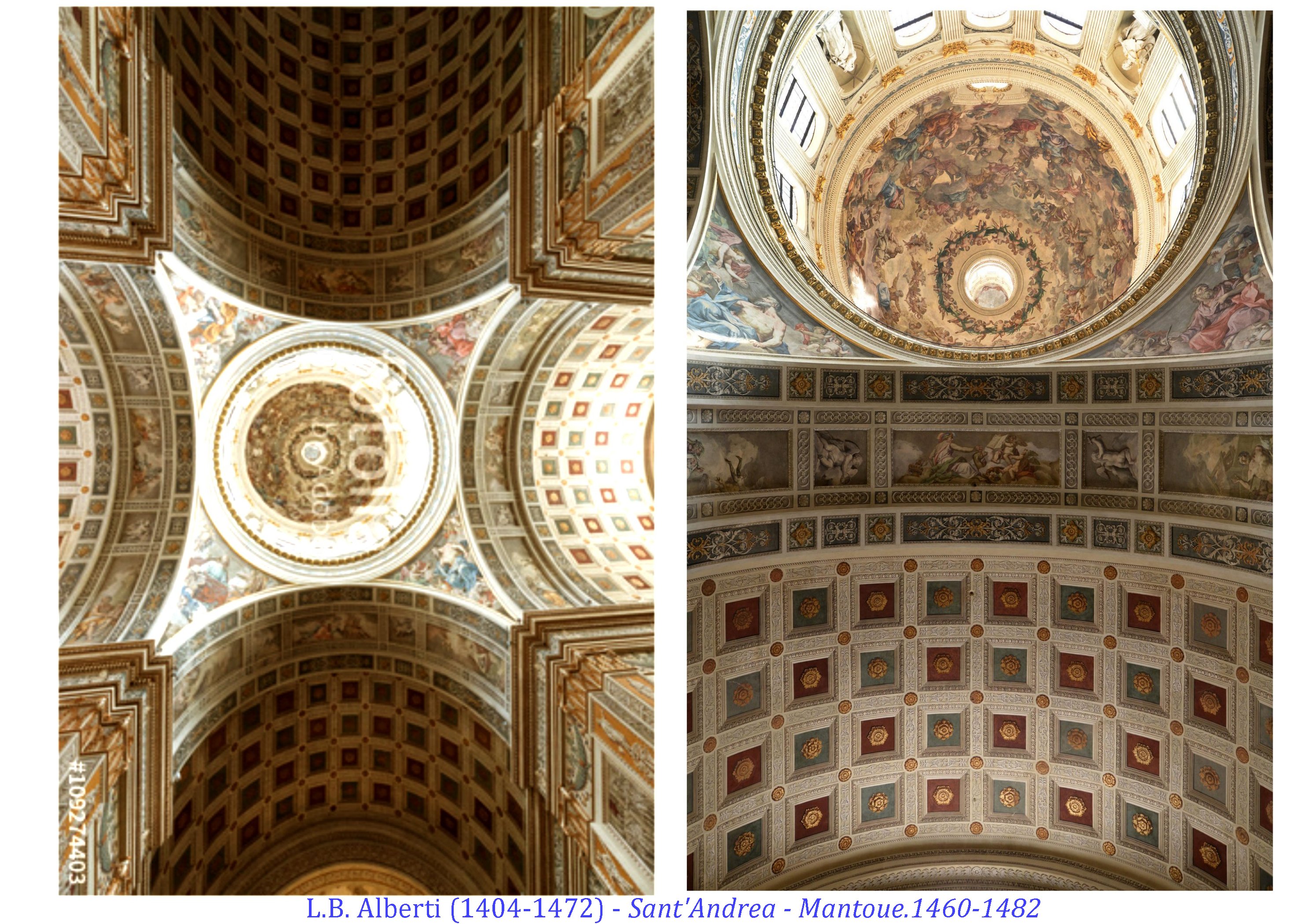 On remarquera la similitude des bas -ôtés de la basilique de Constantin à Rome avec les chapelles latérales de Sant ‘Andrea ; de même la technique de voûte à caissons, qui est aussi utilisée pour la coupole de Sta Maria Del Fiore par Brunelleschi.