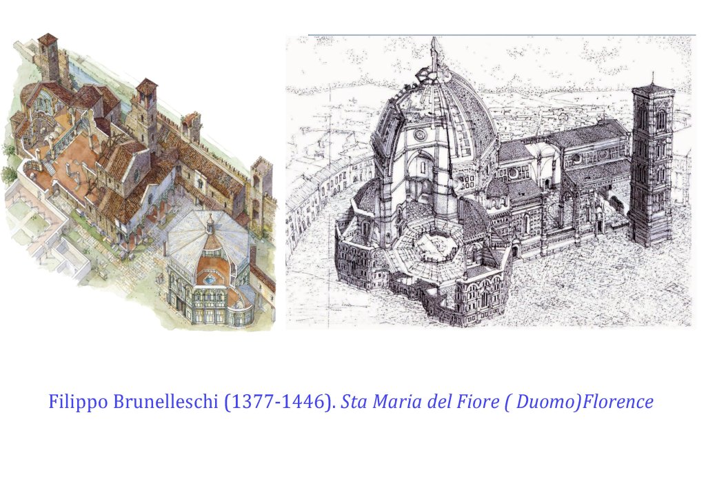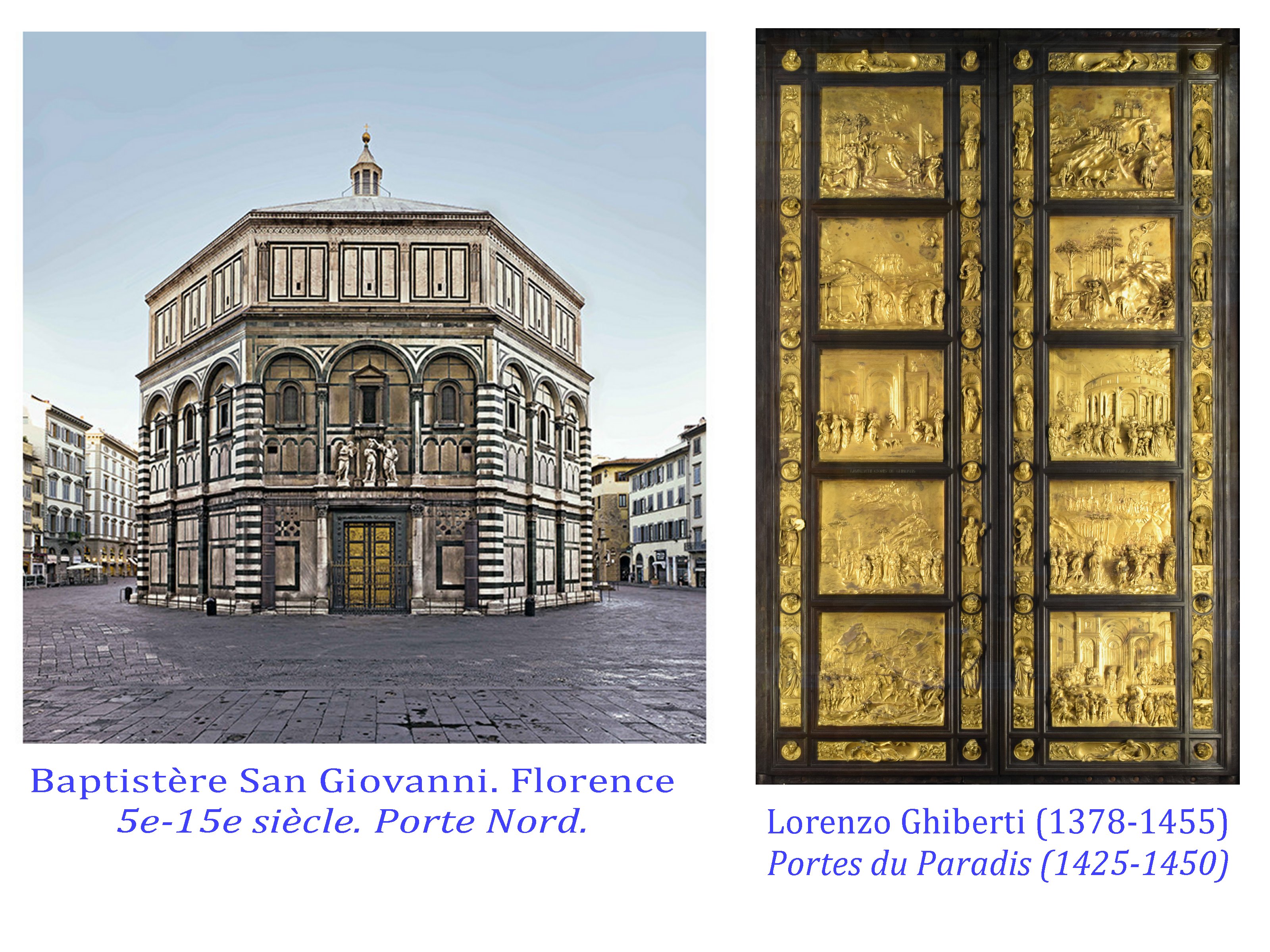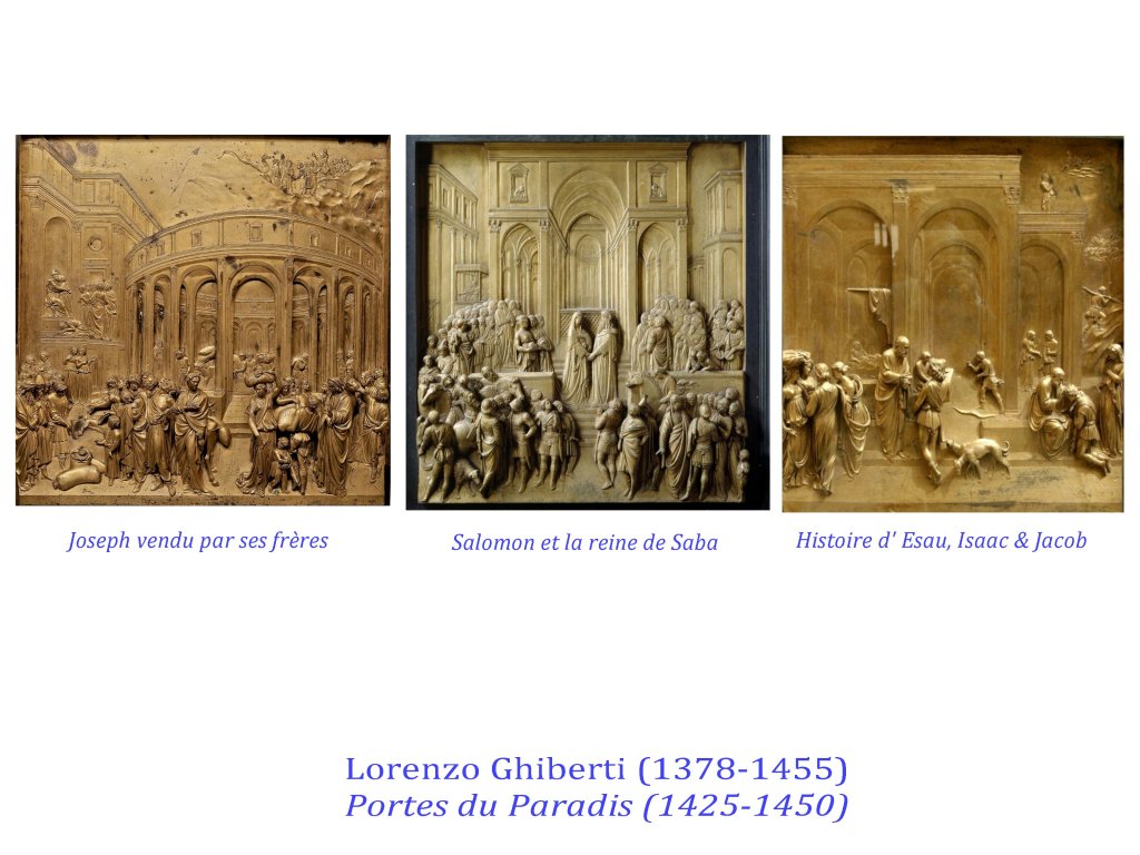 On trouve chez Alberti, la volonté de scénographier l’architecture. Chez ses contemporains ( et même prédécesseurs) Donatello et Ghiberti, comme Brunelleschi, on constate le même souci d’intégrer perspective et architecture, jusque dans les fameux bas-reliefs du Baptistère St Jean de Florence, comme sur d’autres bas reliefs ( San Lorenzo de Donatello).