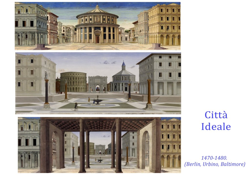 Nous voyons aussi comment la perspective devient un moyen de concevoir l’utopie et le futur, de se projeter dans l’espace et le futur, avec Leonard de Vinci, mais avant par les auteurs des fameux panneaux de « cités idéales ».