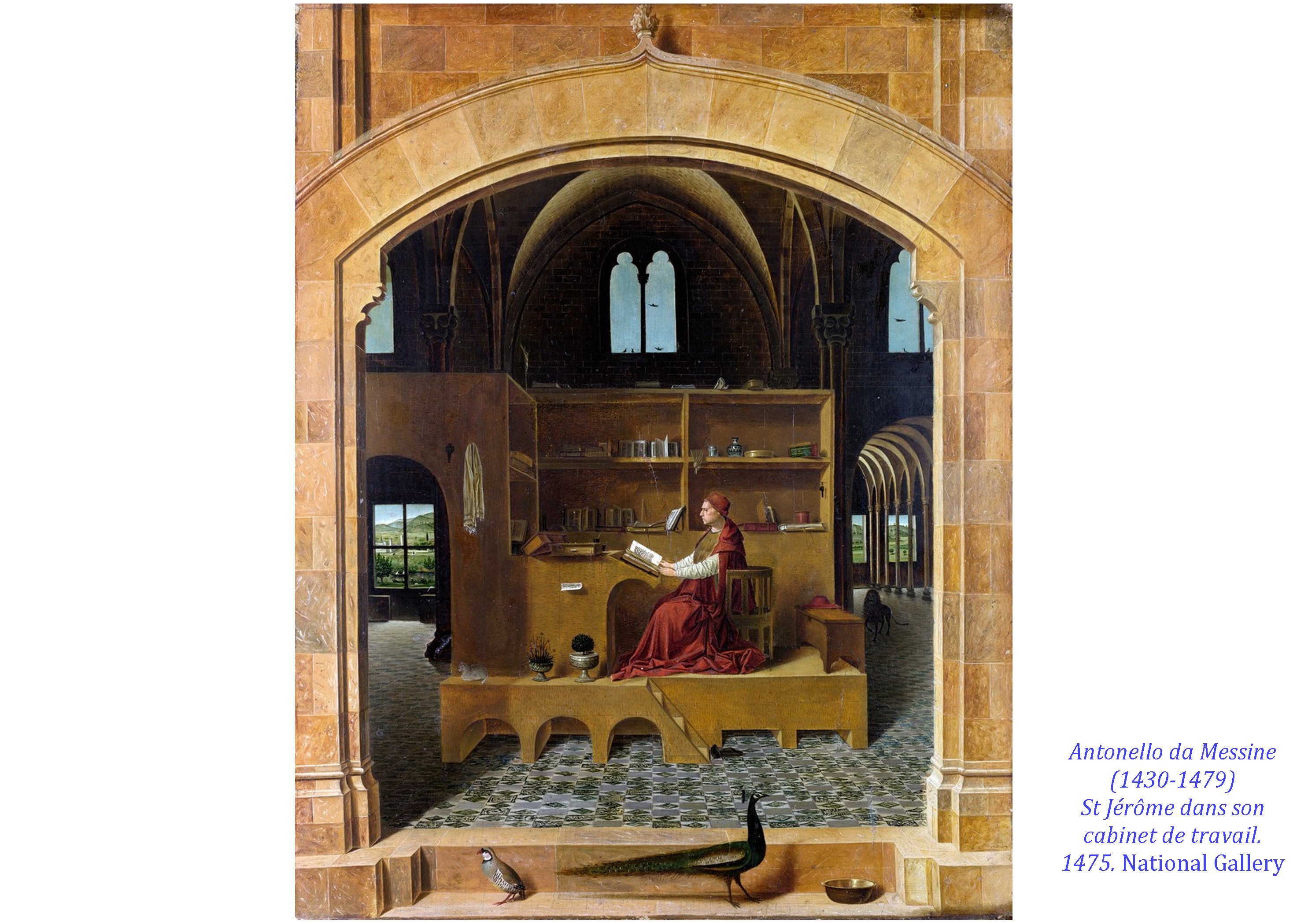 Le cycle de la scuola grande dei schiavoni est dédié à St Jérôme, traducteur de la bible en grec, cardinal puis ermite. Né en 347 et mort en 420. St Augustin ( 354-430) philosophe et chrétien converti, évêque d’ Hippone est son exact contemporain et rival théologique. Il est ici représenté cependant comme inspiré par Jérôme.