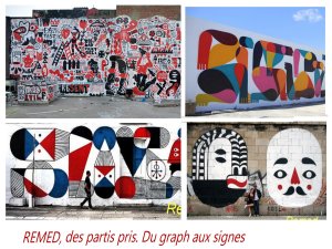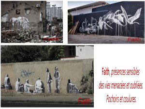 Terme très vaste, englobant les graffitis les plus simples tout comme les peintures murales décoratives ou politiques. Derrière la dénomination « street art », il y a aussi l’enjeu de la cité, de la ville, des lieux partagés..Une autre question se pose, quand à la nature des lieux investis, murs privés, quartiers patrimoniaux, friches industrielles, zones reléguées…