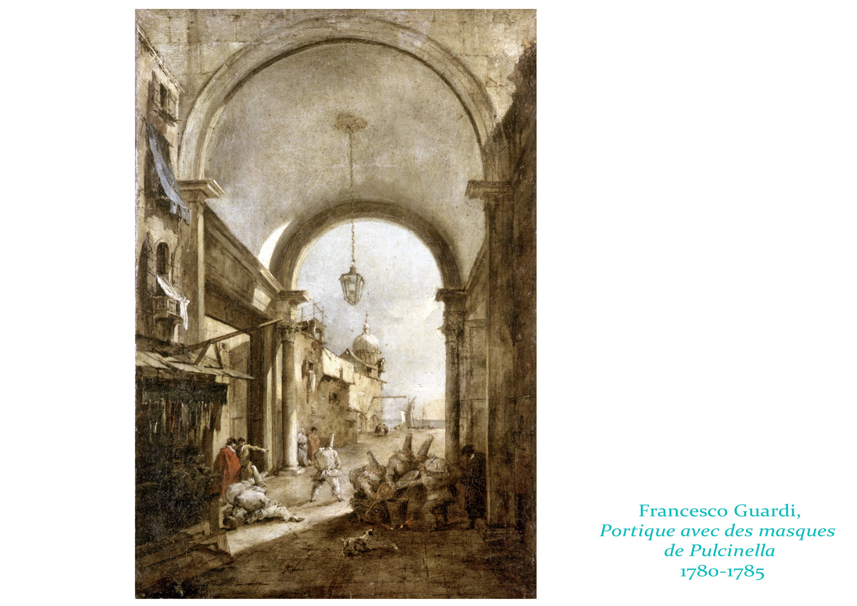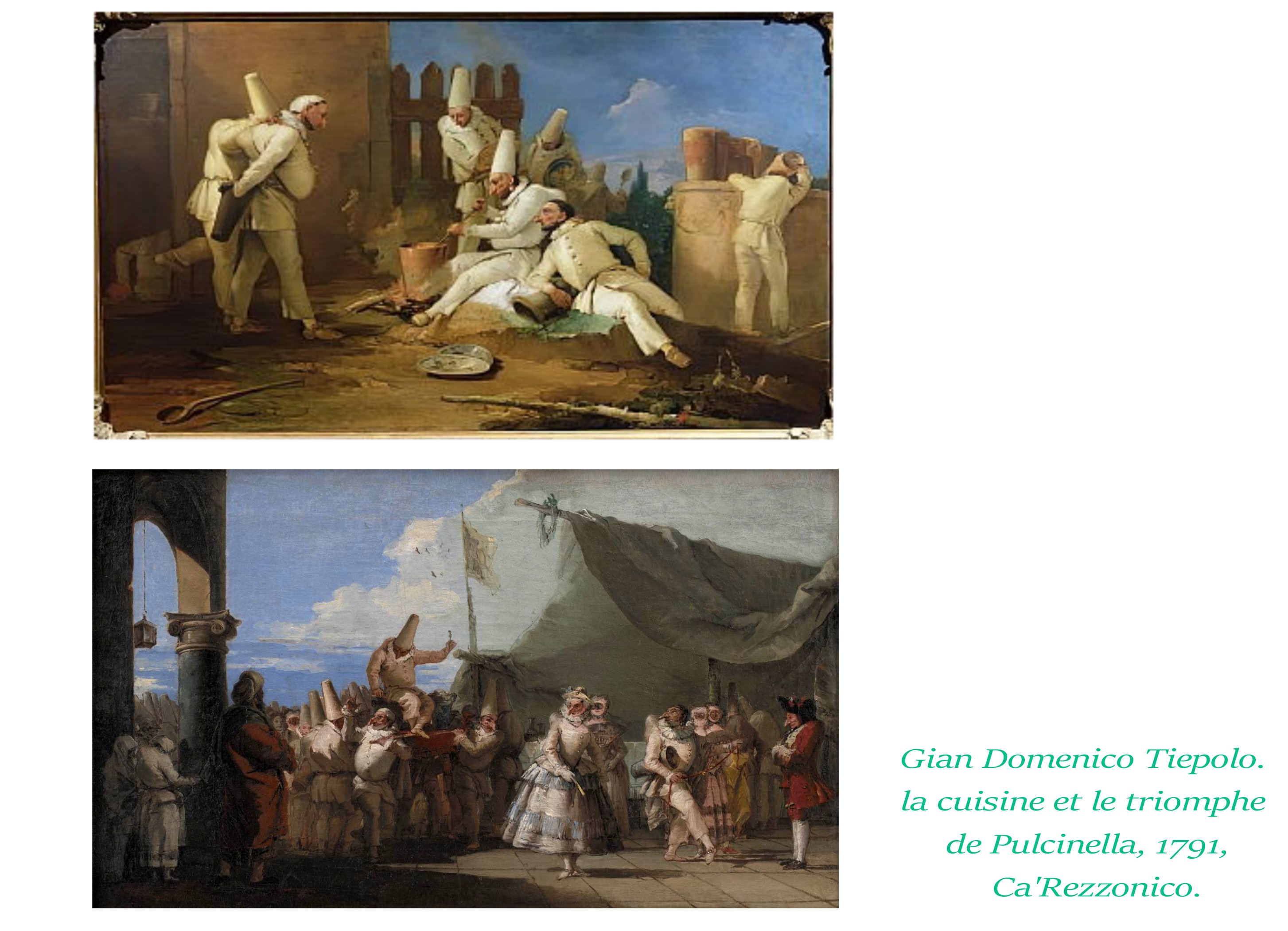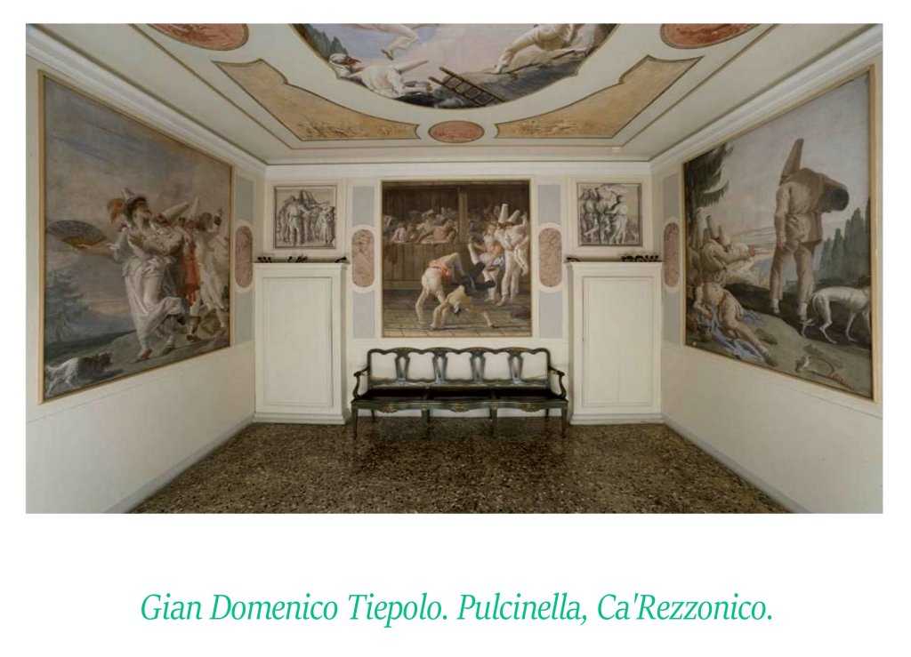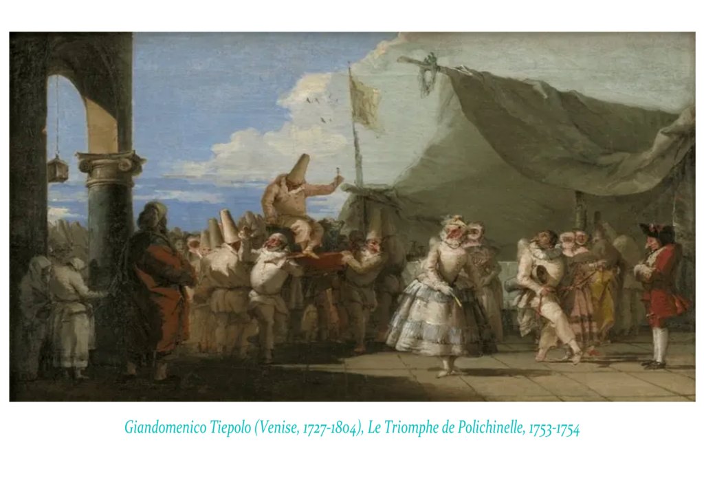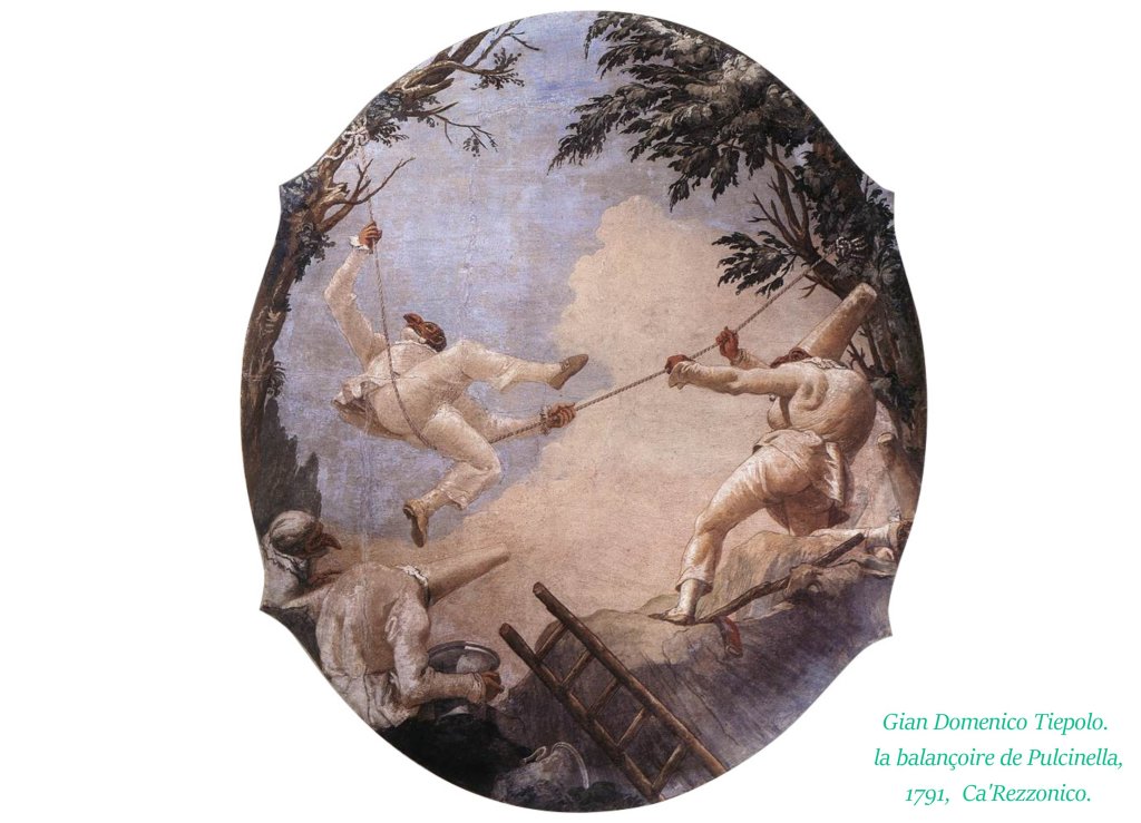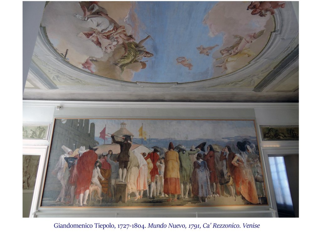 Cette fresque peinte dans sa résidence privée , près de Mestre, en Vénétie, fut réinstallée dans la Ca’Rezzonico, sur le grand canal, au début du 20e siècle. Ces personnages nous tournant le dos, tout comme les étranges peintures de Pulcinella témoignent d’un changement de modèles, de références et d’attentes, au tournant du siècle, qui pour Venise, la Sérénissime, sera fatal.