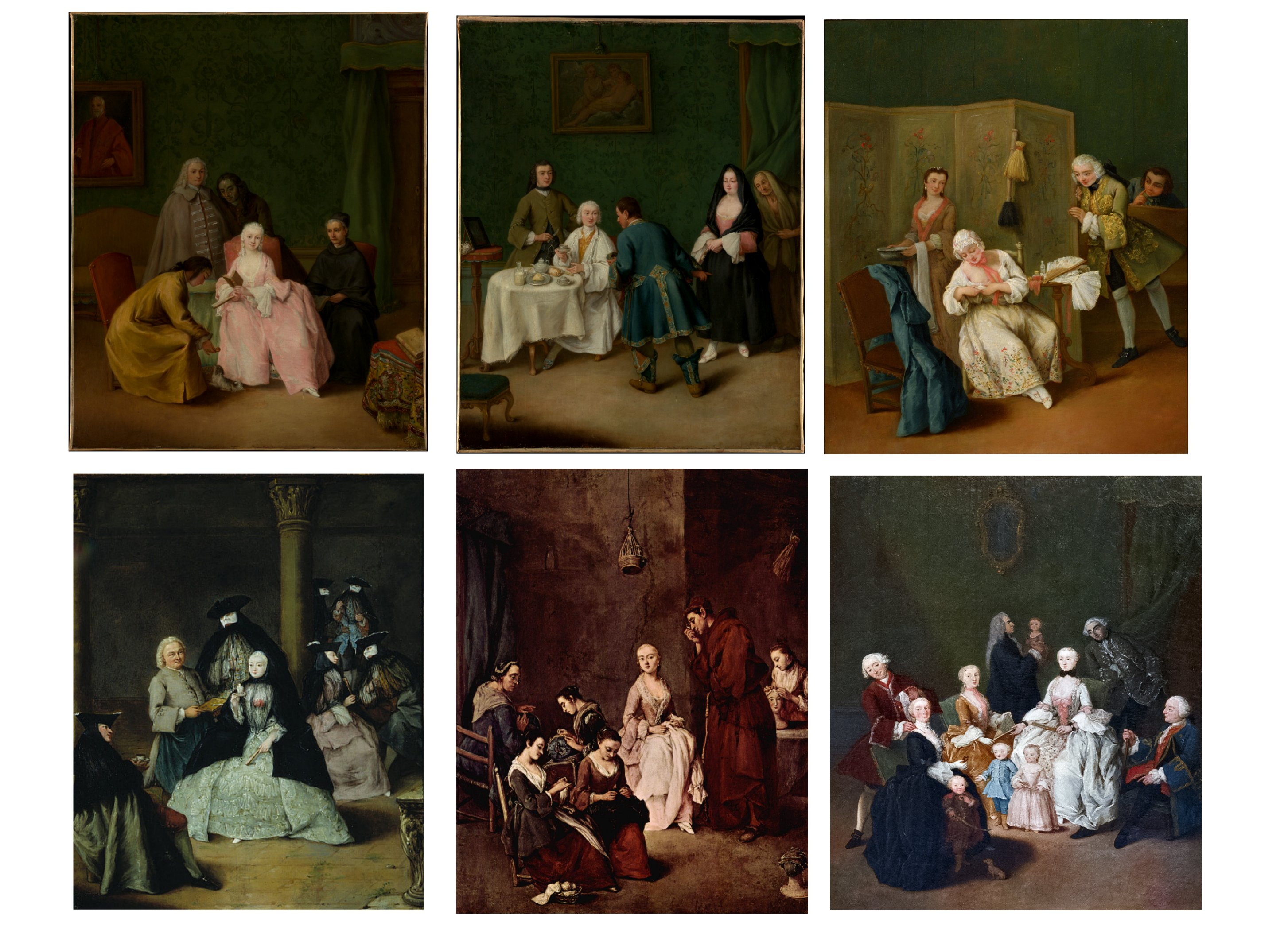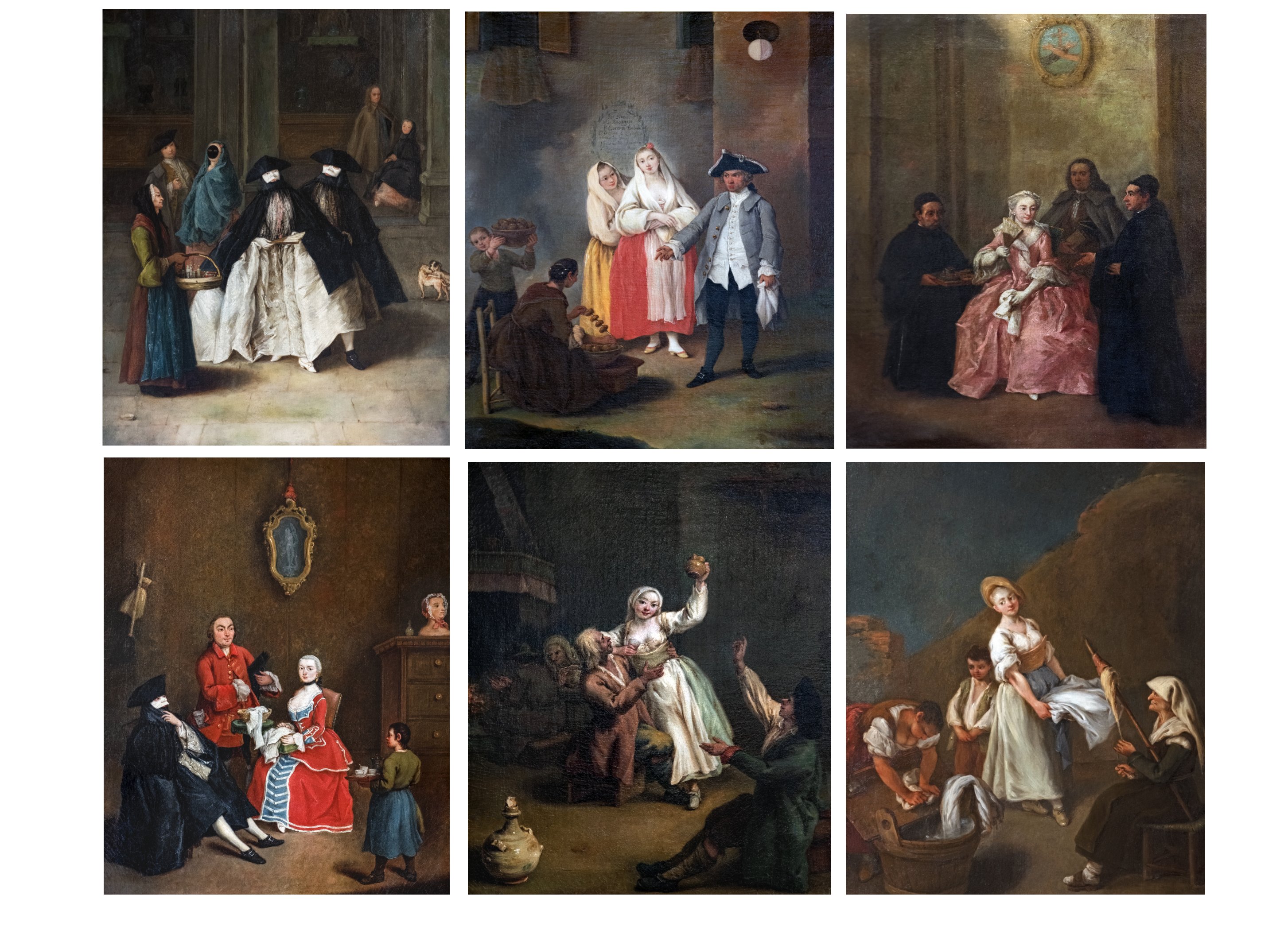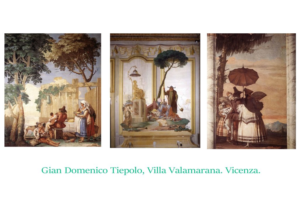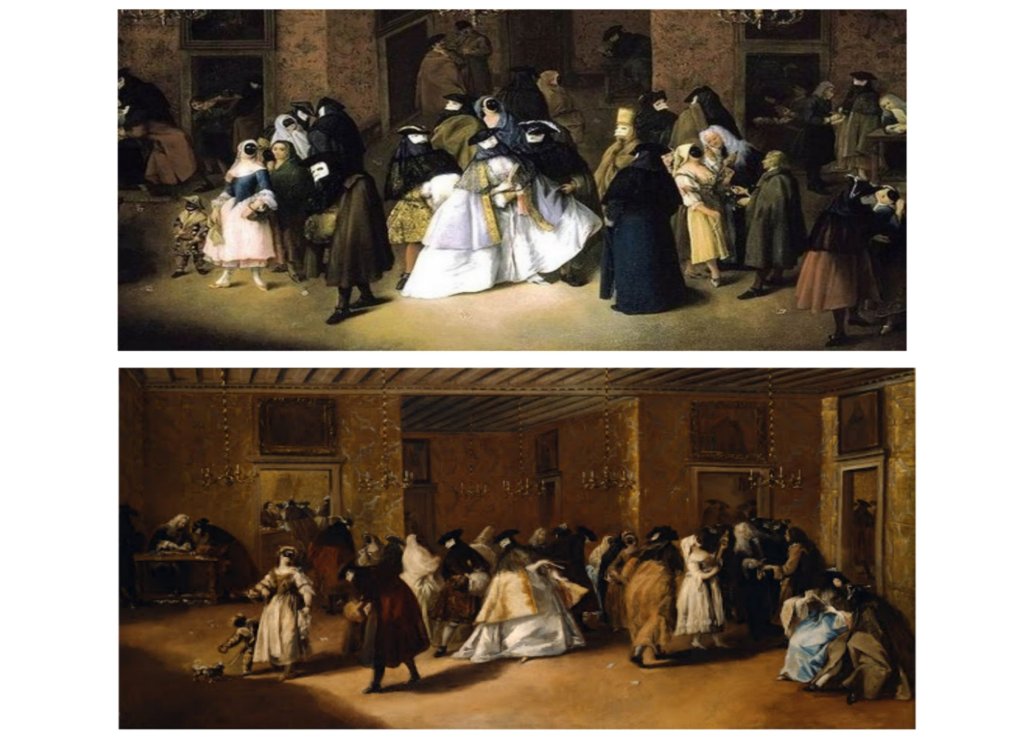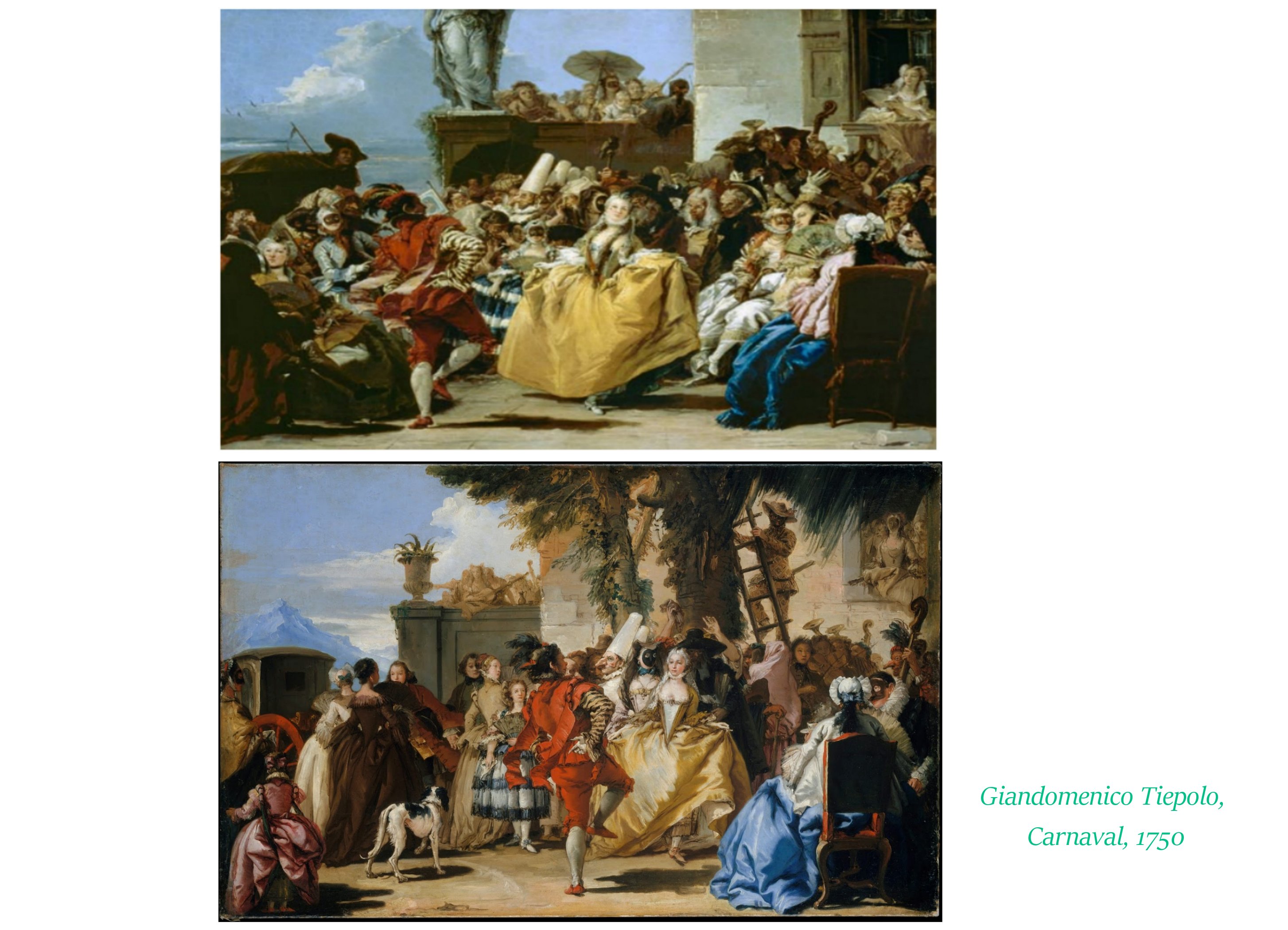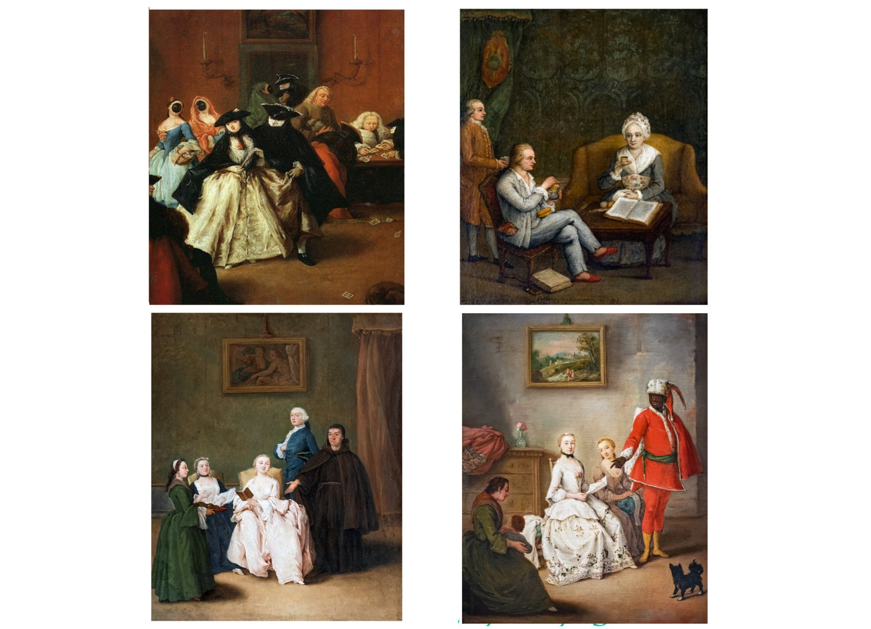 Cette fresque peinte dans sa résidence privée , près de Mestre, en Vénétie, fut réinstallée dans la Ca’Rezzonico, sur le grand canal, au début du 20e siècle. Ces personnages nous tournant le dos, tout comme les étranges peintures de Pulcinella témoignent d’un changement de modèles, de références et d’attentes, au tournant du siècle, qui pour Venise, la Sérénissime, sera fatal.