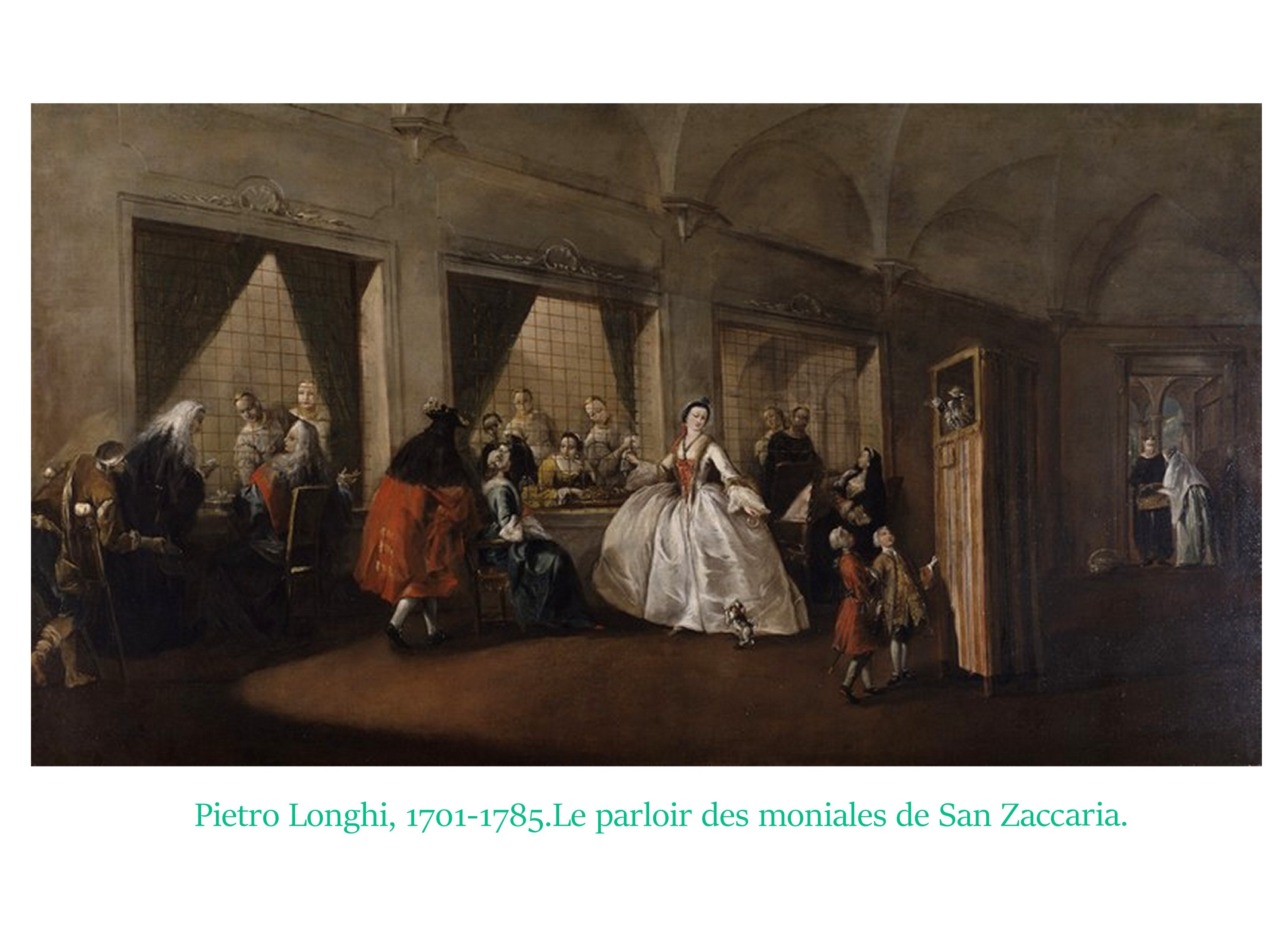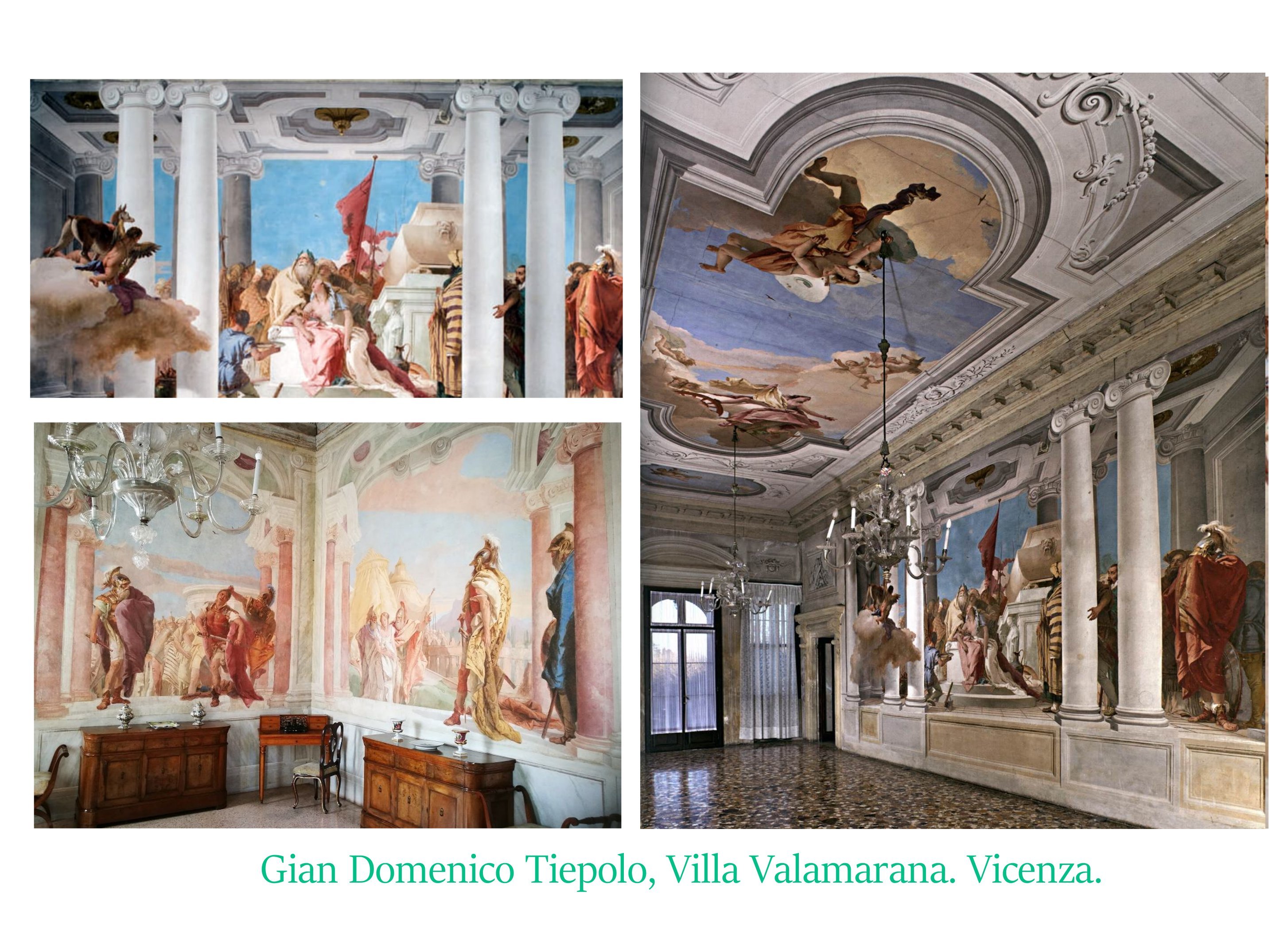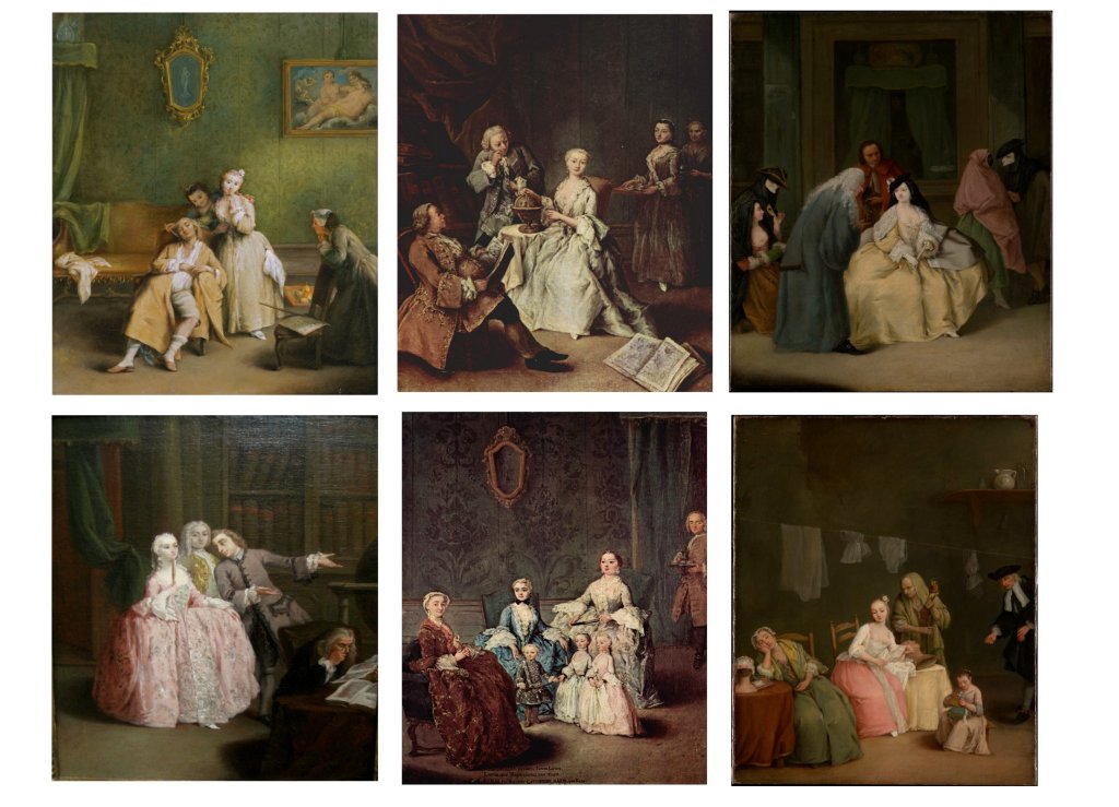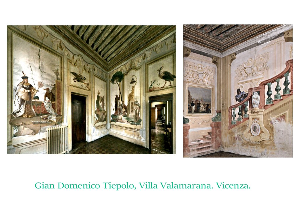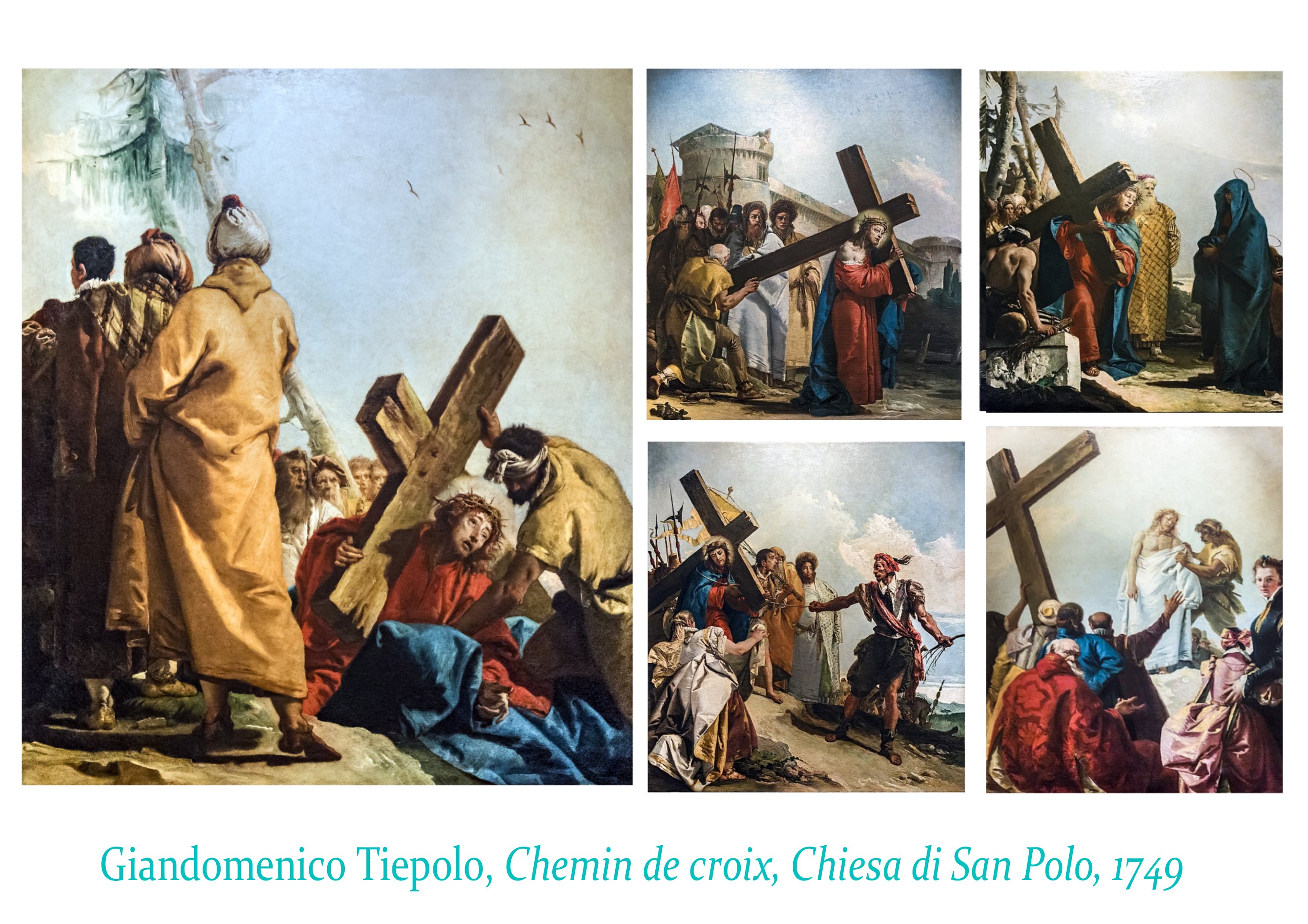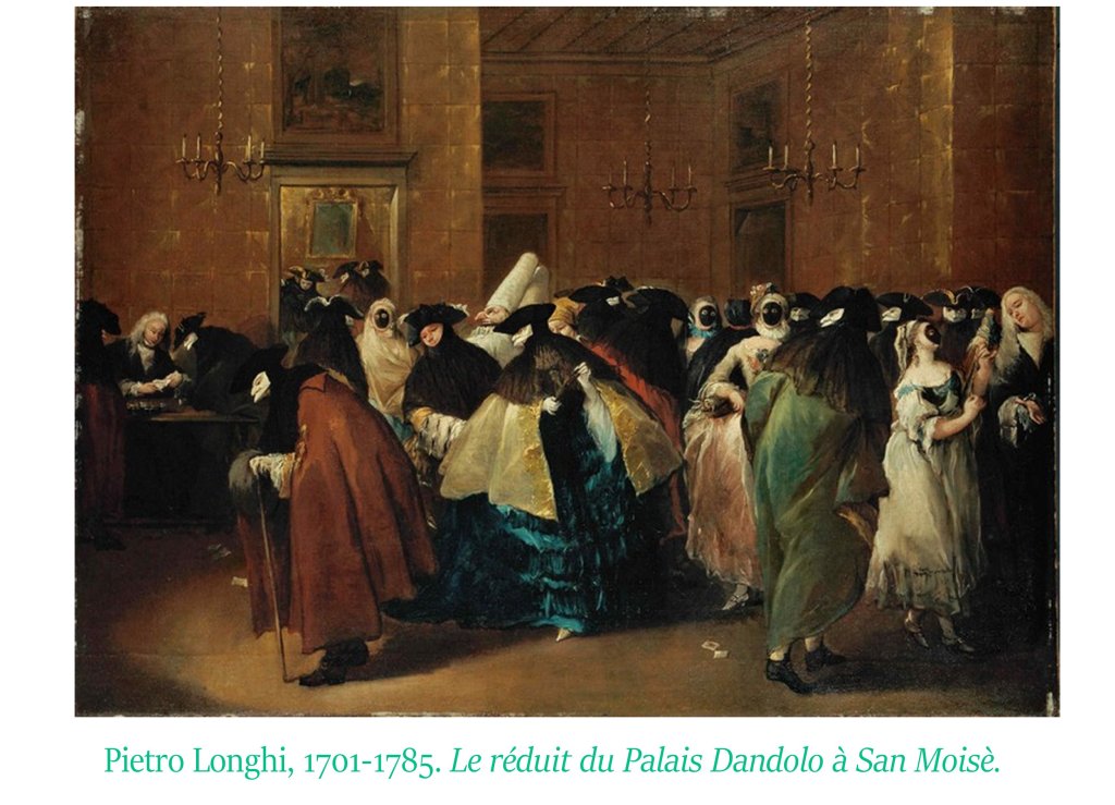 Cette fresque peinte dans sa résidence privée , près de Mestre, en Vénétie, fut réinstallée dans la Ca’Rezzonico, sur le grand canal, au début du 20e siècle. Ces personnages nous tournant le dos, tout comme les étranges peintures de Pulcinella témoignent d’un changement de modèles, de références et d’attentes, au tournant du siècle, qui pour Venise, la Sérénissime, sera fatal.