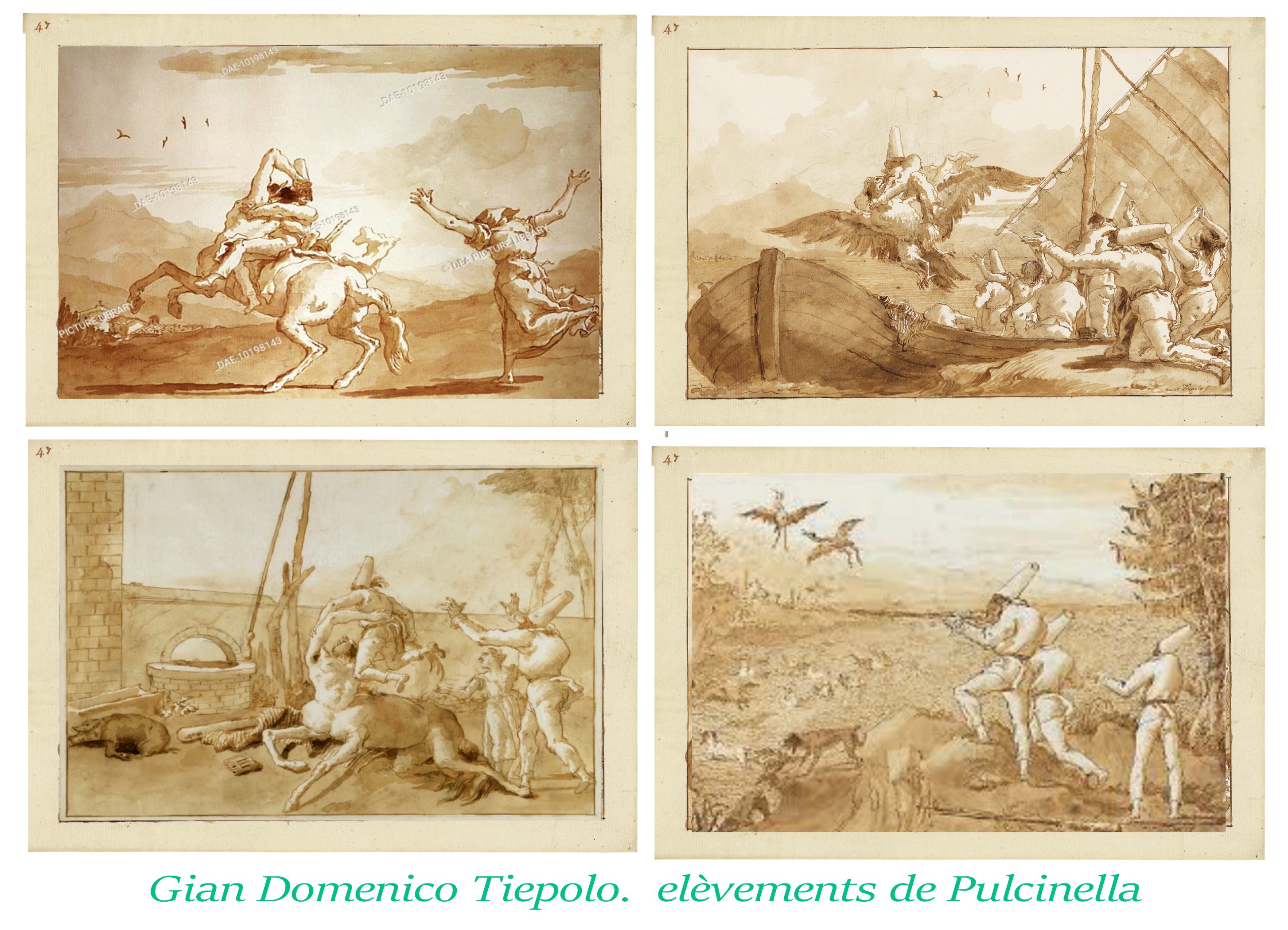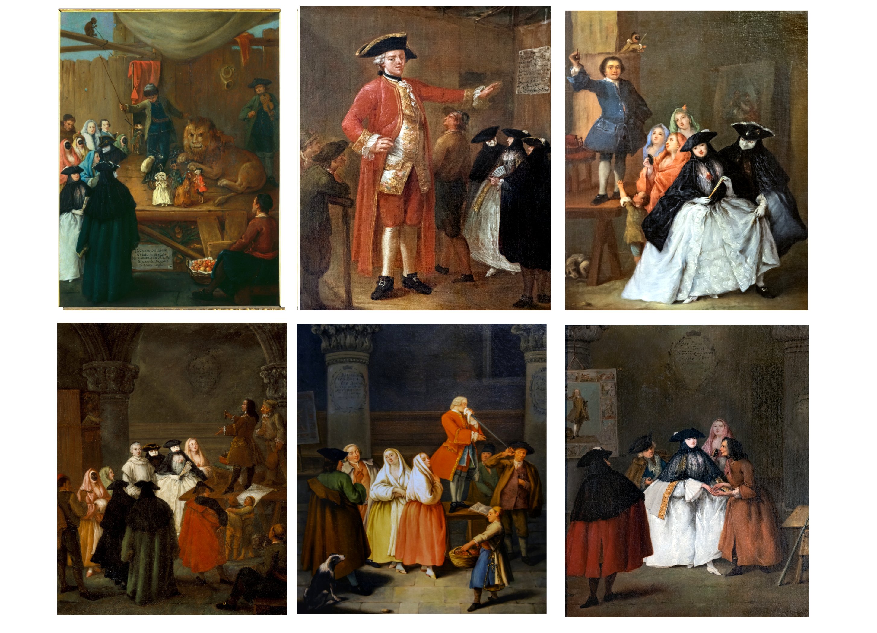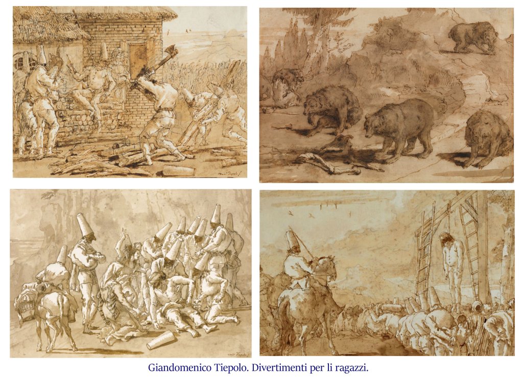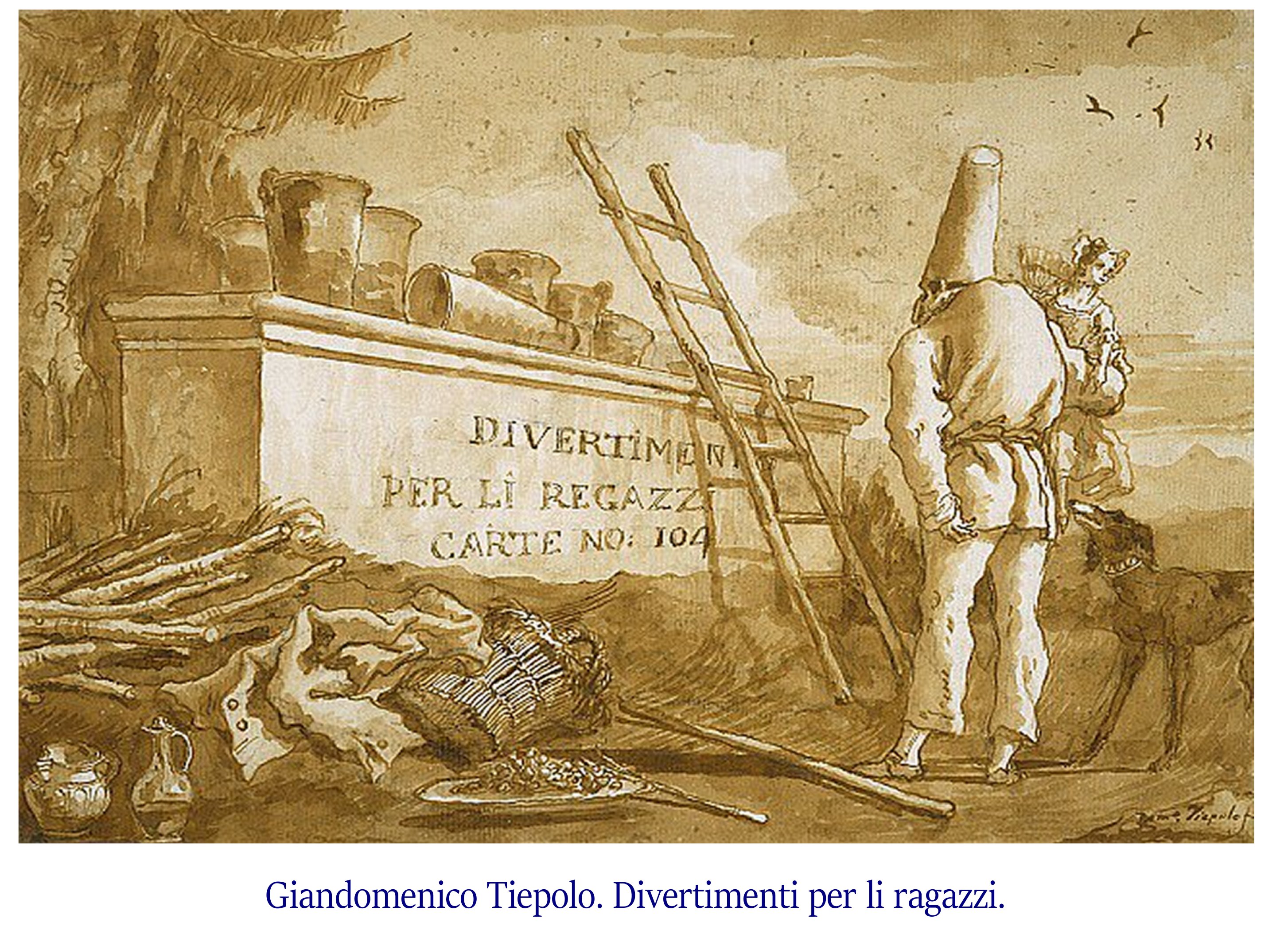 Tiepolo semble explorer pendant des années un thème récurrent, celui des « ragazzi », comme celui des Charlatans et bateleurs. D’un côté des bandes de jeunes hommes ( vieillissant parfois), incapables de revenir dans le monde réel, et perpétuant au delà du Carnaval, une connivence générationnelle, refusant de voir le monde, lui préférant de fait le spectacle ; ceci jusqu’à la mort des Polichinelles, leurs maladies etc.