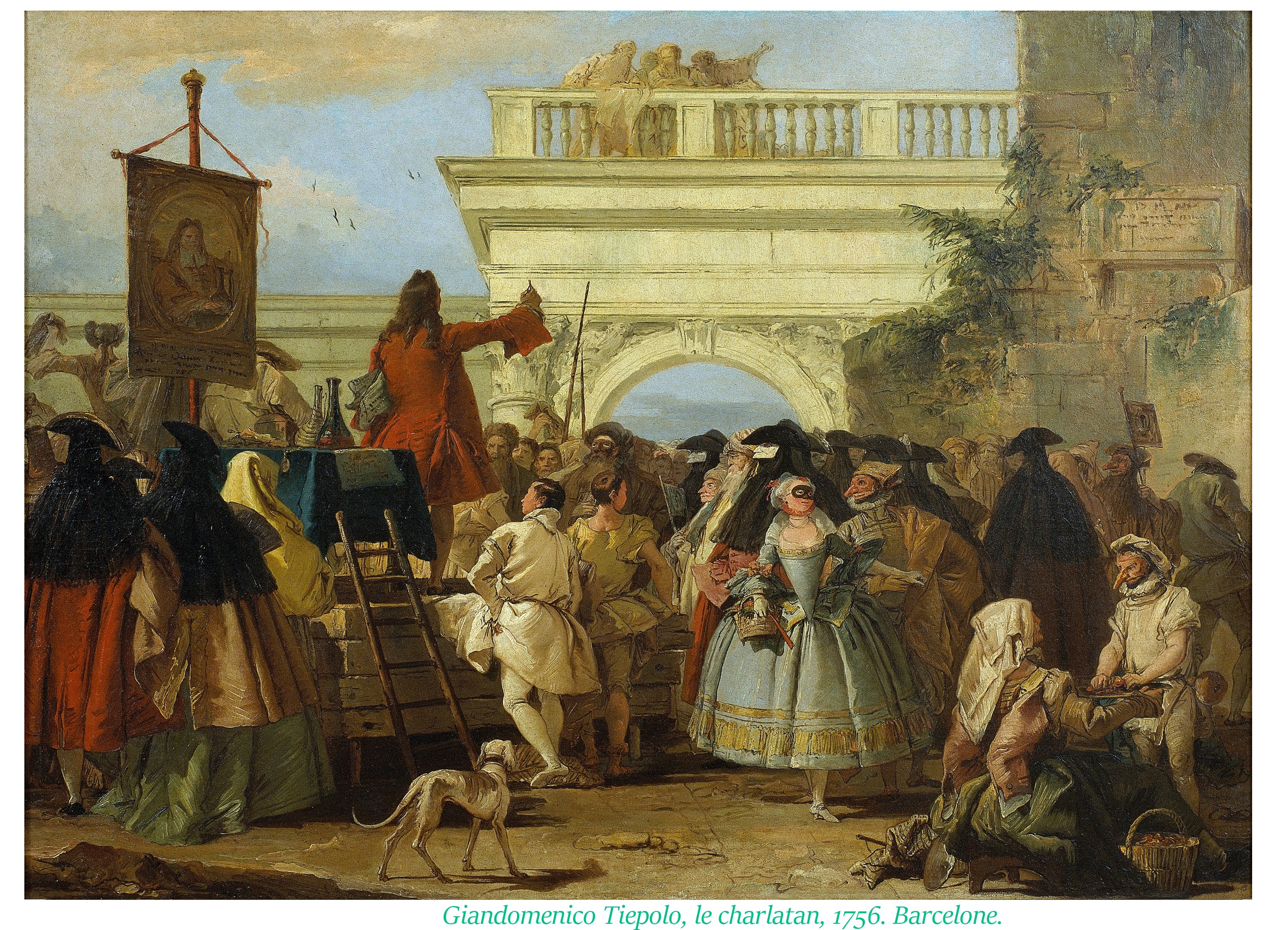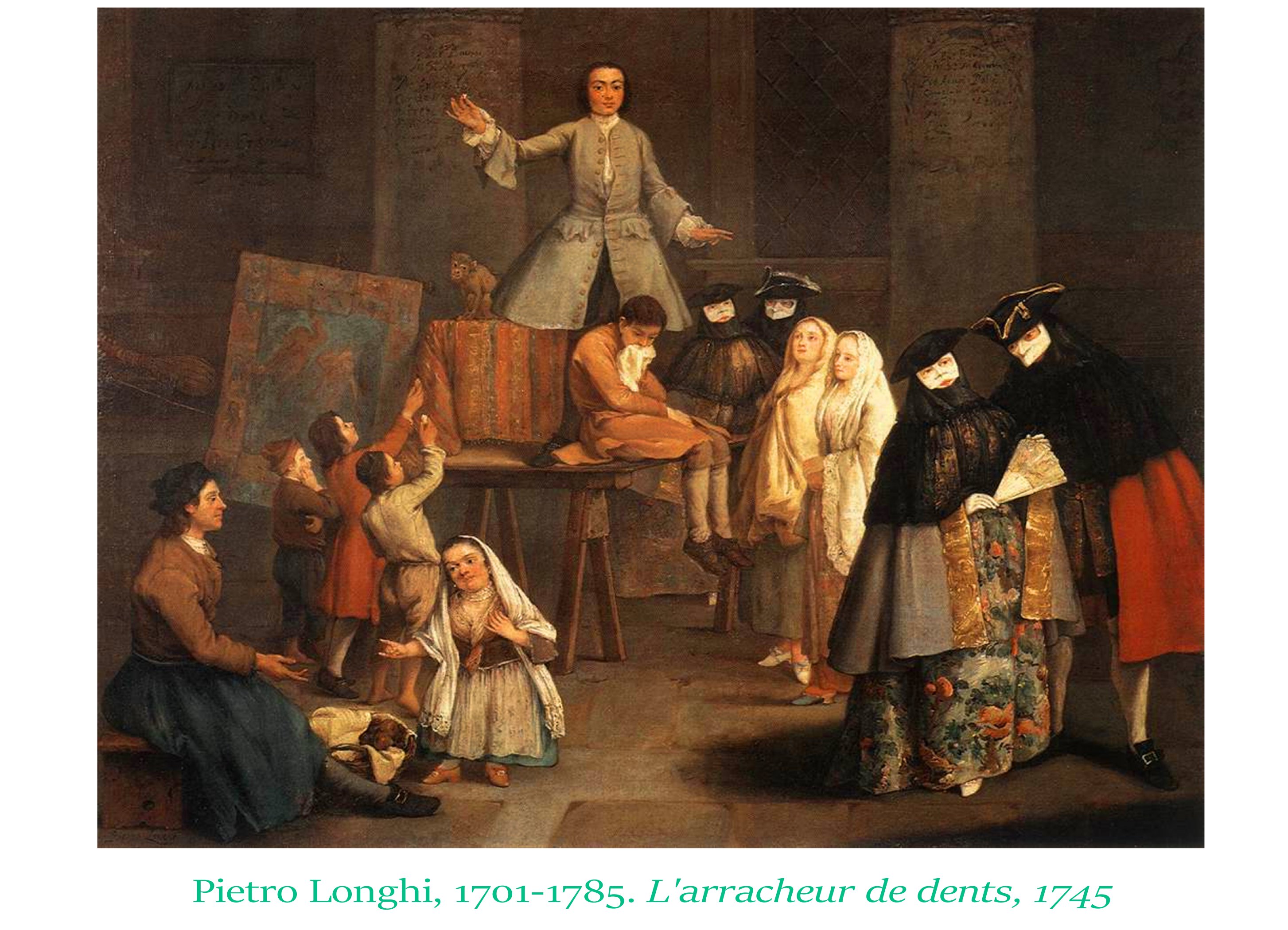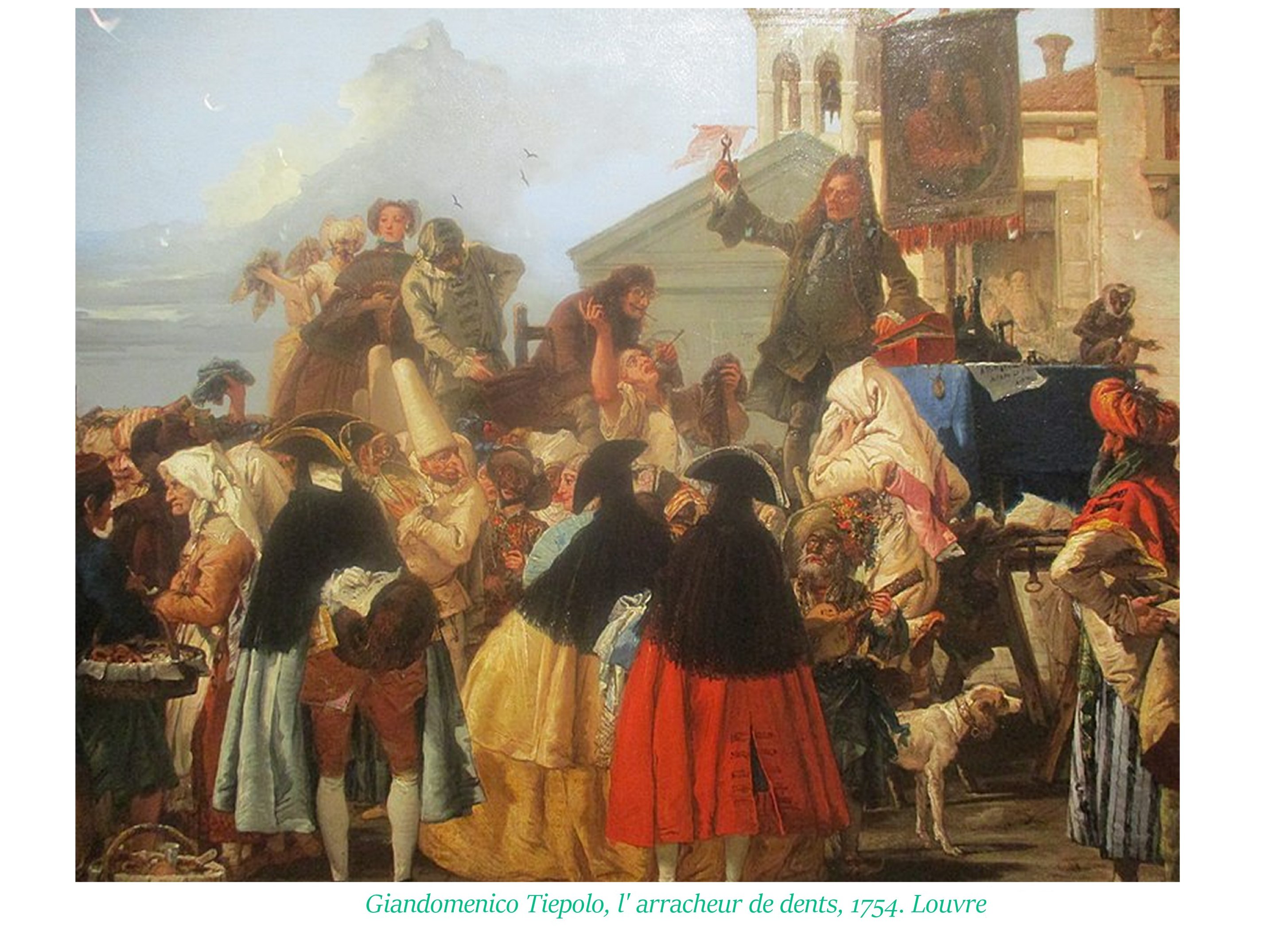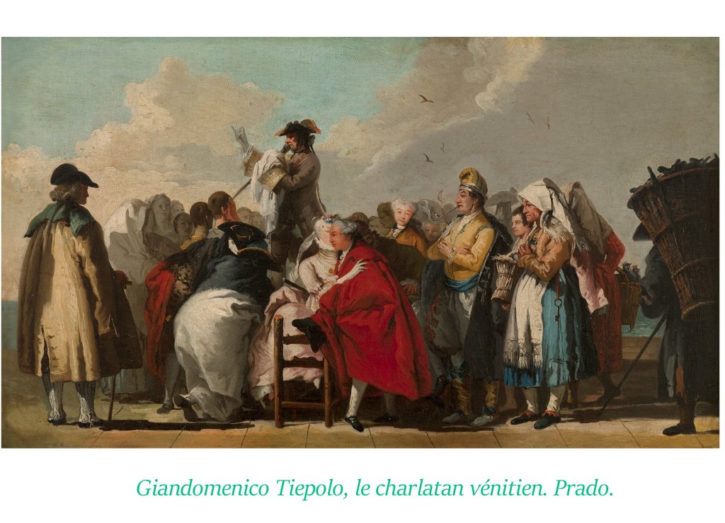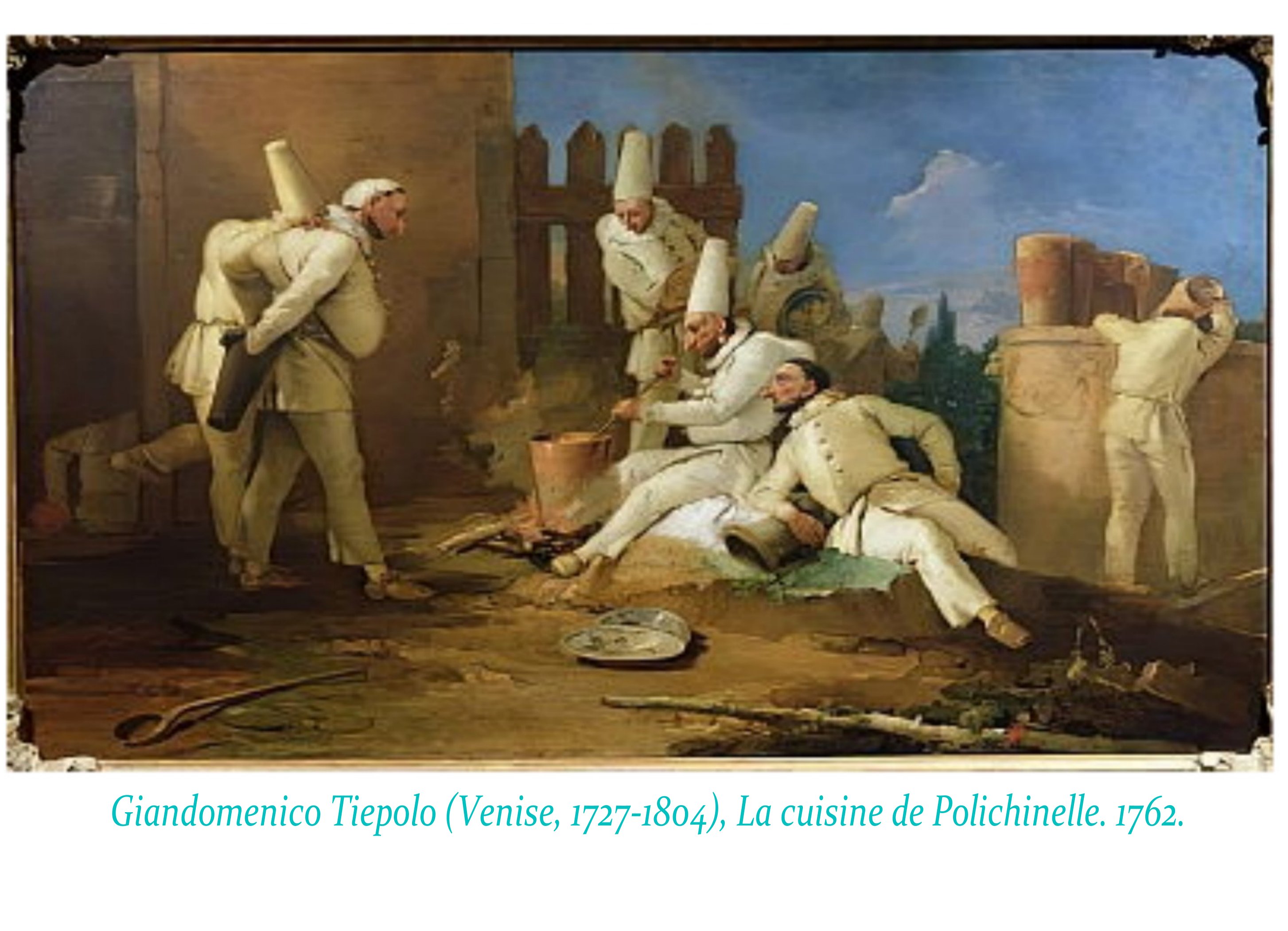 Tiepolo semble explorer pendant des années un thème récurrent, celui des « ragazzi », comme celui des Charlatans et bateleurs. D’un côté des bandes de jeunes hommes ( vieillissant parfois), incapables de revenir dans le monde réel, et perpétuant au delà du Carnaval, une connivence générationnelle, refusant de voir le monde, lui préférant de fait le spectacle ; ceci jusqu’à la mort des Polichinelles, leurs maladies etc.