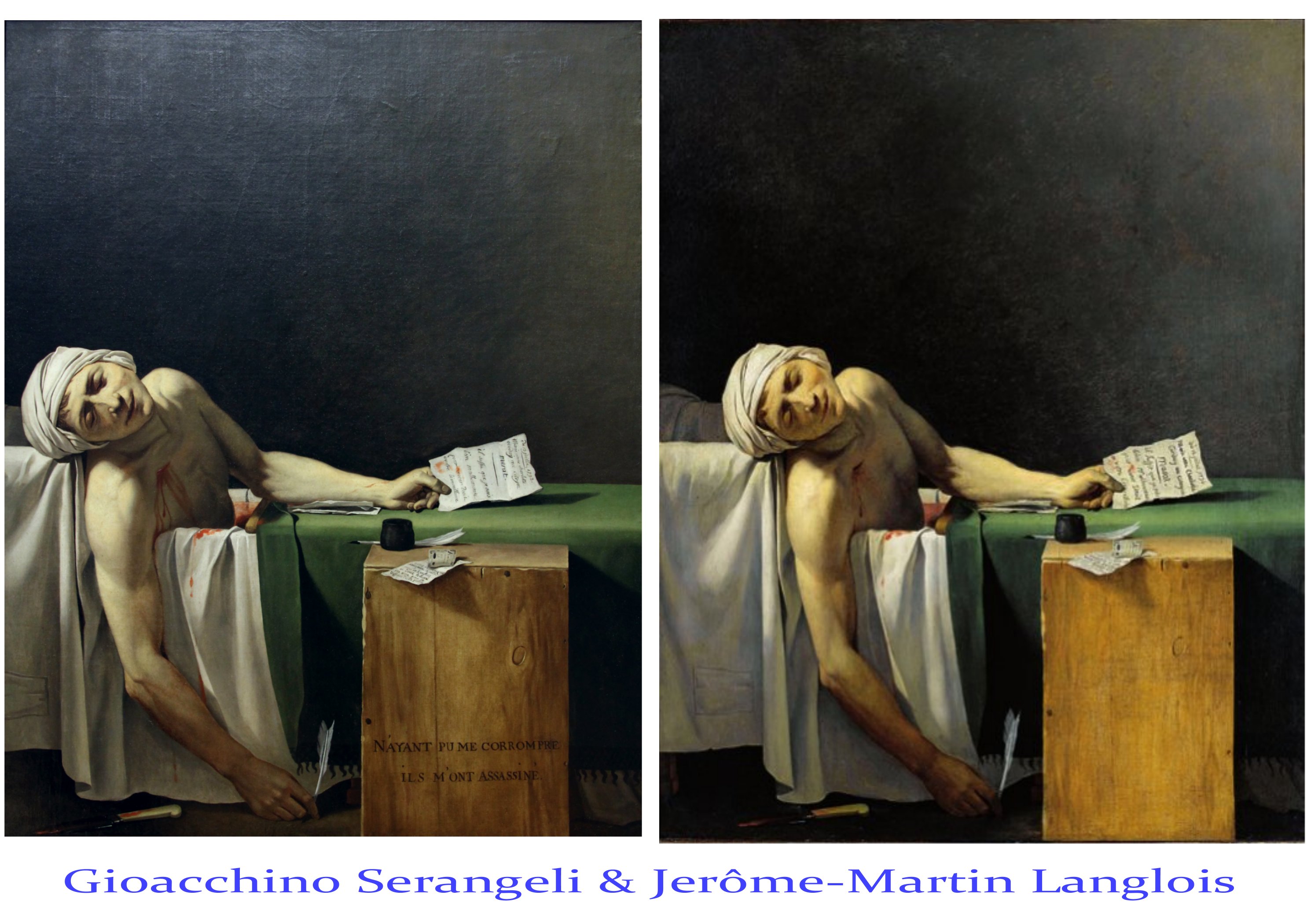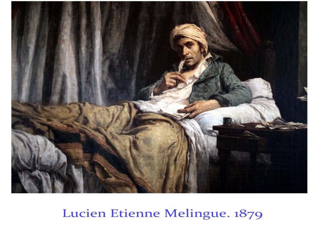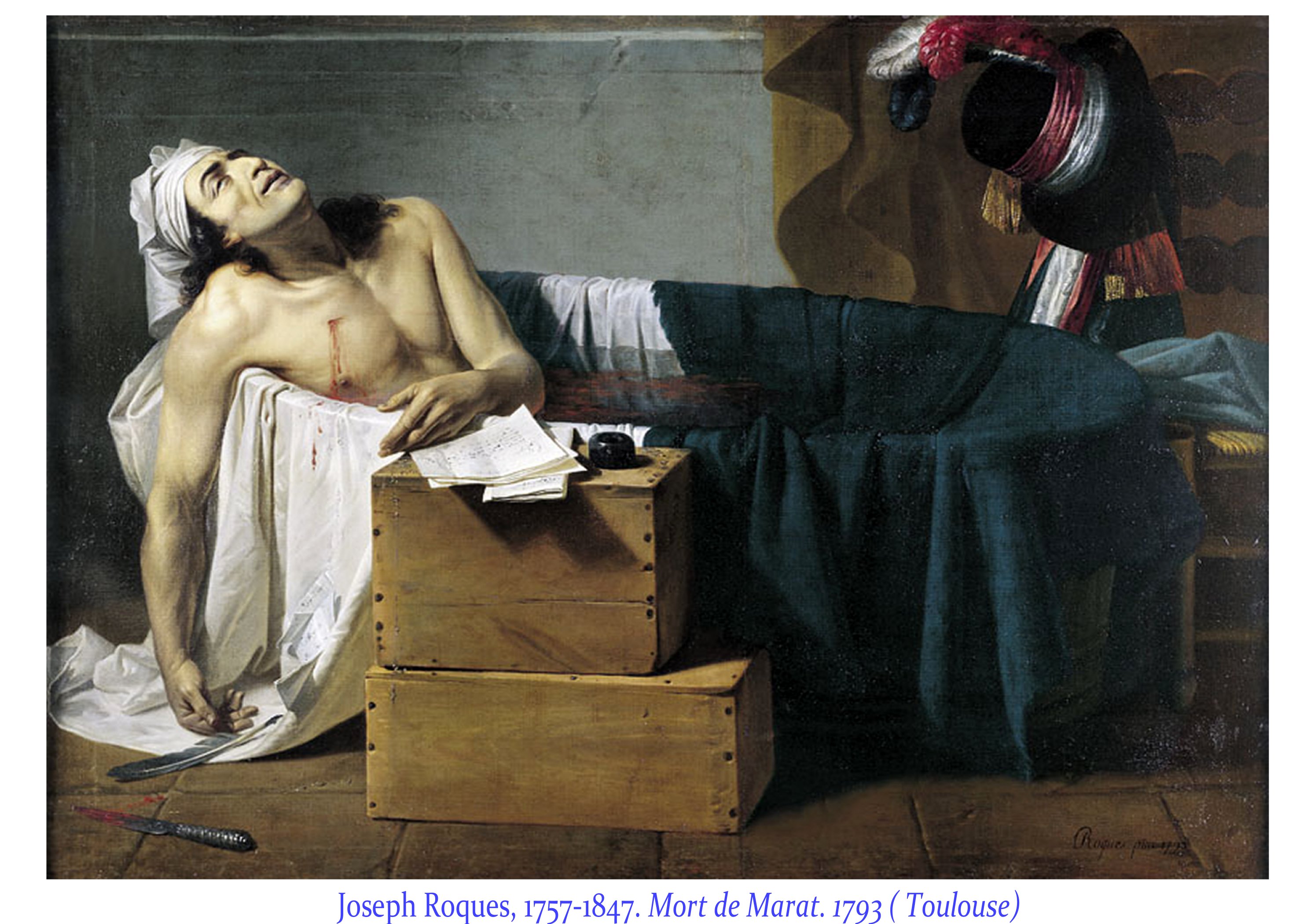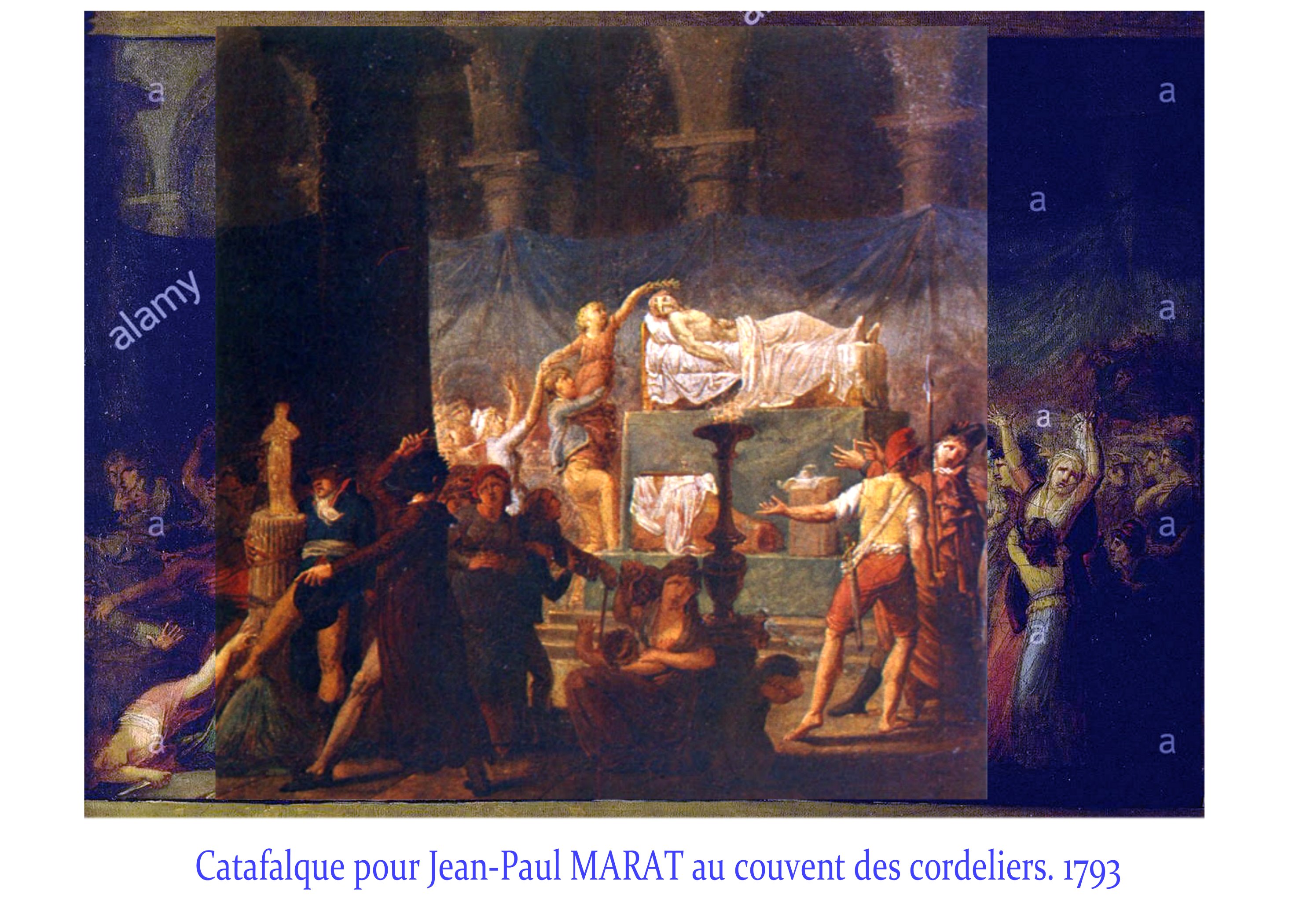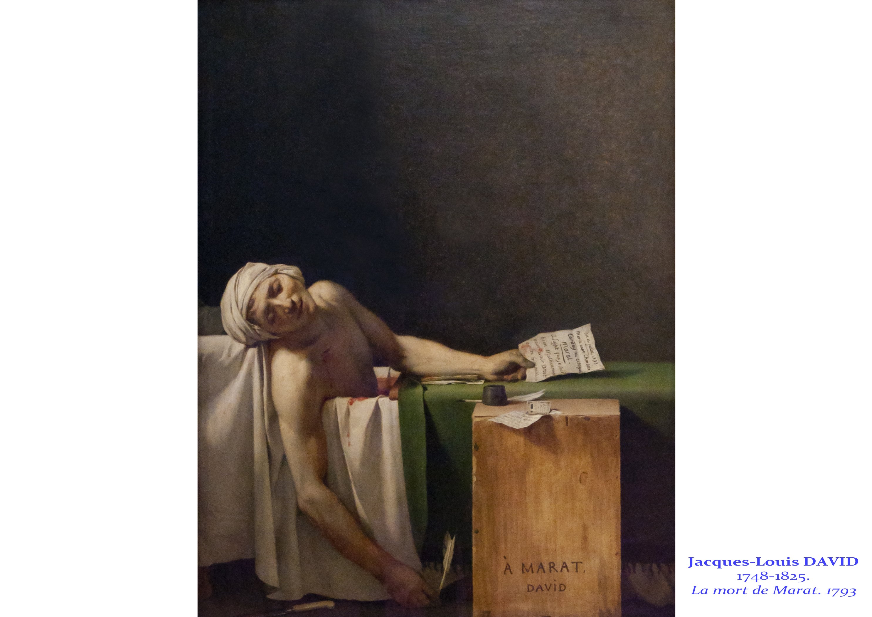 Une commande publique au peintre et élu révolutionnaire David, pour commémorer l’assassinat de son ami et proche Marat, peinture destinée à être installée sur le pupitre de l’Assemblée, comme une adresse politique aux Girondins, frères ennemis des Montagnards. Mais cette peinture révèle tout un pan essentiel de ce tournant culturel et historique, d’une population, d’une Nation en quête de héros, de martyrs, de symboles et d’ expression artistique nouvelle, se dégageant de siècles de catholicisme et d’aristocratie ; forces économiques et sociales ayant dominé toutes les expressions artistiques en Europe.