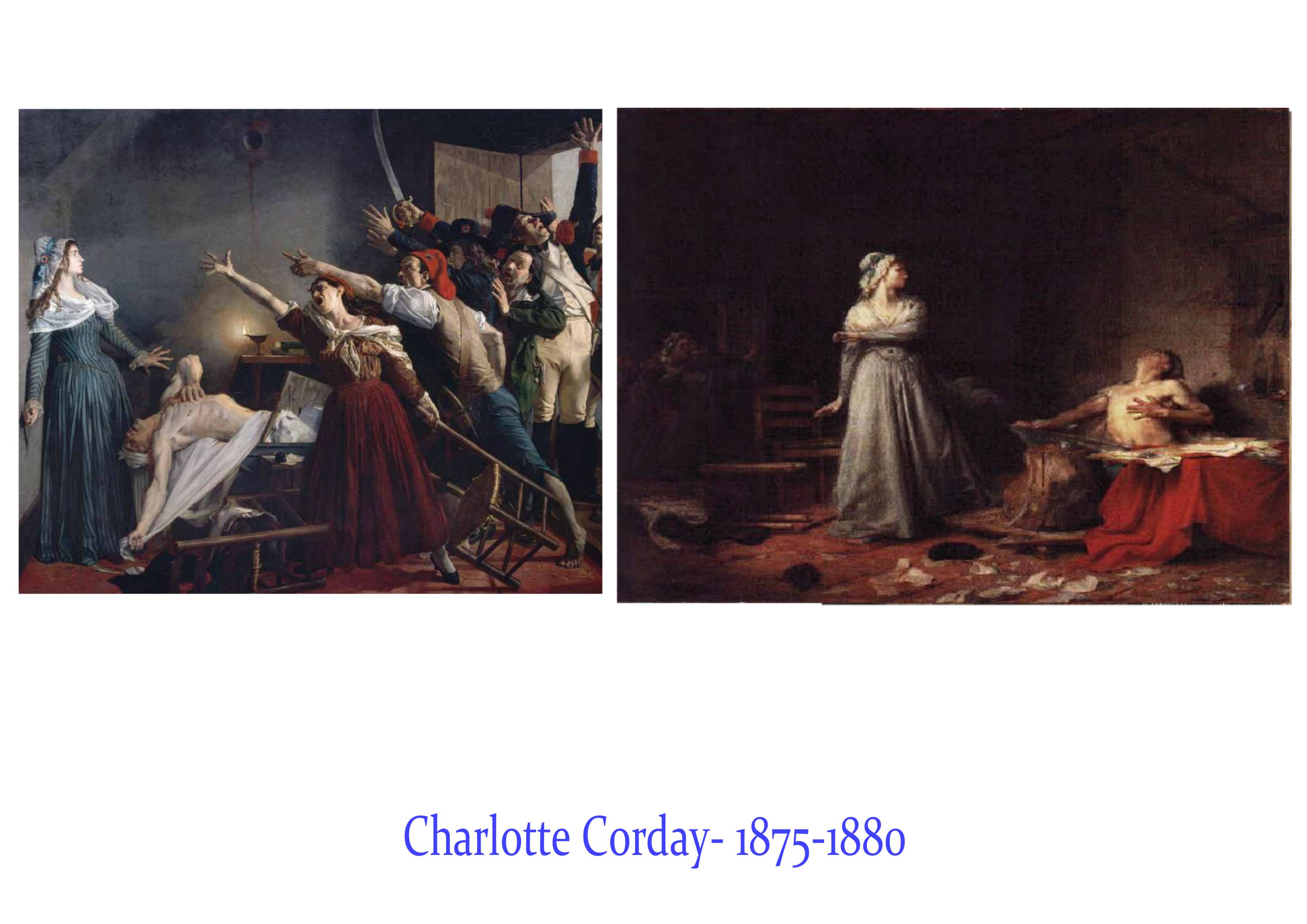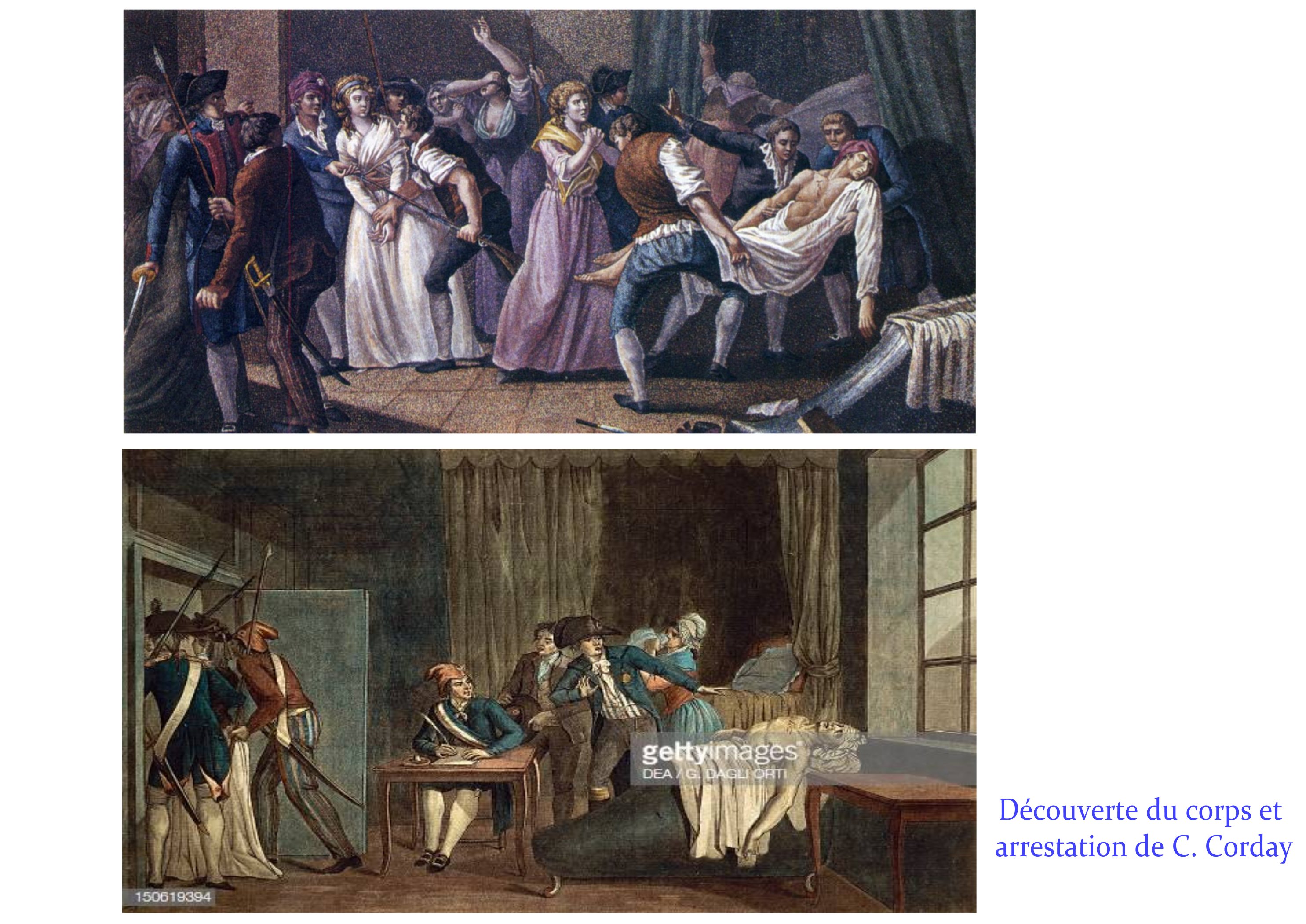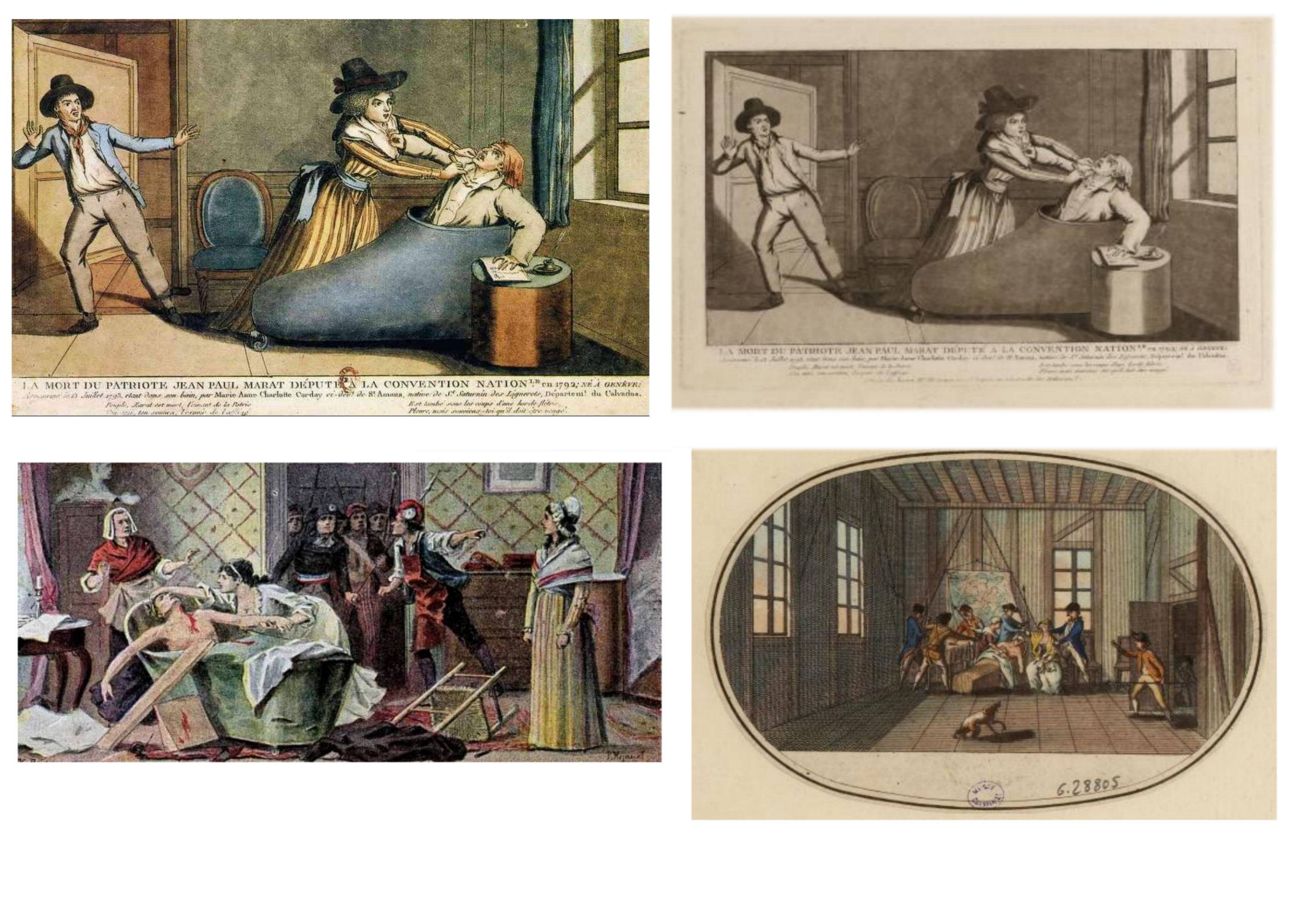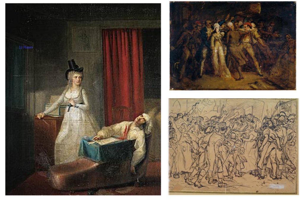 Commande de l’ assemblée destinée à occuper la base du pupitre des orateurs, cette oeuvre installe David,ami de Marat comme peintre officiel de la Révolution et du courant montagnard.il est significatif de voir ces 2 copies contemporaines. D’ une part de la manière de peindre néoclassique, qui ne laisse pas de place aux sentiments, ni à la manière de l’artiste ; de l’autre, de l’écho immense de la mort de Marat, ici peint en martyr, succédanné christique , Le linceul, les blessures, la dimension messianique.Cette version contemporaine, plus anecdotique et narrative, souligne bien le parti-pris minimaliste et spirituel de David.Marat, rédactuer du journal « la’ami du peuple » était extrèmement populaire,avant son assassinat. Intellectuel à la plume brillante, considéré comme un « sage », car comme David, ils sont d’une génération antérieure aux révolutionnaires et même de Louis XVI et M. Antoinette.Le développement de la presse comme des illustrations et gravures, joue un rôle essentiel dans la formation de l’opinion public et des engouements.Marat, grand orateur, adulé ou caricaturé, a fait de sa parole une arme radicale. Sa position tranchée pour une révolution sociale, effraye de nombreux révolutionnaires bourgeois.Ce petit tableau donne une idée de la volonté d’inscrire l’actualité, dans la grande histoire. le neo classicisme épousant ainsi la grande tradition de l’antiquité.Le grand nombre de gravures illustrant avec variantes l’assassinat de J. P. Marat démontre l’impact de ce getse.Corday sera une héroine pour certains, traitre pour d’autres.