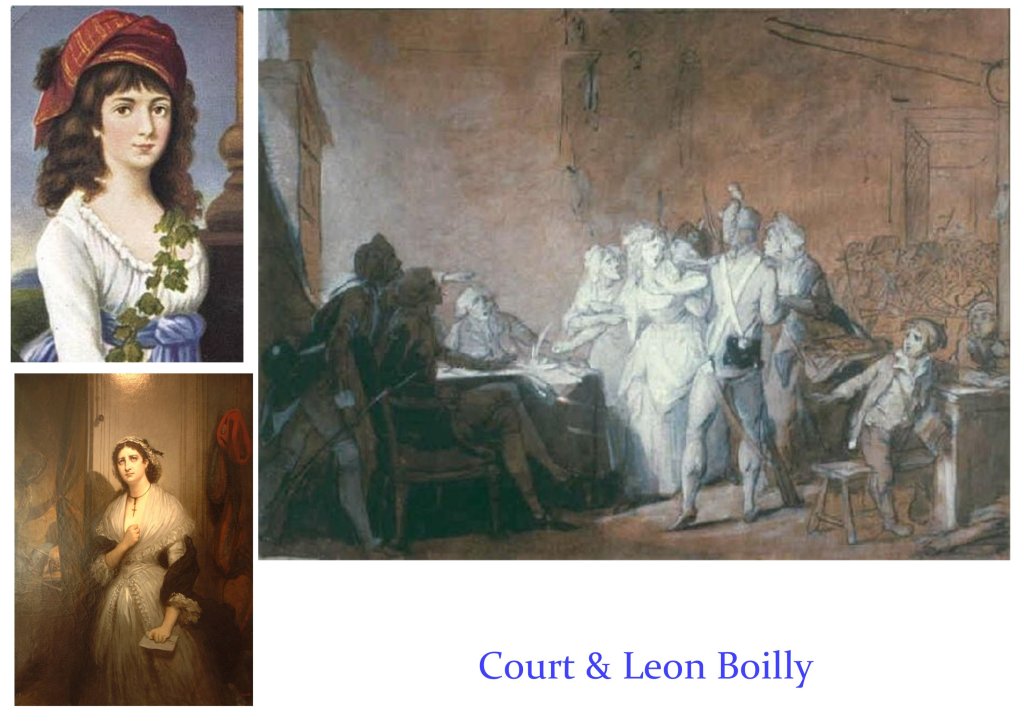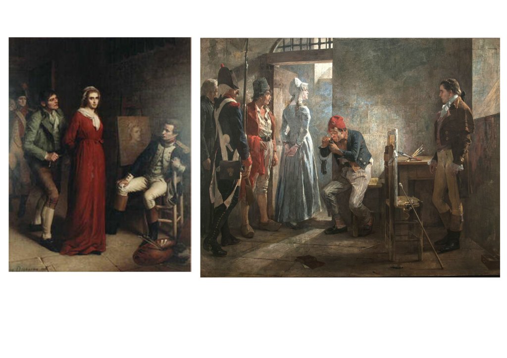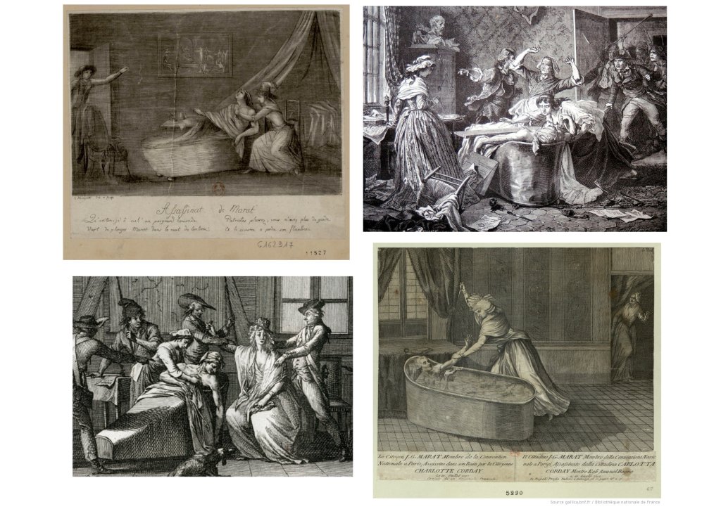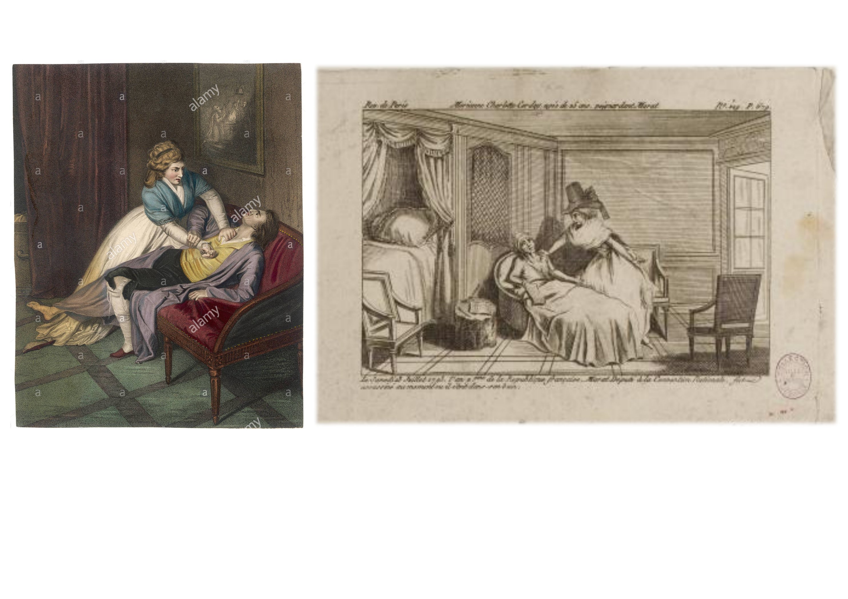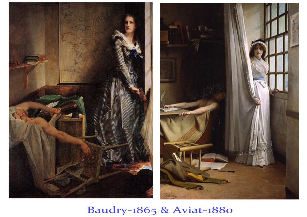 Commande de l’ assemblée destinée à occuper la base du pupitre des orateurs, cette oeuvre installe David,ami de Marat comme peintre officiel de la Révolution et du courant montagnard.il est significatif de voir ces 2 copies contemporaines. D’ une part de la manière de peindre néoclassique, qui ne laisse pas de place aux sentiments, ni à la manière de l’artiste ; de l’autre, de l’écho immense de la mort de Marat, ici peint en martyr, succédanné christique , Le linceul, les blessures, la dimension messianique.Cette version contemporaine, plus anecdotique et narrative, souligne bien le parti-pris minimaliste et spirituel de David.Marat, rédactuer du journal « la’ami du peuple » était extrèmement populaire,avant son assassinat. Intellectuel à la plume brillante, considéré comme un « sage », car comme David, ils sont d’une génération antérieure aux révolutionnaires et même de Louis XVI et M. Antoinette.Le développement de la presse comme des illustrations et gravures, joue un rôle essentiel dans la formation de l’opinion public et des engouements.Marat, grand orateur, adulé ou caricaturé, a fait de sa parole une arme radicale. Sa position tranchée pour une révolution sociale, effraye de nombreux révolutionnaires bourgeois.Ce petit tableau donne une idée de la volonté d’inscrire l’actualité, dans la grande histoire. le neo classicisme épousant ainsi la grande tradition de l’antiquité.Le grand nombre de gravures illustrant avec variantes l’assassinat de J. P. Marat démontre l’impact de ce getse.Corday sera une héroine pour certains, traitre pour d’autres.