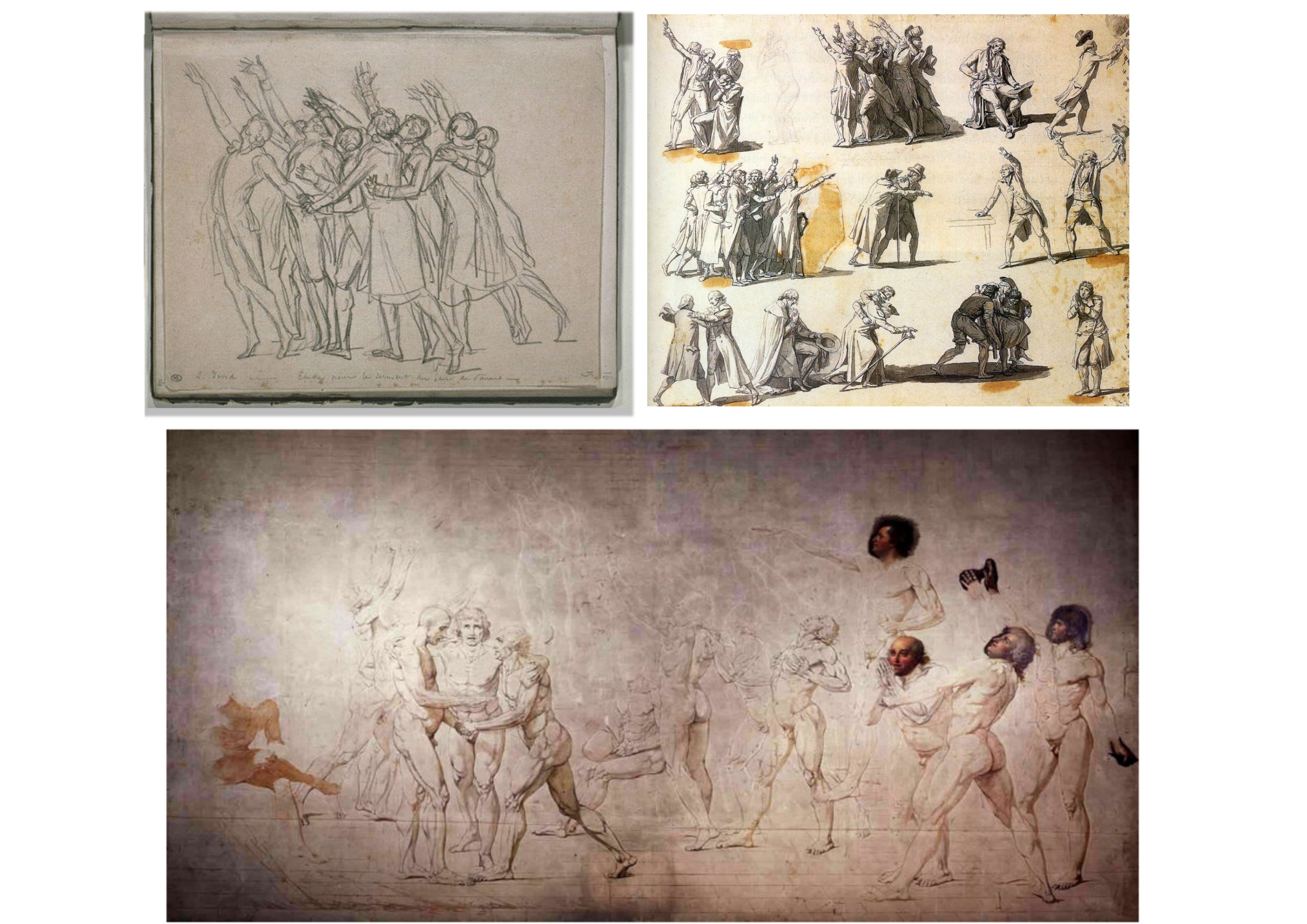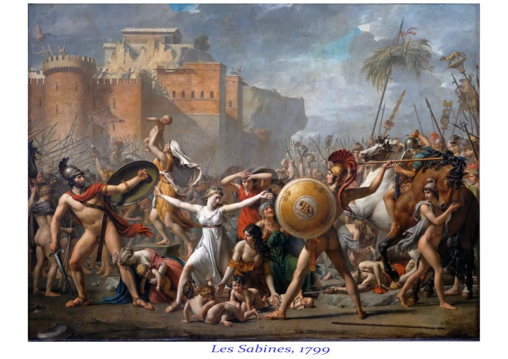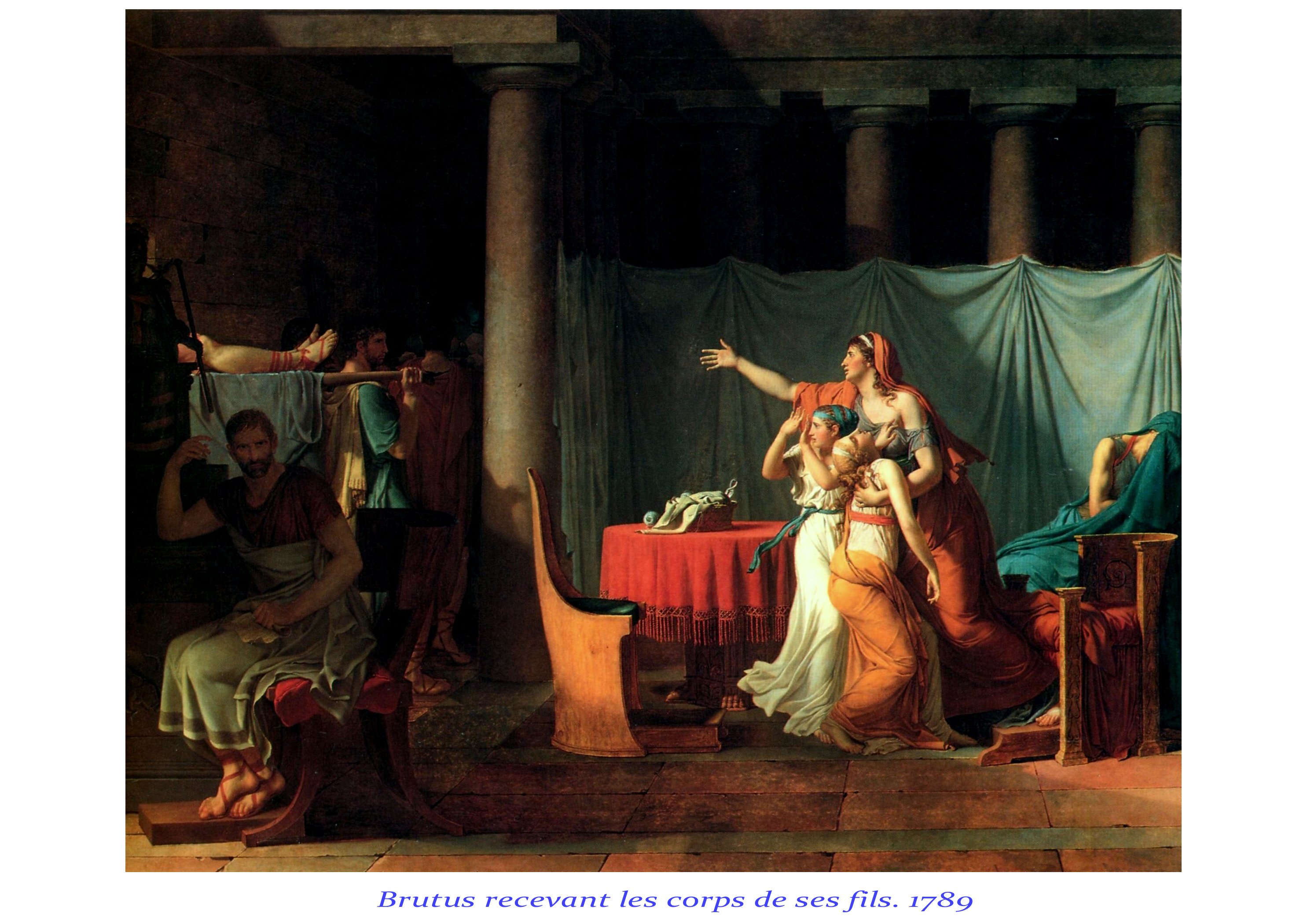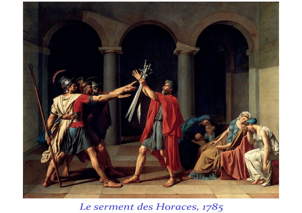 Nous verrons comment David, inspiré par les philosophies des lumières aspire depuis longtemps à cet idéal, à la relativisation des émotions et sensations individualistes au bénéfice des idées, de grands projets et d’utopies. Il va trouver dans l’héritage de l’ antiquité romaine, non seulement des registres formels, esthétiques et même vestimentaires, mais aussi une idée de la nation , de la cité, du pouvoir.