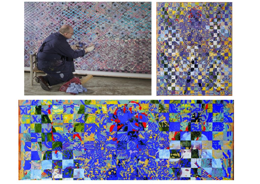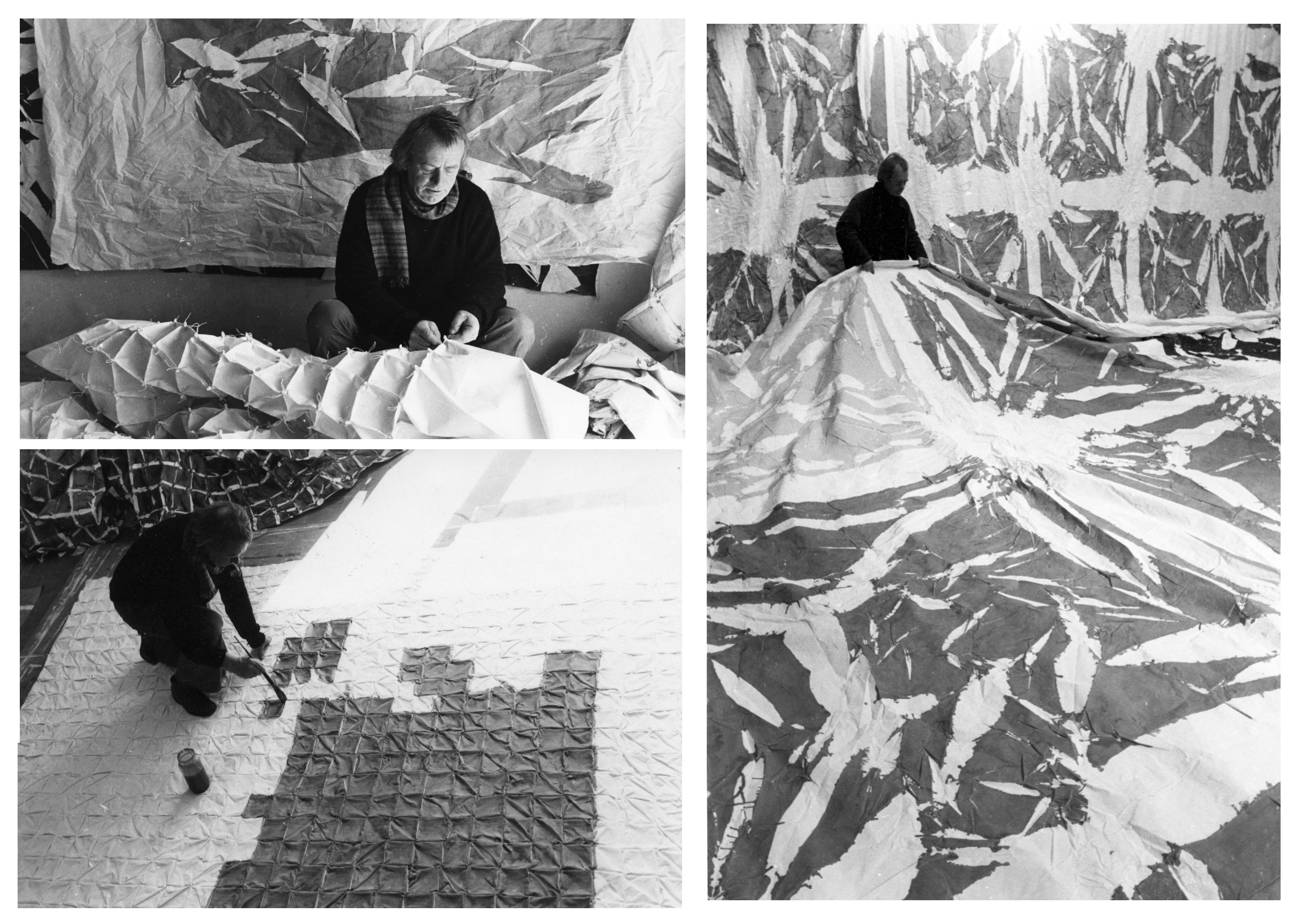 Par la suite il opèrera sur de grandes toiles libres, méthodiquement froissées ou pliées. Une fois ce volume de plis obtenu, il peint la surface de cet amalgame, avec des peintures plus ou moins fluides et parfois de couleurs différentes.