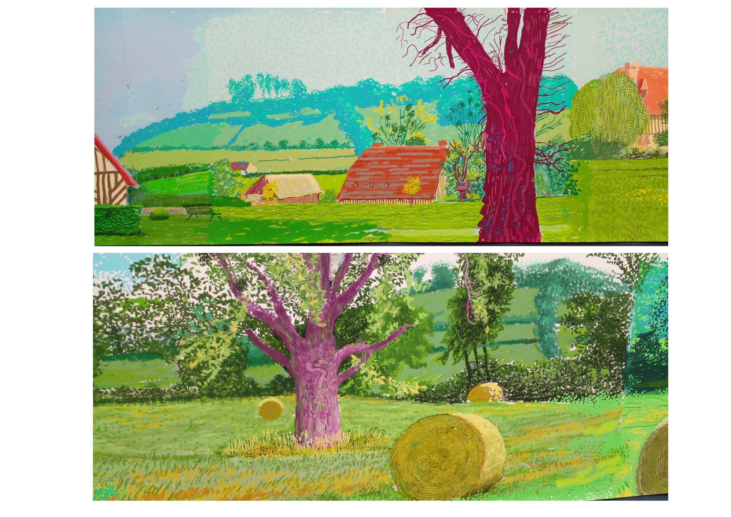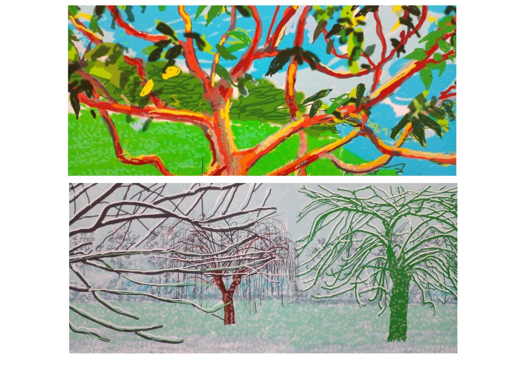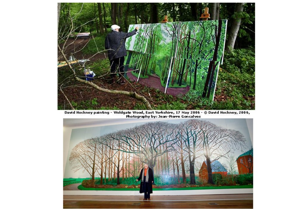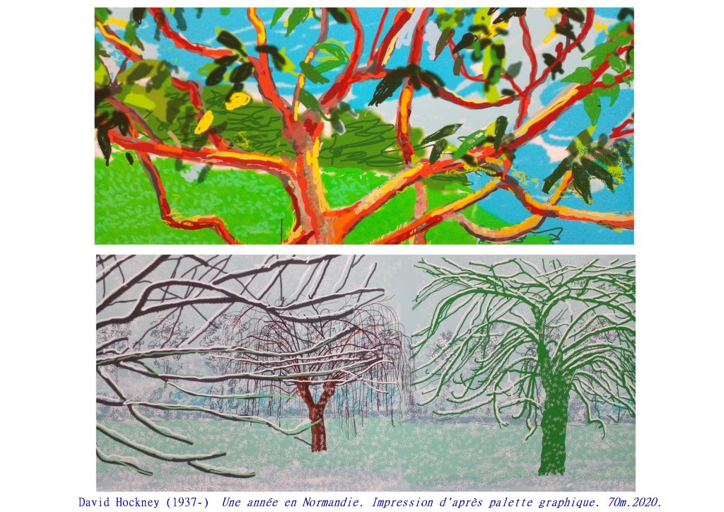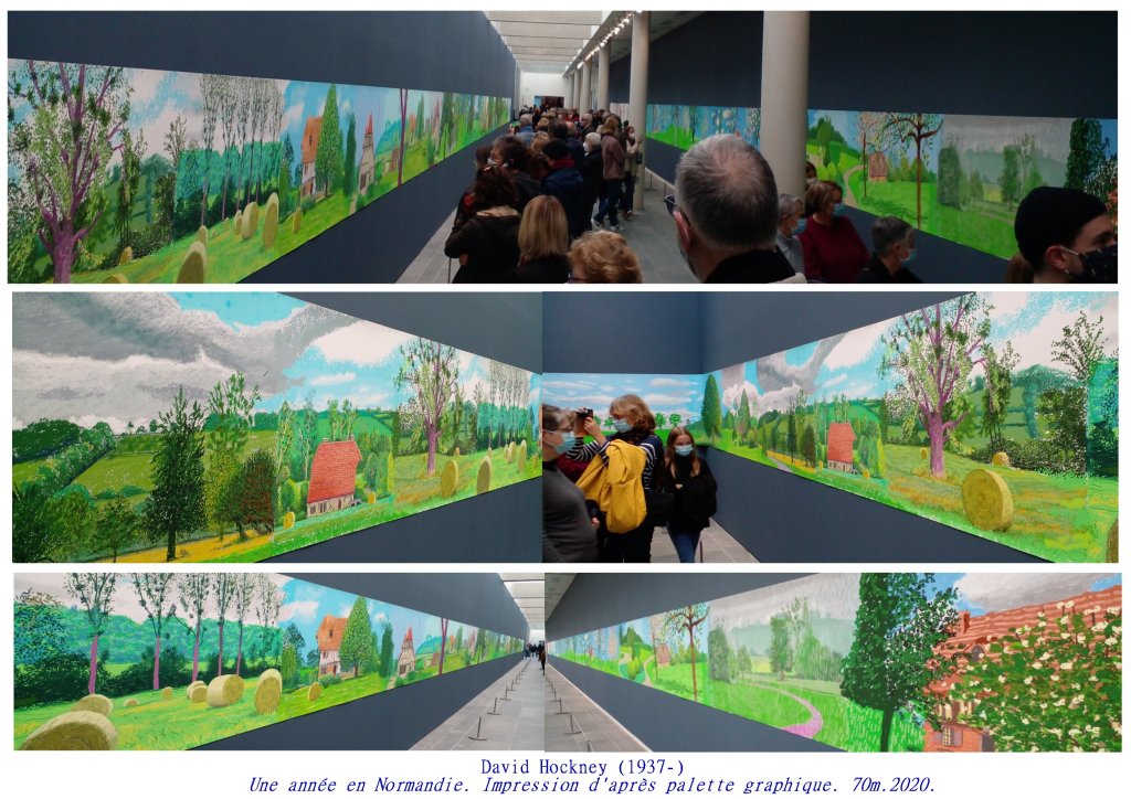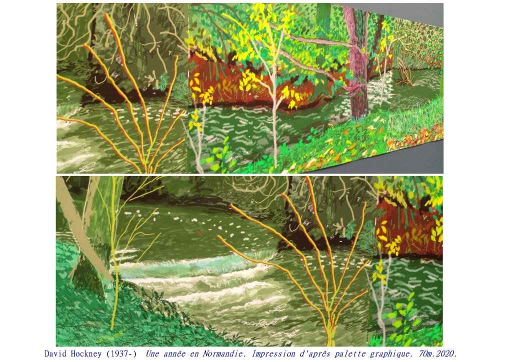 Sa dernière grande œuvre exposée à l’Orangerie des Tuileries, en hommage aux Nymphéas de Monet est un chef d’œuvre de subtilité picturale, d’inventions graphiques, renouvelant l’art du paysage. Ici encore Hockney nous propose un espace/temps ouvert, par cette impression numérique aux encres choisies, Le spectateur peut aller et venir, d’une saison à l’autre, d’un point de vue à l’autre, sans jamais englober l’ensemble.