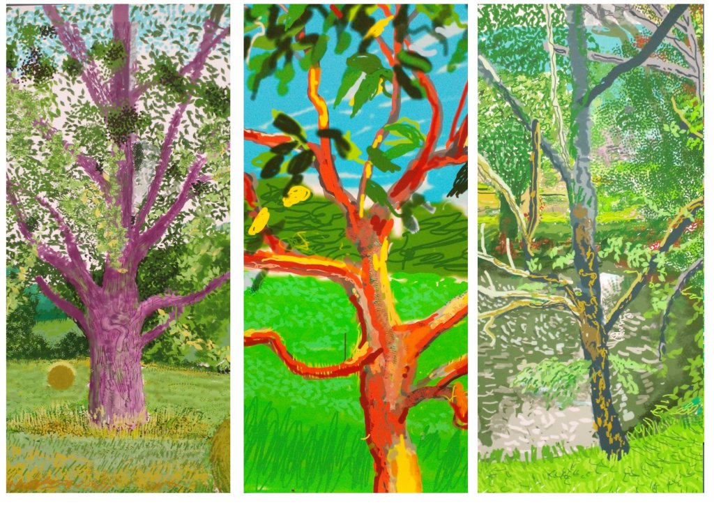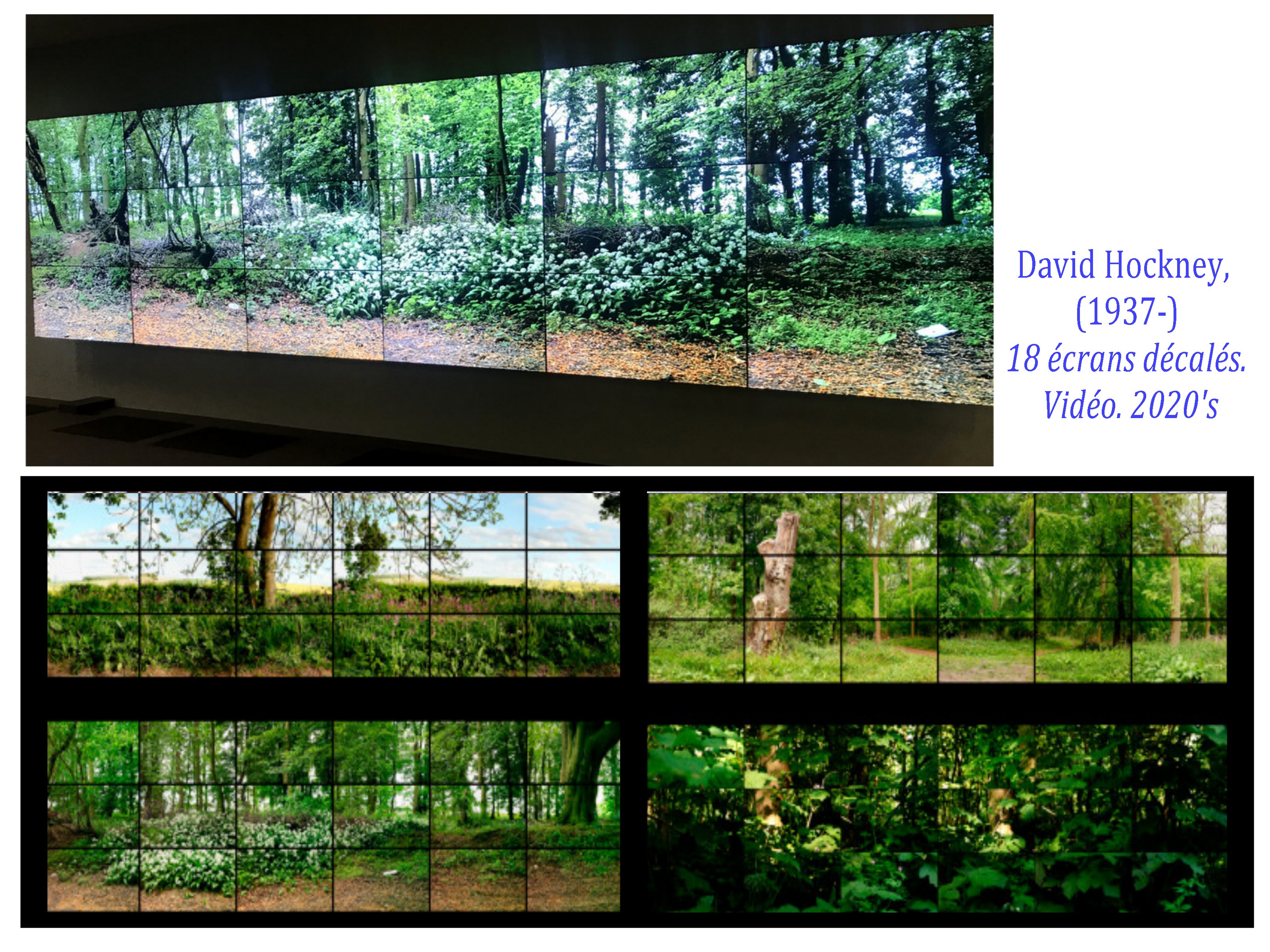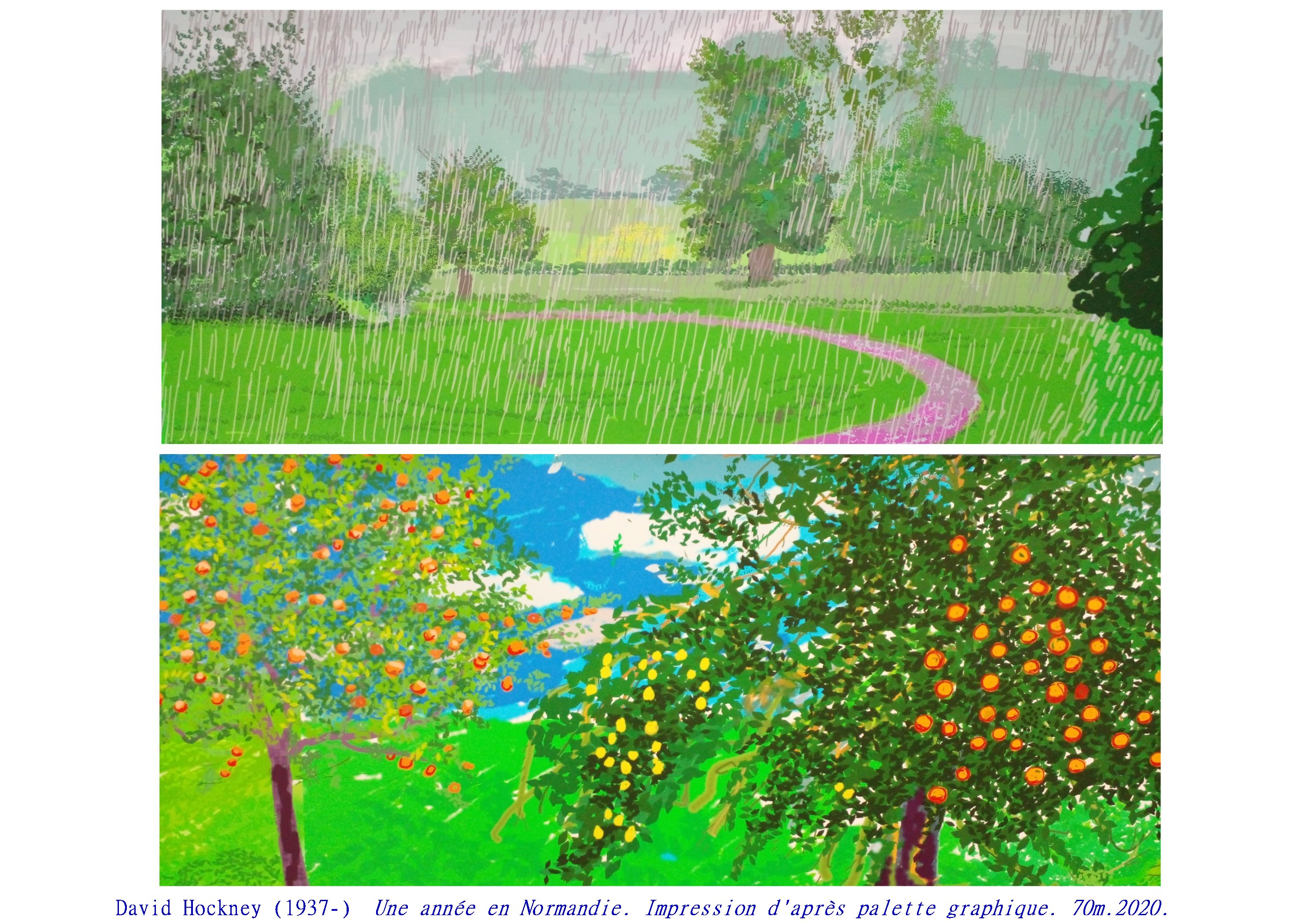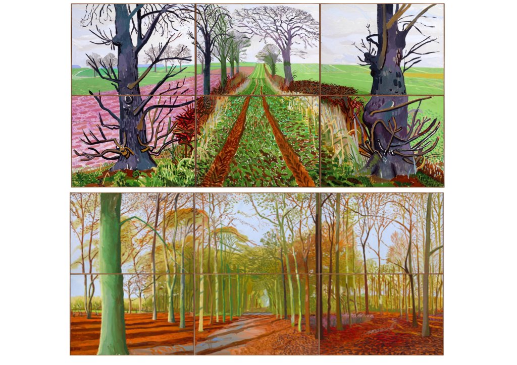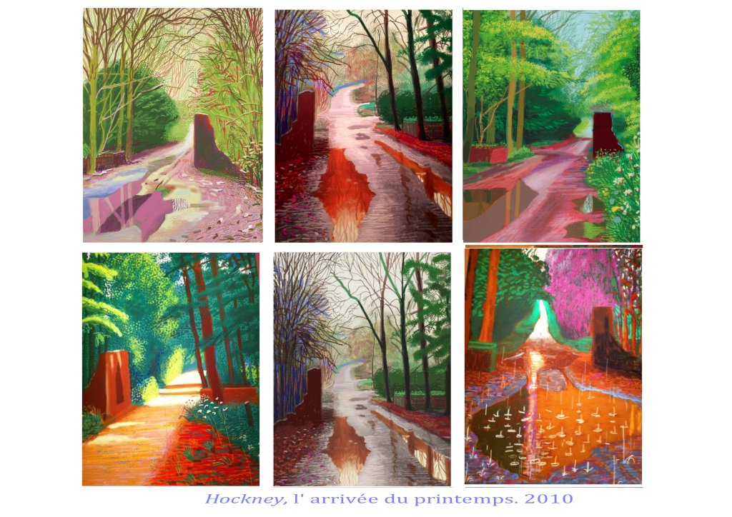 Sa dernière grande œuvre exposée à l’Orangerie des Tuileries, en hommage aux Nymphéas de Monet est un chef d’œuvre de subtilité picturale, d’inventions graphiques, renouvelant l’art du paysage. Ici encore Hockney nous propose un espace/temps ouvert, par cette impression numérique aux encres choisies, Le spectateur peut aller et venir, d’une saison à l’autre, d’un point de vue à l’autre, sans jamais englober l’ensemble.