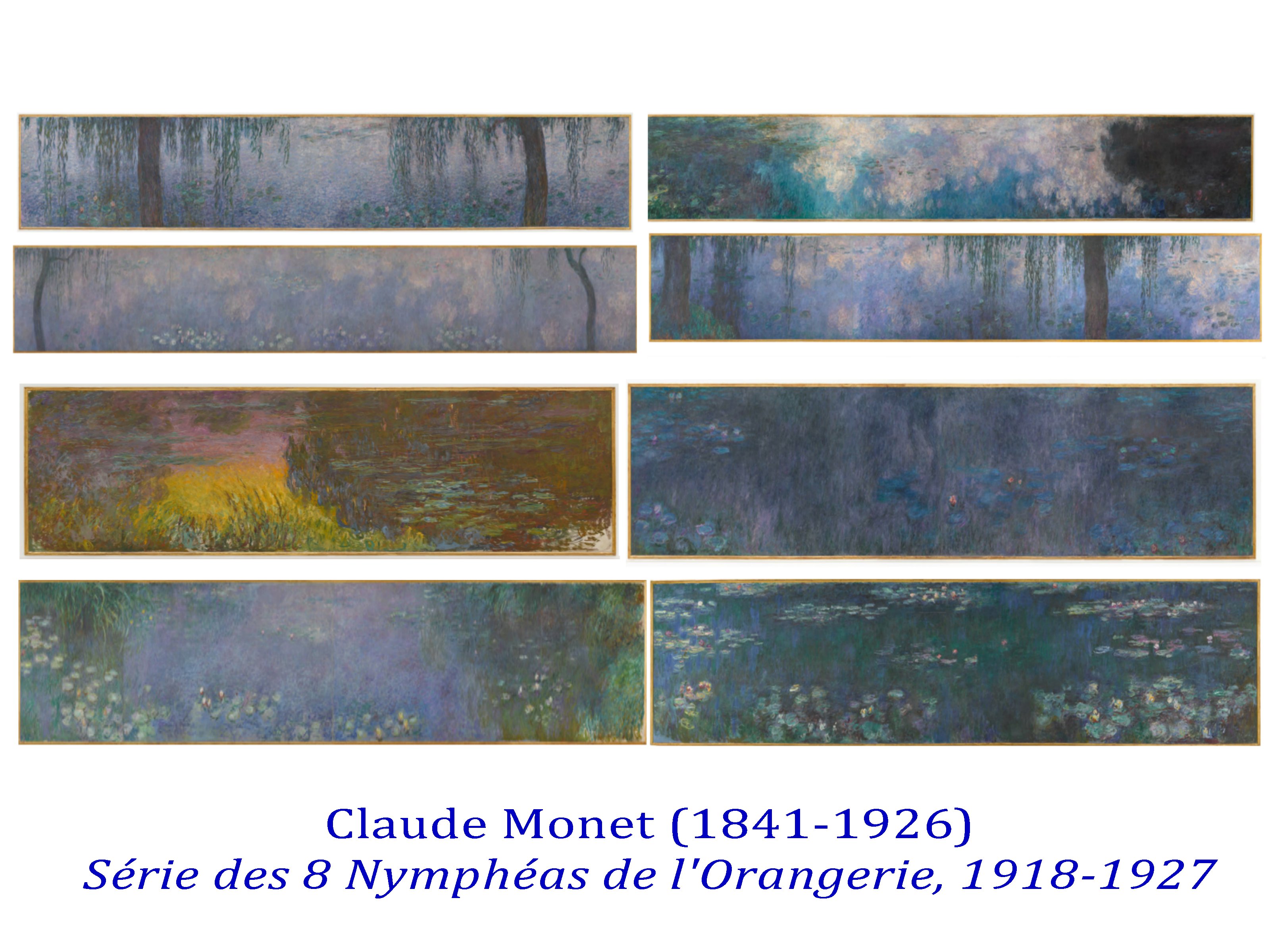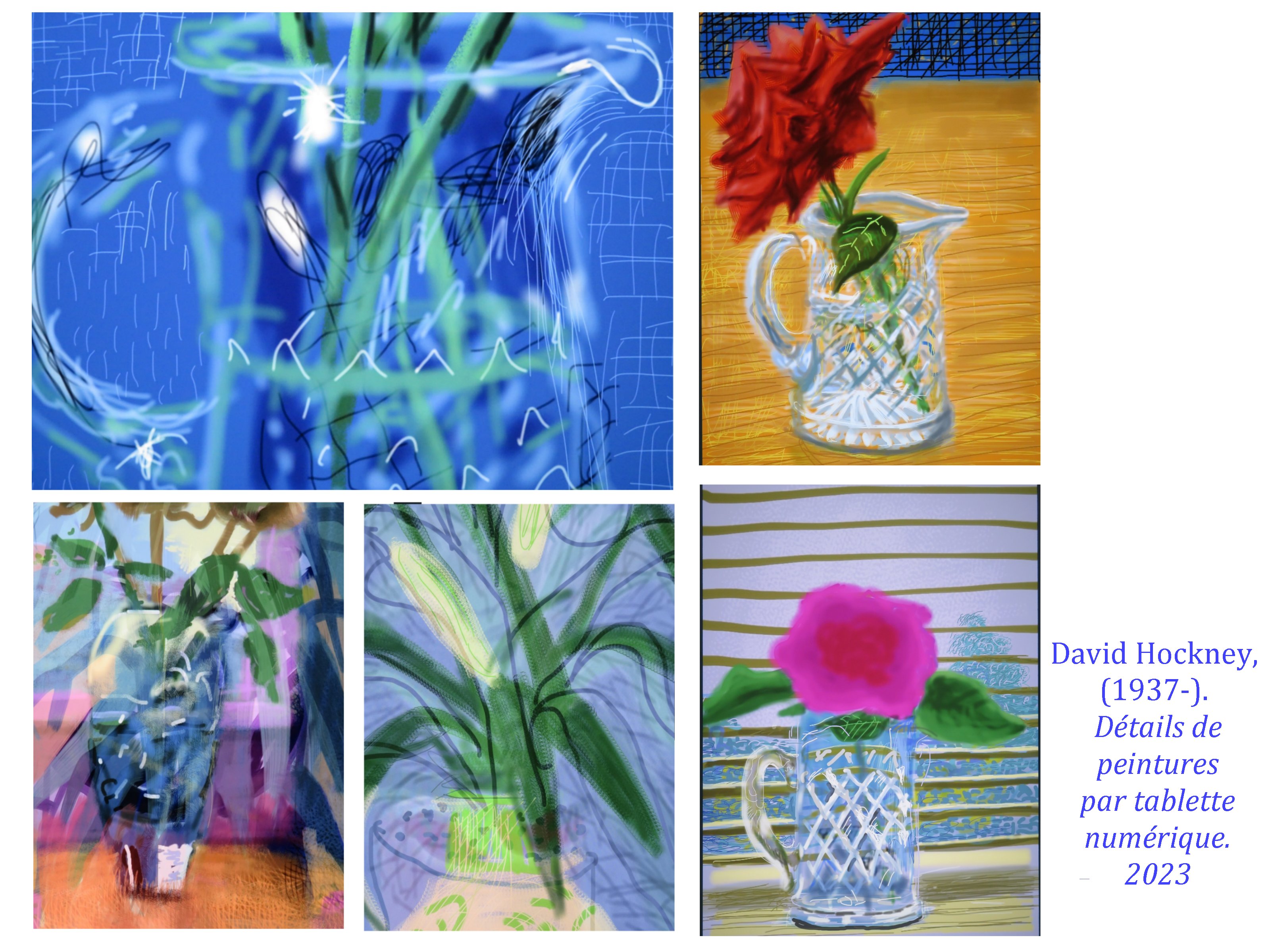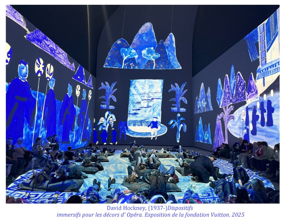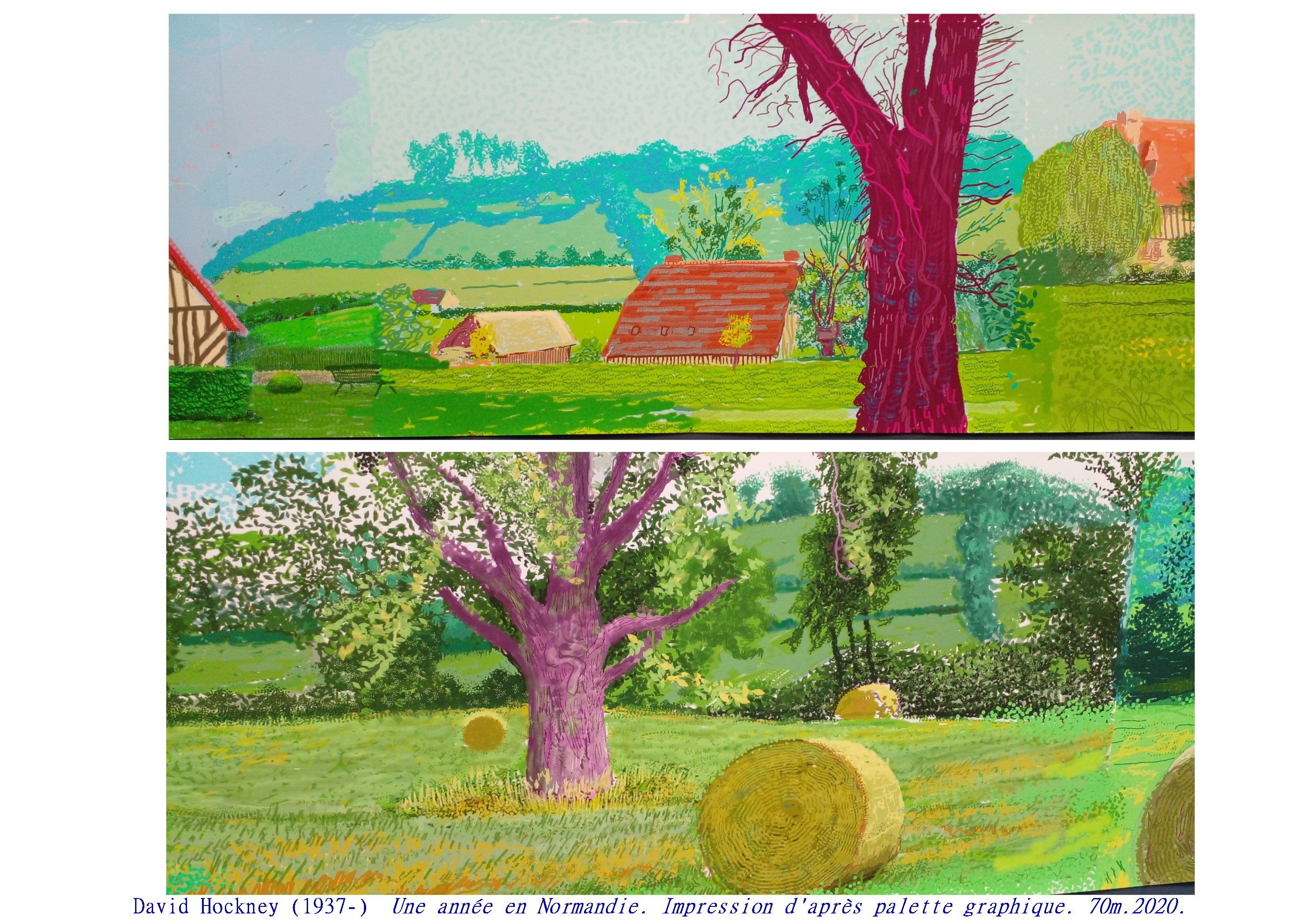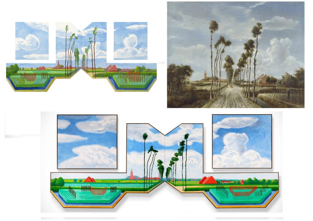 Sa dernière grande œuvre exposée à l’Orangerie des Tuileries, en hommage aux Nymphéas de Monet est un chef d’œuvre de subtilité picturale, d’inventions graphiques, renouvelant l’art du paysage. Ici encore Hockney nous propose un espace/temps ouvert, par cette impression numérique aux encres choisies, Le spectateur peut aller et venir, d’une saison à l’autre, d’un point de vue à l’autre, sans jamais englober l’ensemble.