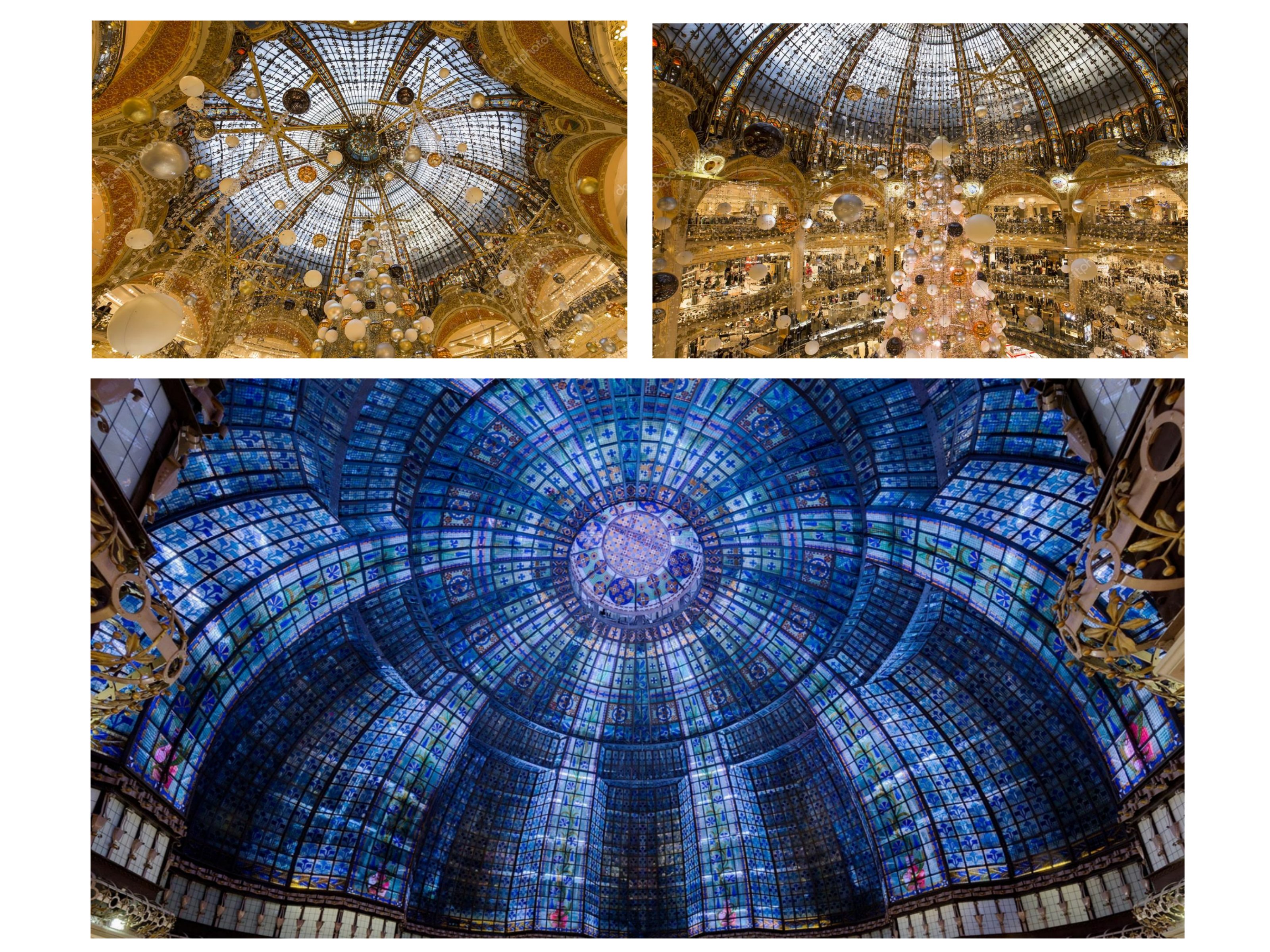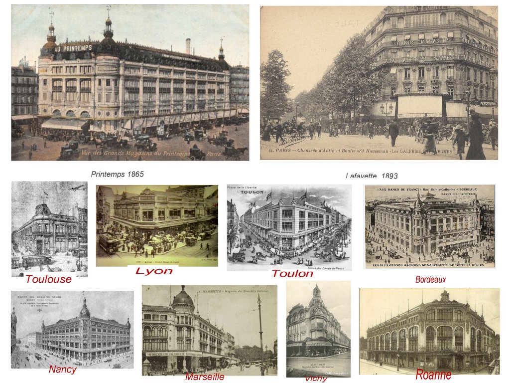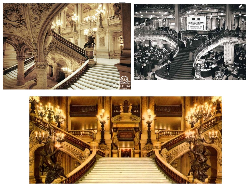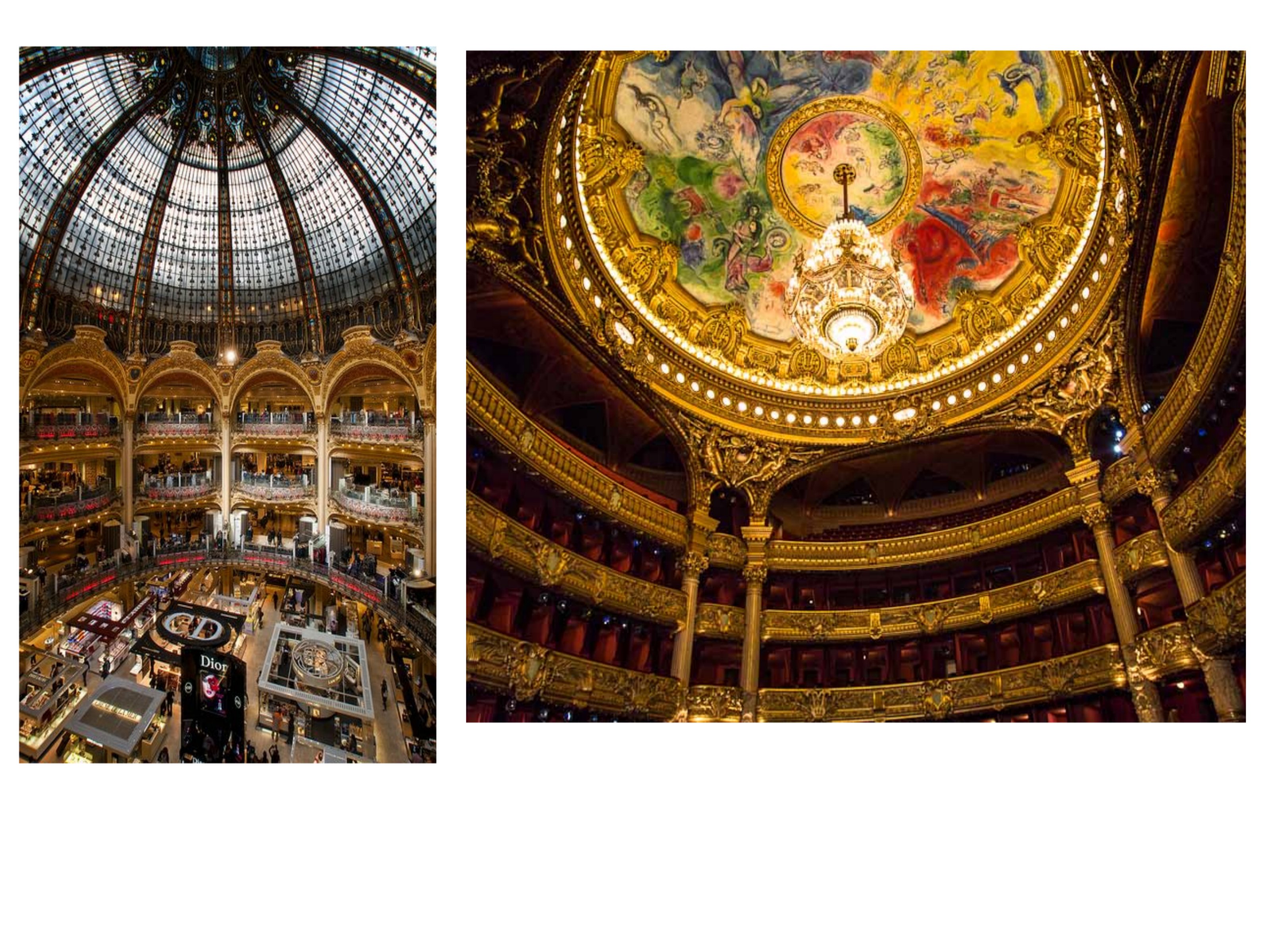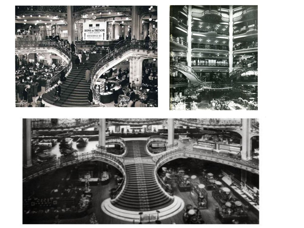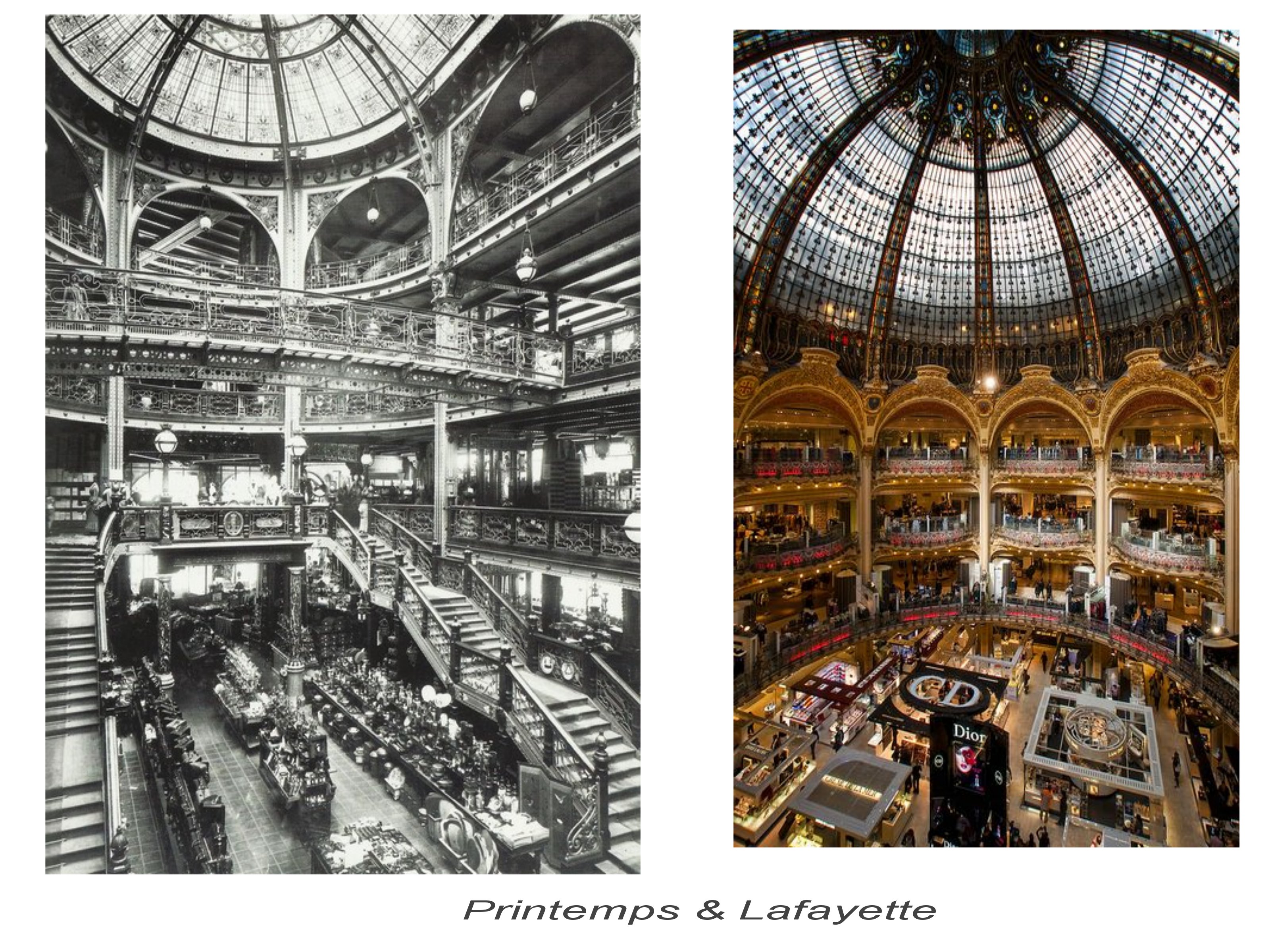 Les grands magasins, commerce de luxe, mais bourgeois, reposant sur des productions industrielles et la fourmilière populaire des employés. Seront des temples, empruntant leur structure et leurs coupoles à l’Opéra Garnier, tout comme les grands escaliers, mais la façade, s’intègre à la continuité des boulevards Haussmanniens et cache le métal.