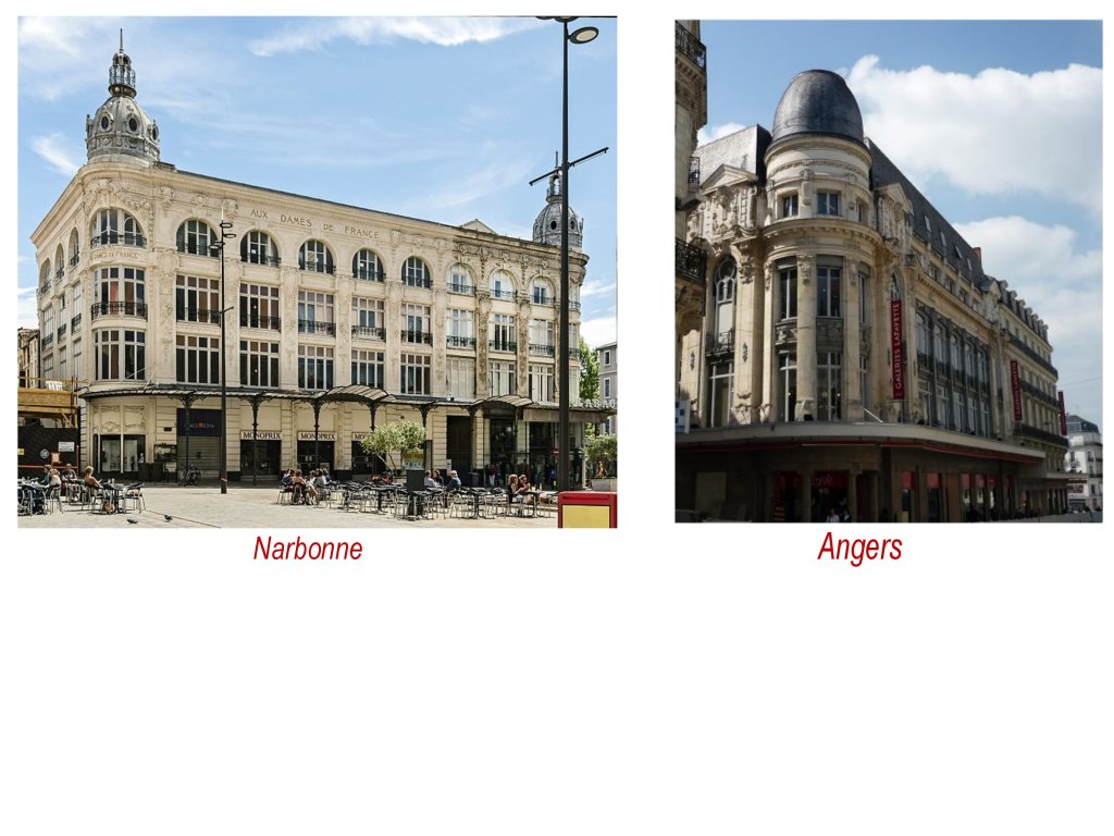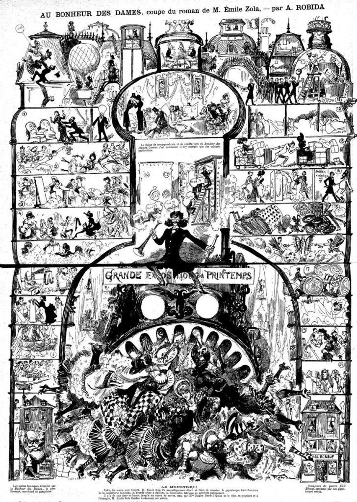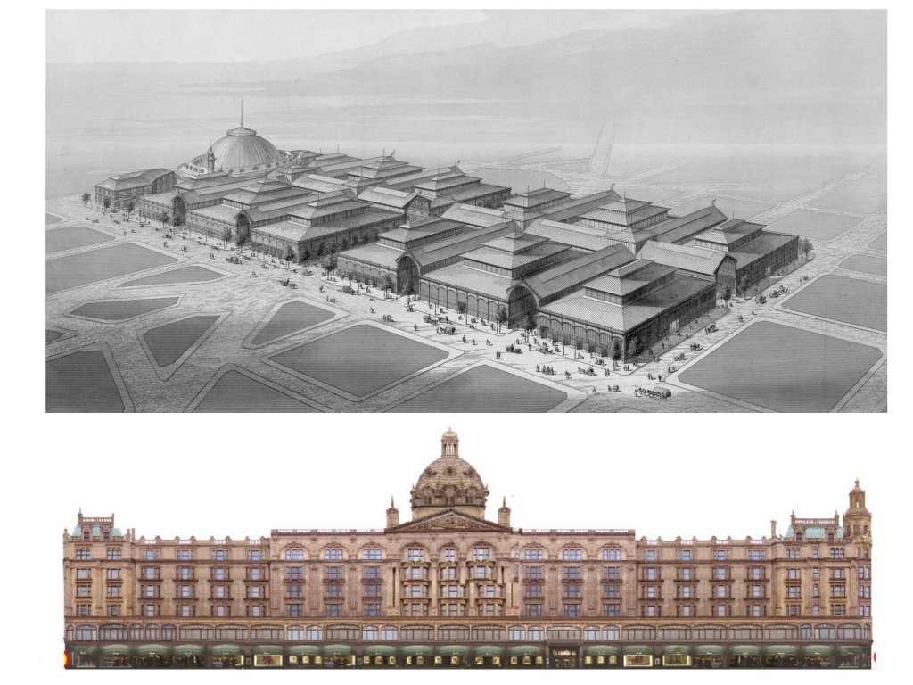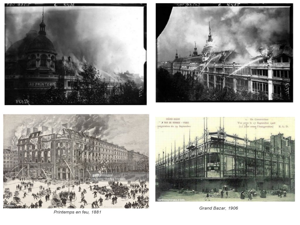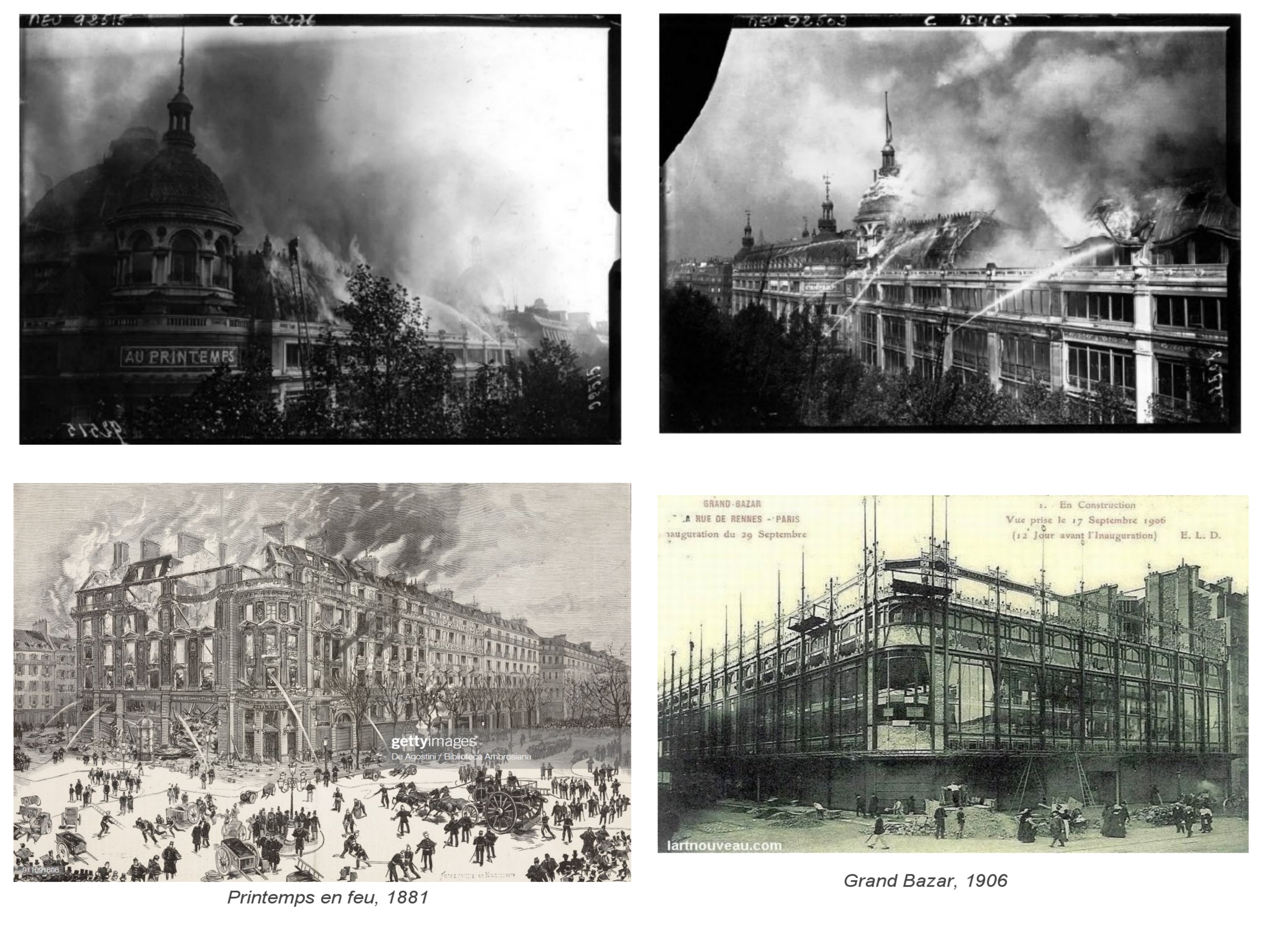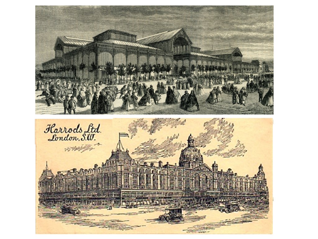 Les grands magasins, commerce de luxe, mais bourgeois, reposant sur des productions industrielles et la fourmilière populaire des employés. Seront des temples, empruntant leur structure et leurs coupoles à l’Opéra Garnier, tout comme les grands escaliers, mais la façade, s’intègre à la continuité des boulevards Haussmanniens et cache le métal.