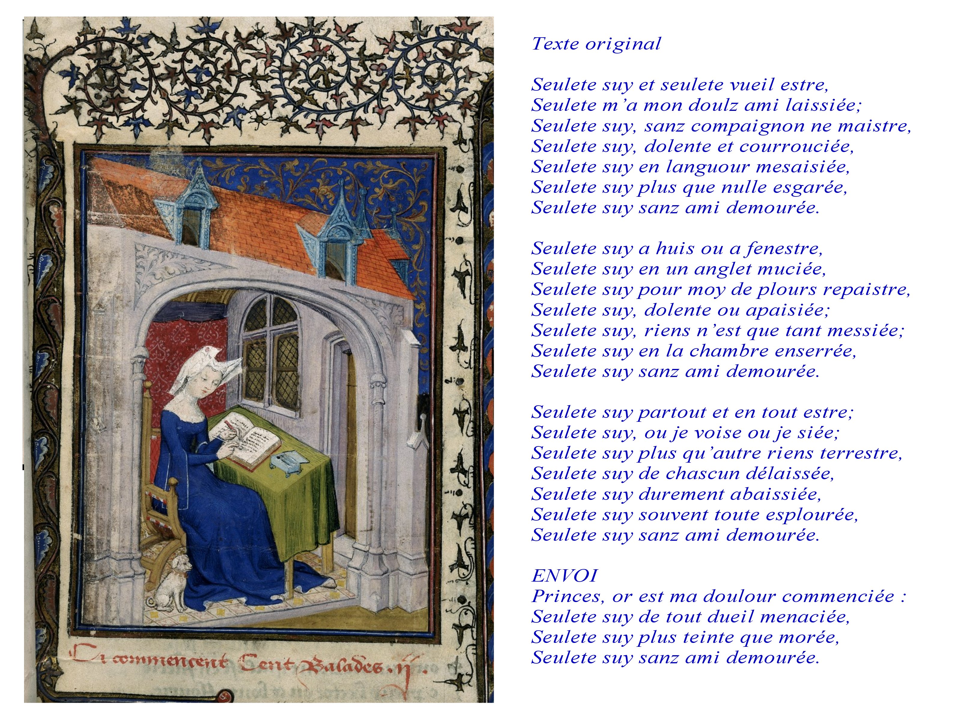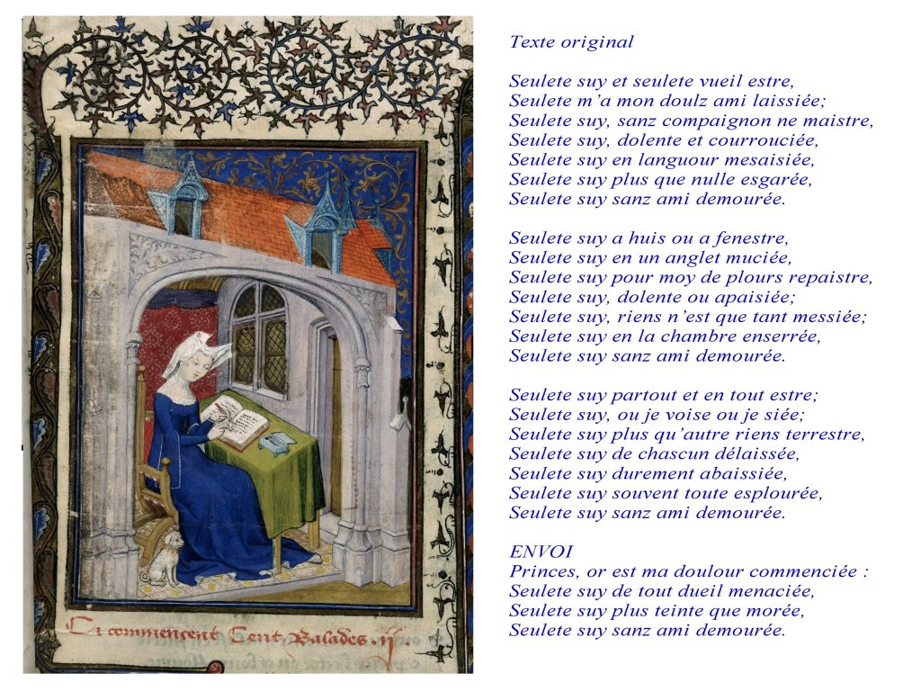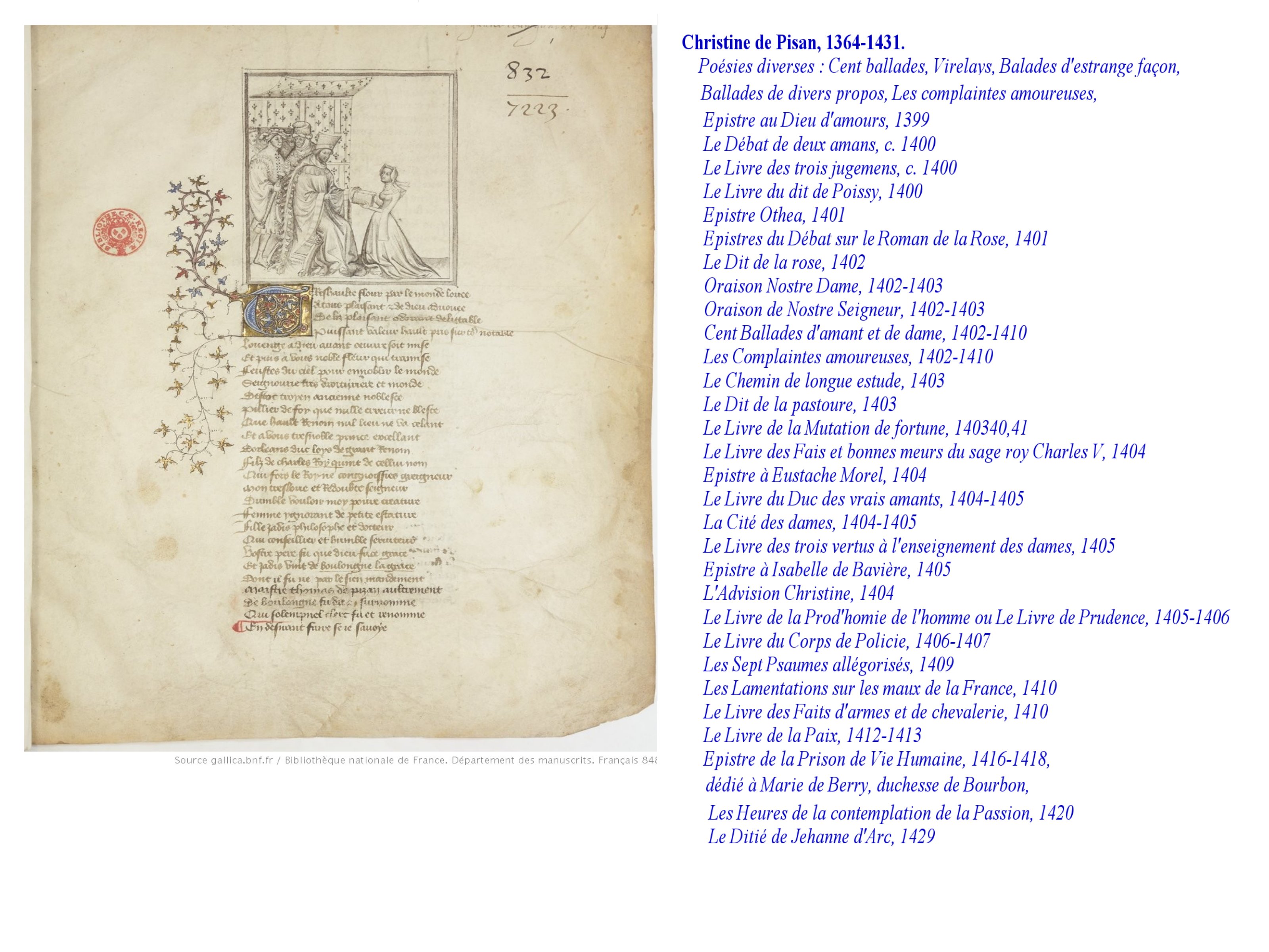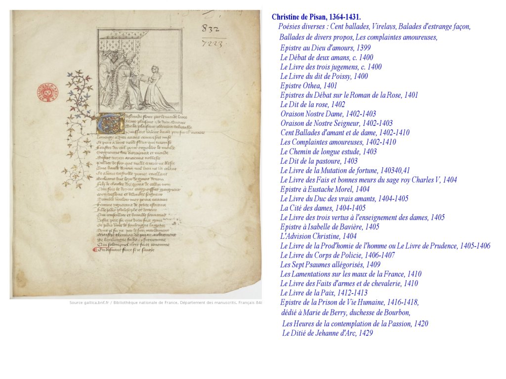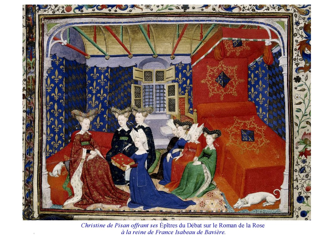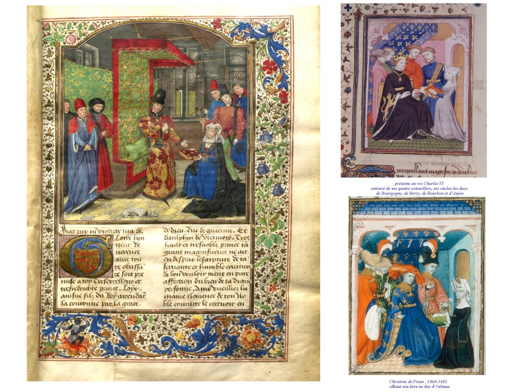 Elle même, très cultivée, entourée de la bibliothèque que son père avait apporté de Venise auprès de Charles V, devient même une figure fêtée de son vivant et représentée souvent. Elle rejoint en cela cette génération d’auteurs/ acteurs de leurs écrits, comme Guillaume de Machaut, Gaston Phoebus.