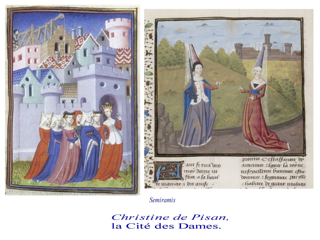 En rédigeant « la cité des dames » pour sauver de l’oubli et de la misogynie, les femmes illustres (en s’appuyant sur les textes de Boccace), elle réalise une œuvre majeure, car non seulement elle recense les femmes importantes de l’antiquité comme de la Bible, mais elle revisite les mythes en leur donnant un point de vue féministe, par exemple, elle réhabilite Pasiphaé, comme tendrement amoureuse du Taureau de Minos, et non comme une perverse ; elle relaye en cela l’archaïque héritage des déesses féminines associées aux bovins, dans un rapport » d’apprivoisement » et non de domination. de même, elle valorise le gynécée de Diane, le savoir d’ Athéna, la vitalité de Penthésilée et d’autres amazones.