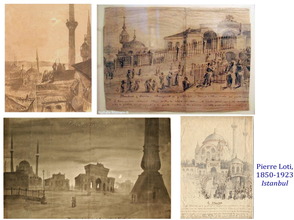 Nombre d’écrivains voyageurs furent dessinateurs et tinrent des carnets de route. Certains comme Pierre Loti, commencèrent à écrire, estimant que leurs dessins, ne suffisaient pas à témoigner de leurs sensations et émerveillements.