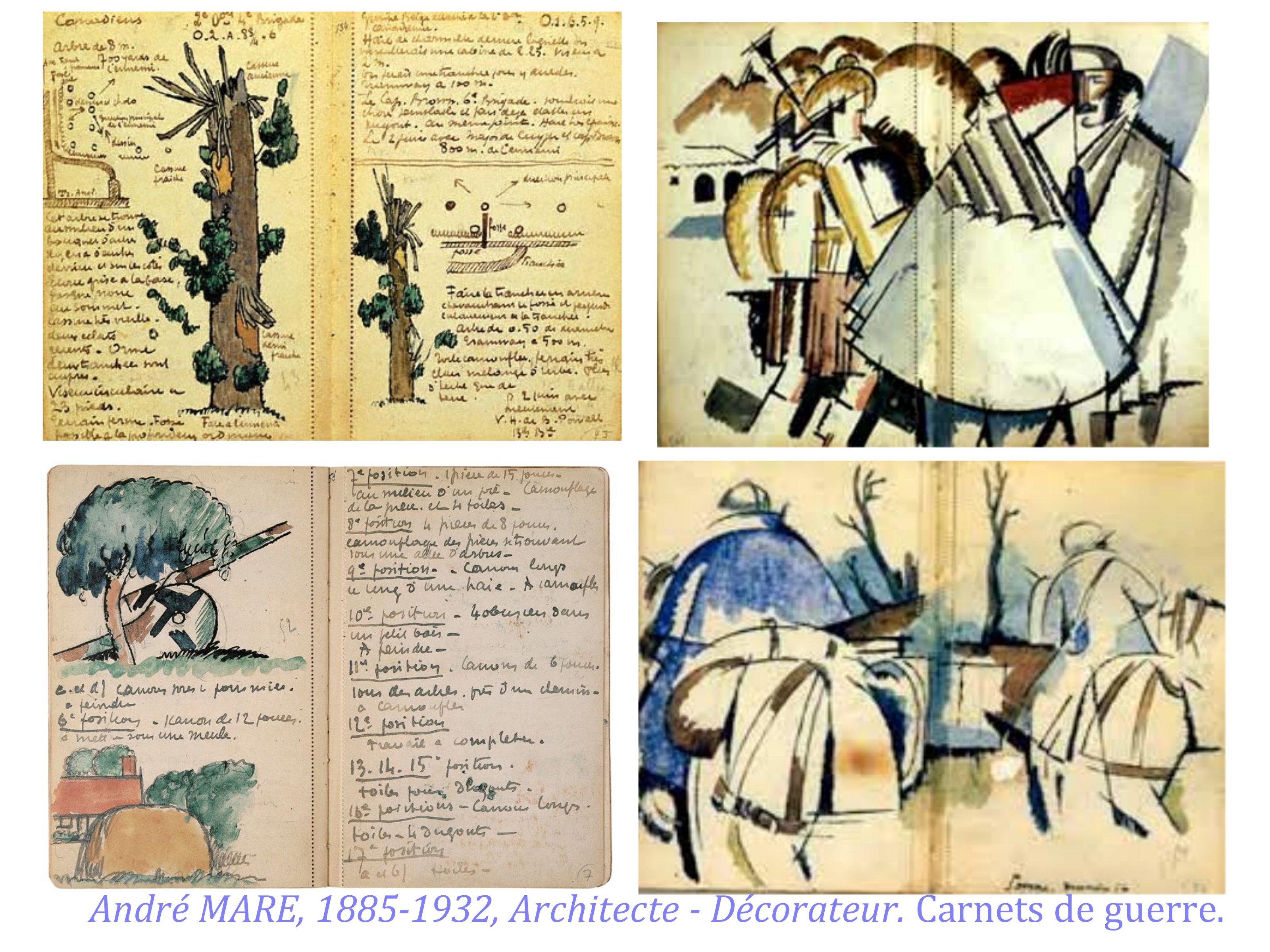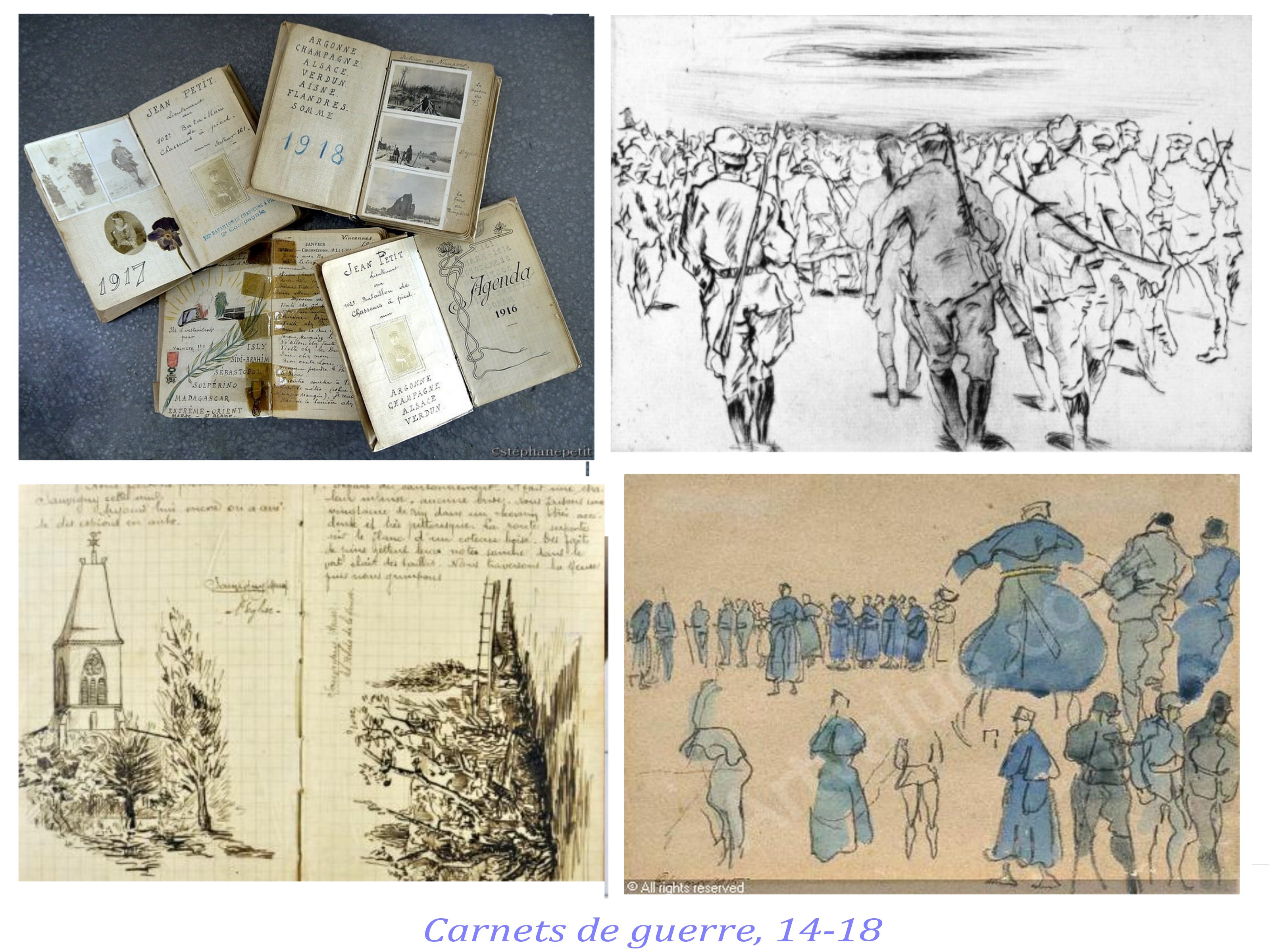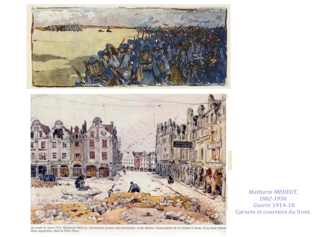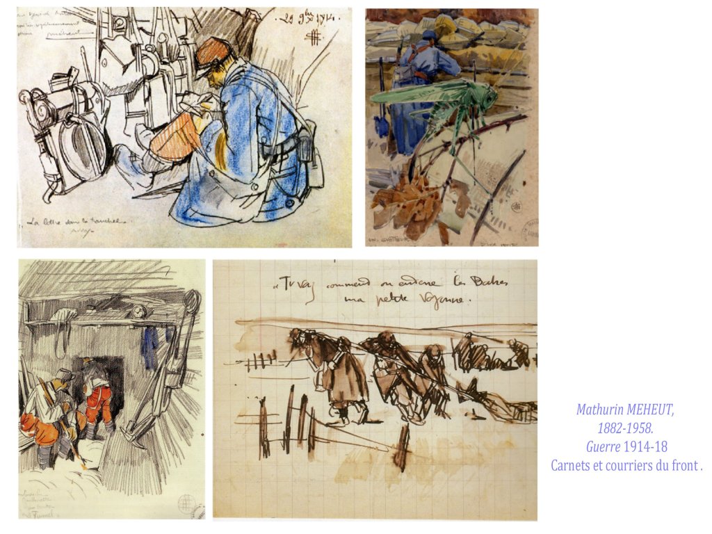 Les carnets de guerre sont aussi des carnets d’ voyage d’un genre terrible, parfois d’une banalité déroutante, qui cache l’horreur ; d’autre fois esthétisés avec une certaine candeur, comme ceux de Mathurin Méheut ; peu expriment l’horreur de la guerre.