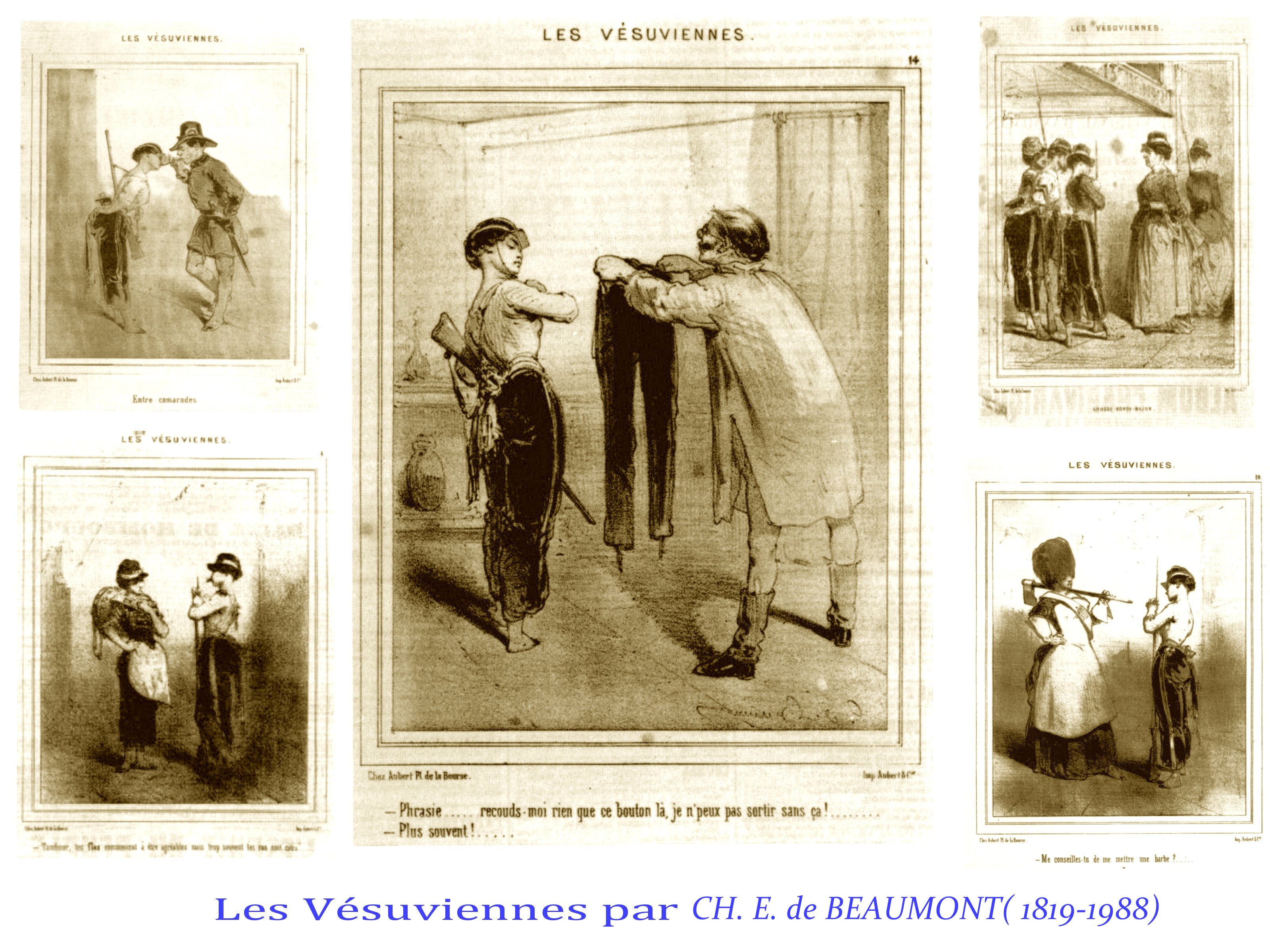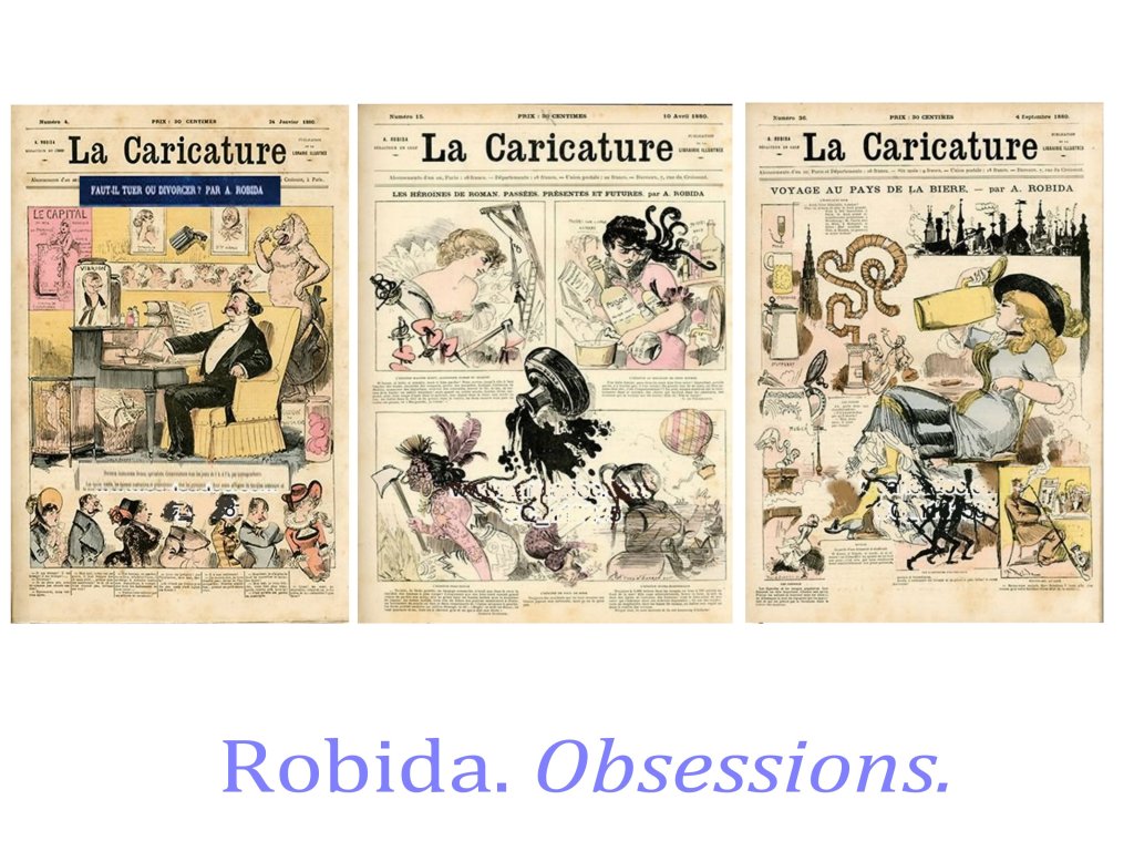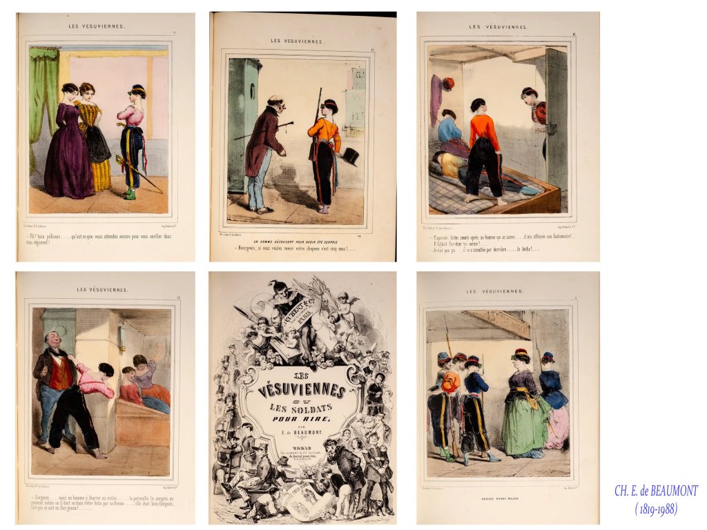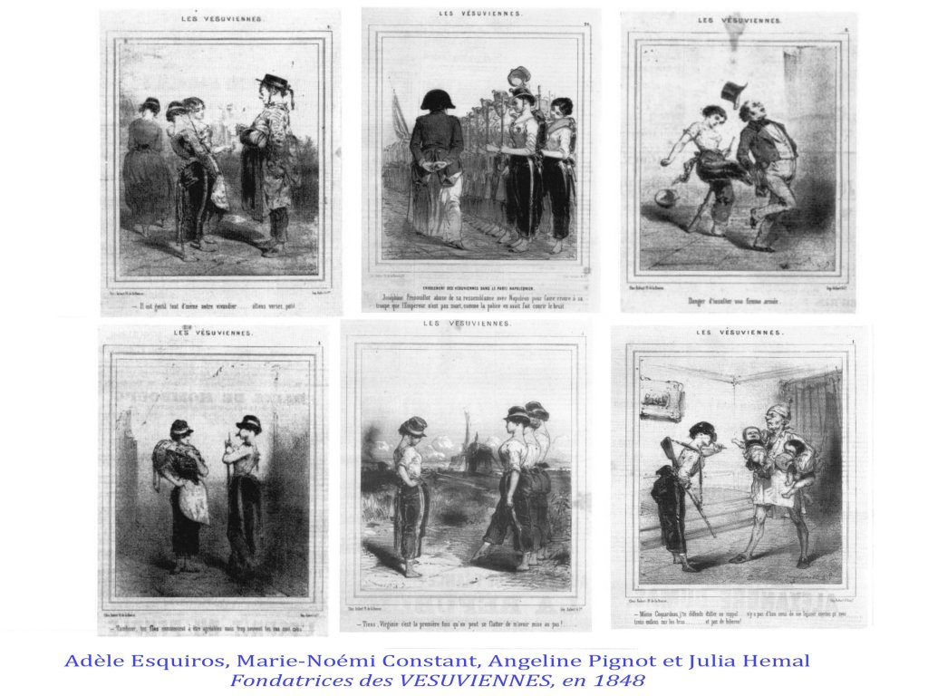 Certains caricaturistes sont plus détachés et envisagent un « grand remplacement », qui serait l’avenir étonnant et curieux , fruit de la victoire des droits des femmes, par exemple les caricatures des « Vésuviennes » ( totalement oubliées!), femmes combattantes de la République de 1848, dessinées de façon flatteuses, la caricature s’exerçant plus sur le « comique » de situation, jusqu’aux visions du futur par Robida, comme émoustillé, par les situations nouvelles où des femmes pourraient faire valoir leurs compétence et leur physique.