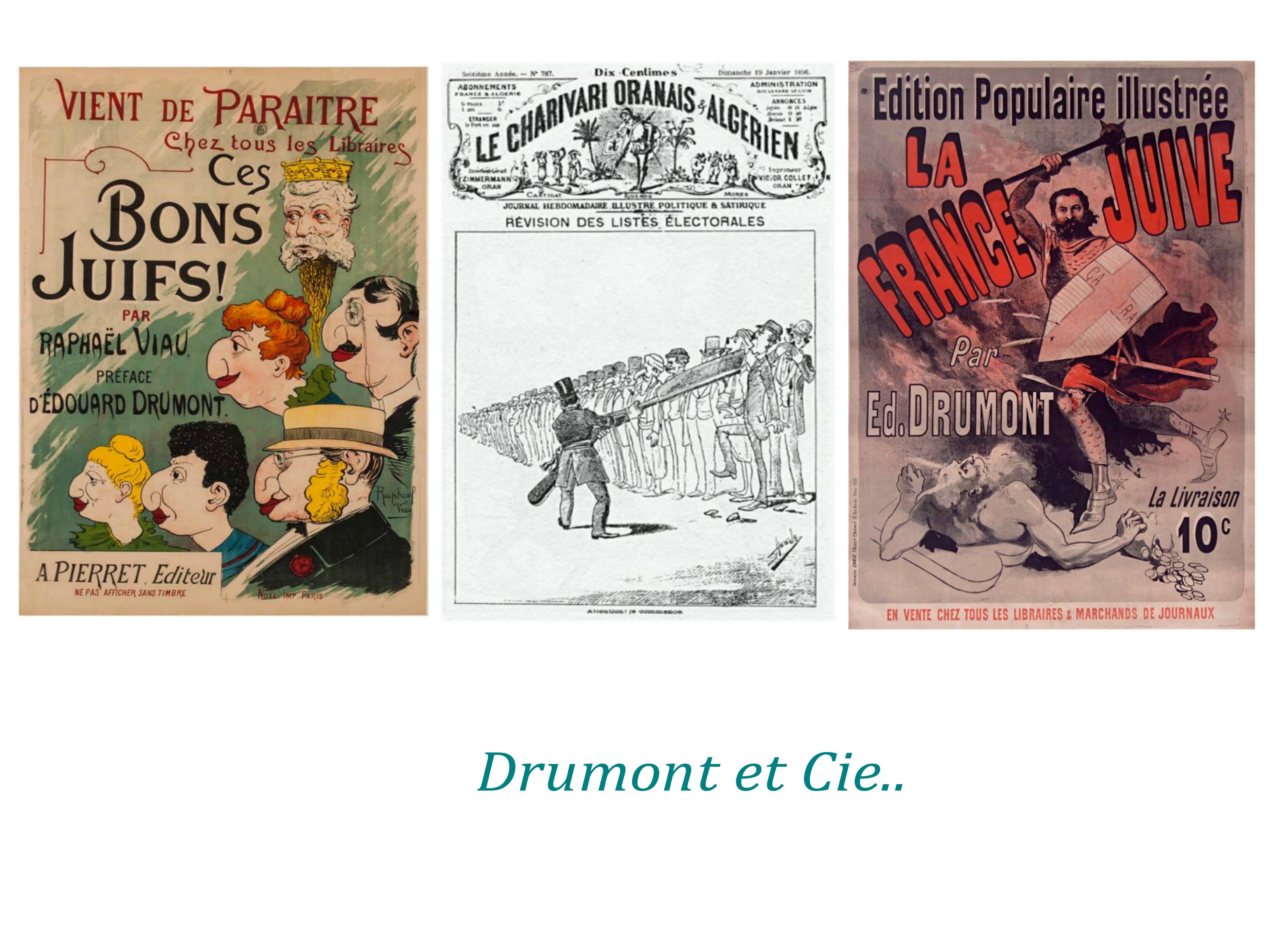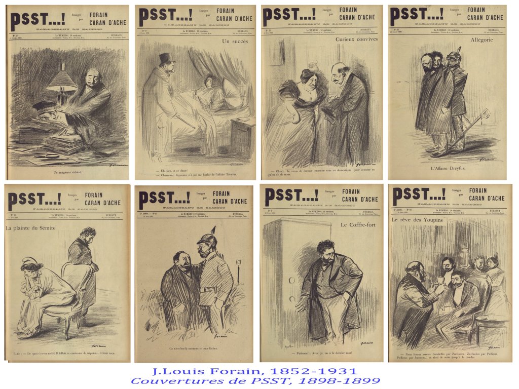 L’antisémitisme, répandu par Drumont ( la libre parole) au moment de l’affaire Dreyfus, se déploie dans les journaux comme Psst , drapeau déployé d’un racisme sans limites et fantasmé. les juifs sont à la fois les banquiers et les patrons, mais aussi l’Internationale ouvrière..Bref, ils sont assimilés à tout ce qui aurait une réalité supra-nationale, menaçant les patriotes ancrés dans le terroir ( idem les Francs-Maçons..). Paradoxe encore, « le juif » serait à la fois reconnaissable par des traits physiques grossièrement tracés, mais serait aussi insidieux et invisible!!!