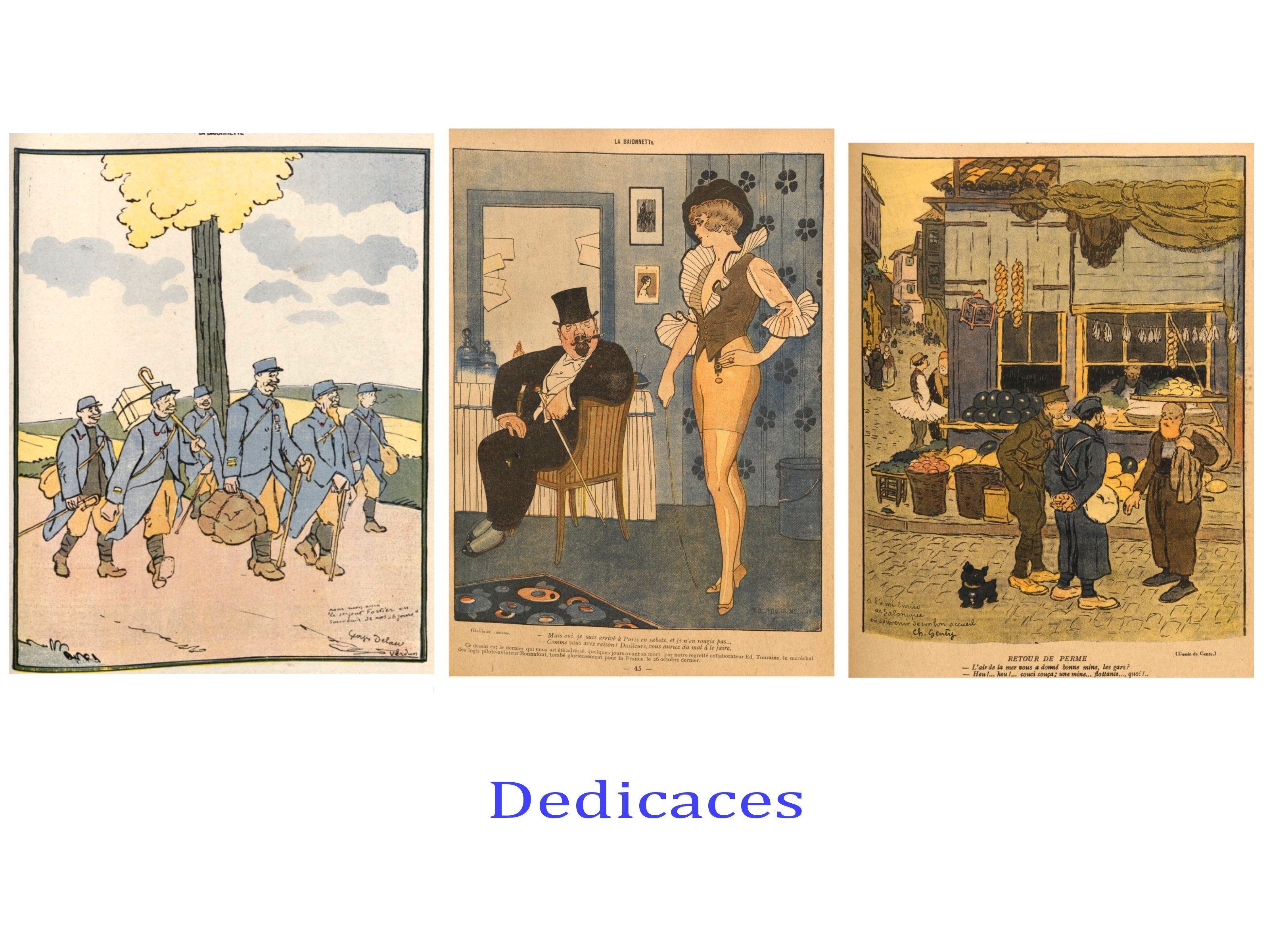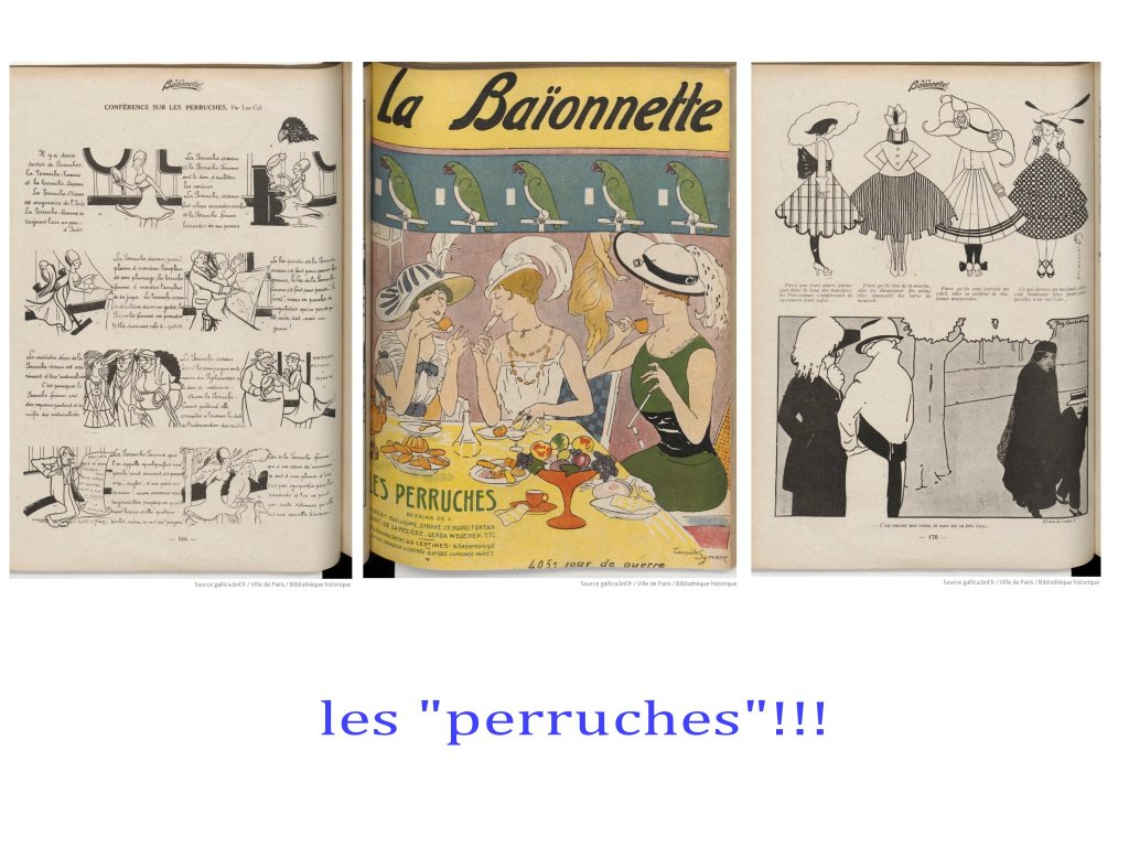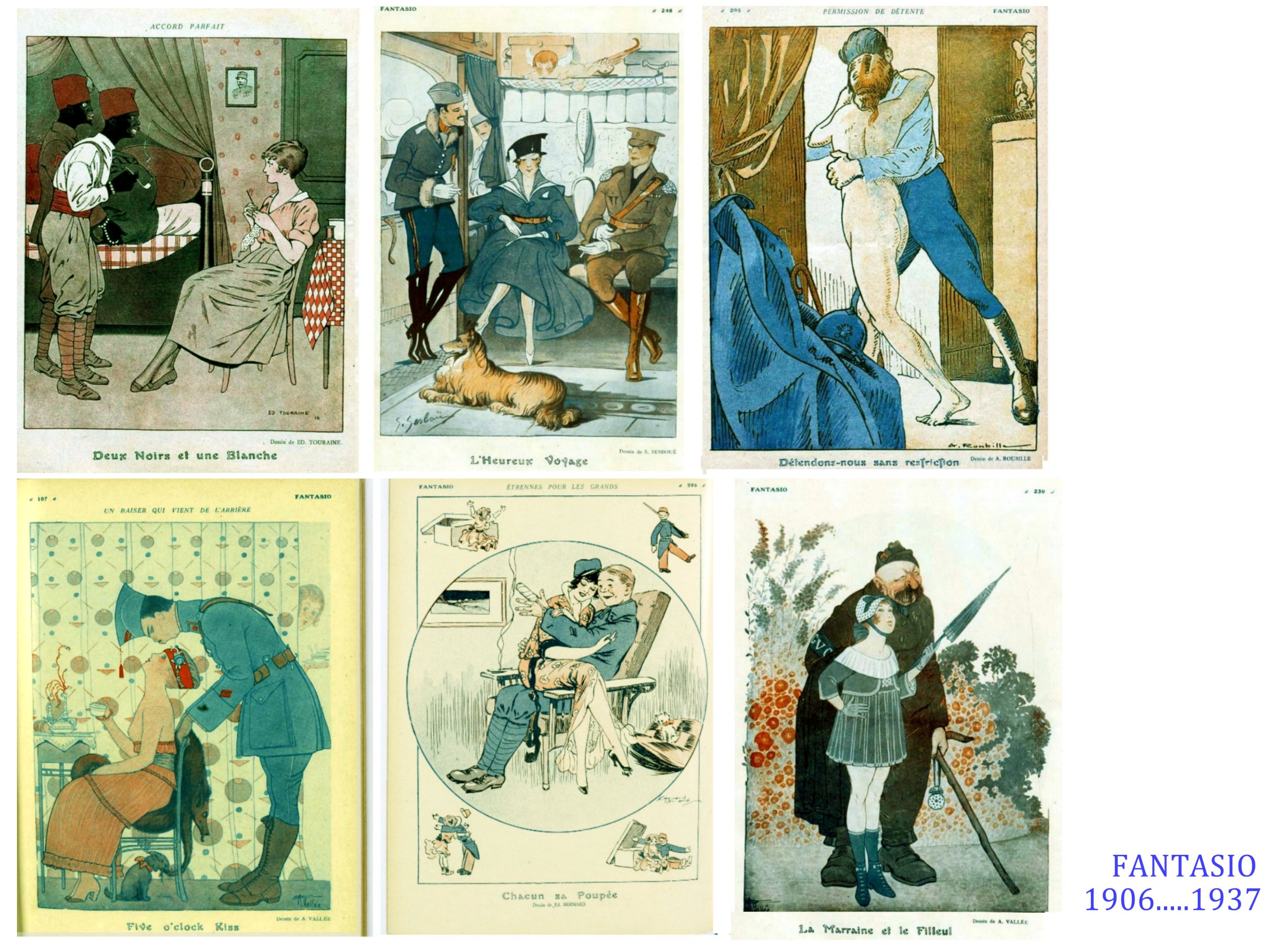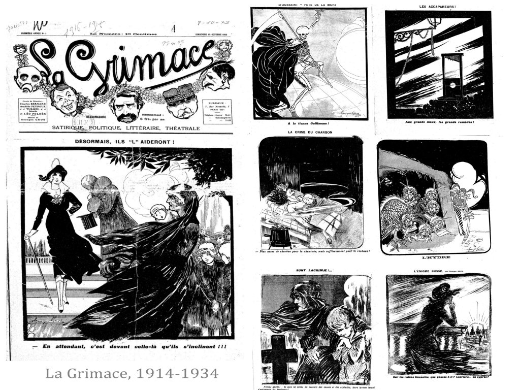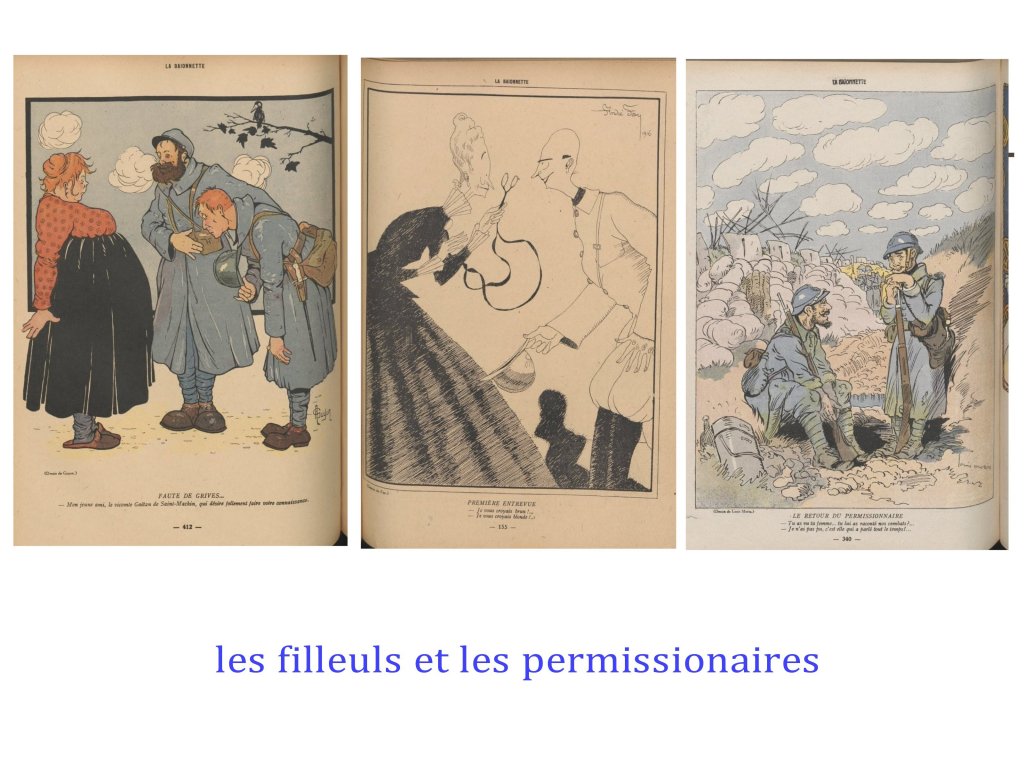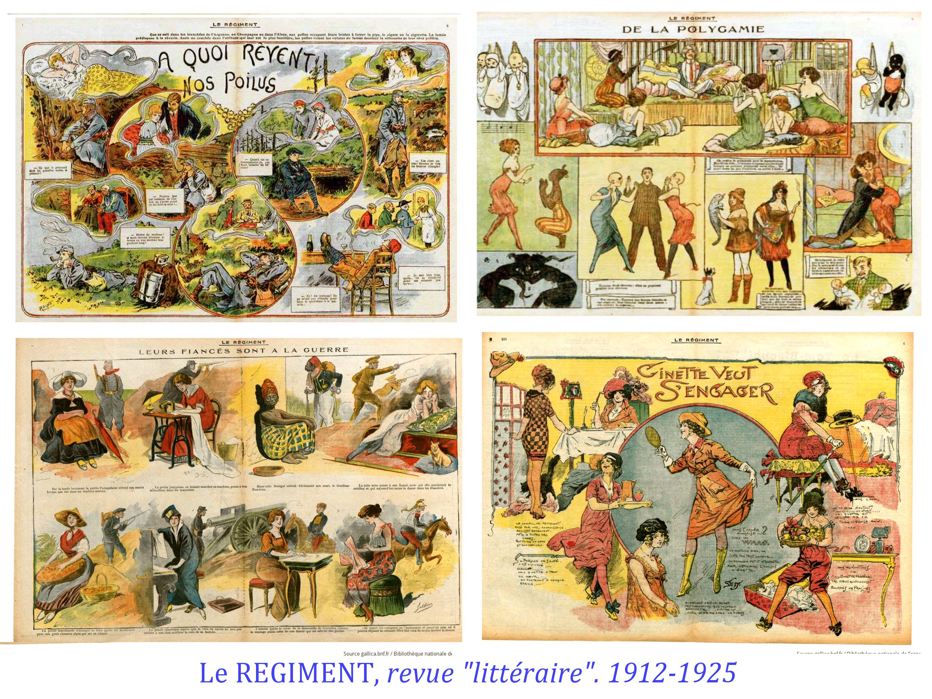 Moins diverse et plus sombre est « la Grimace », quand, » le Régiment » et « Fantasio », sont clairement plus « léger » et lourds à la fois dans le registre du sexisme. Le public est ici, non pas l’ensemble de la société ( front et arrière), mais surtout les soldats, voire les officiers ( Fantasio). Hypothèses à vérifier.