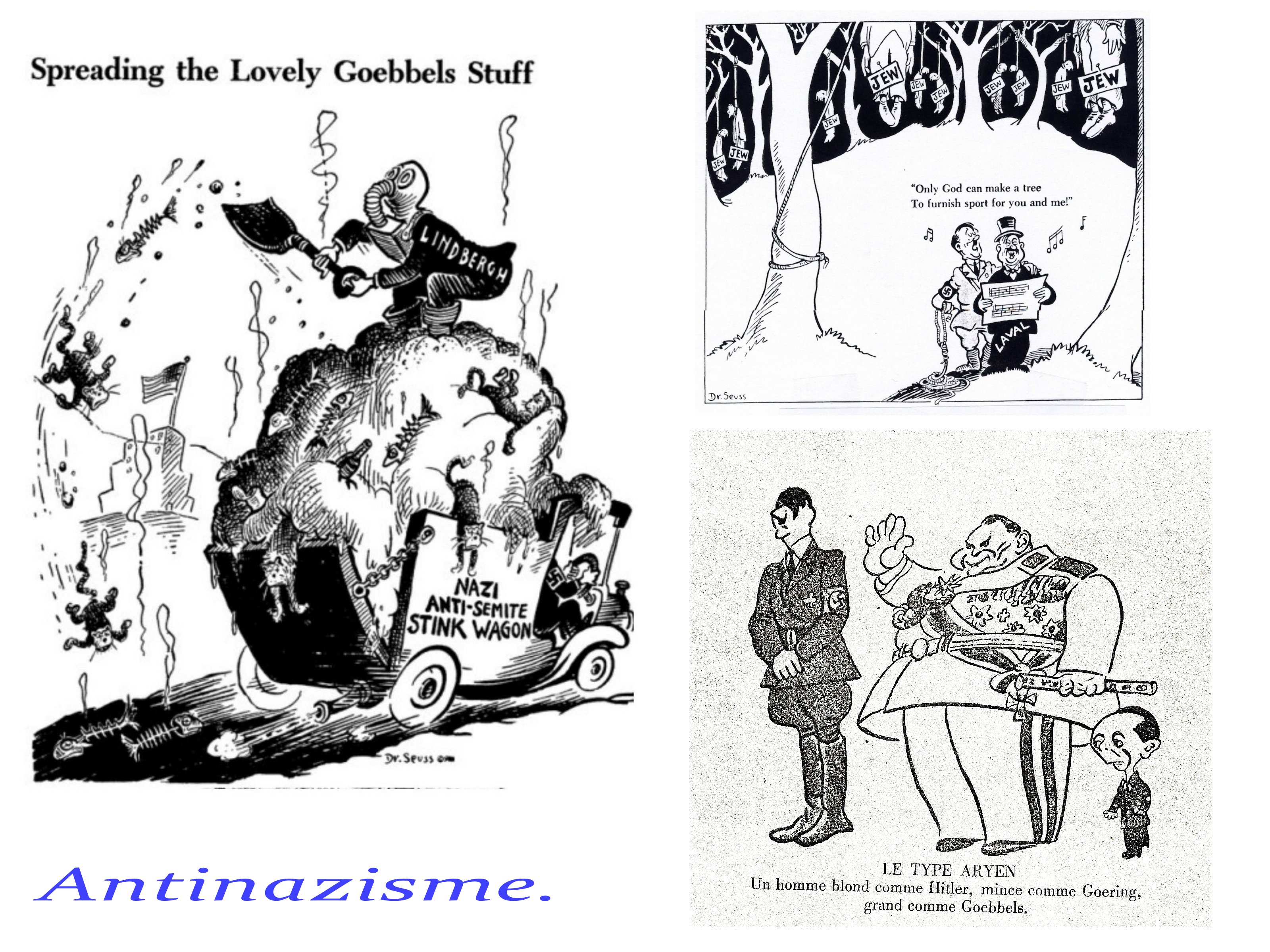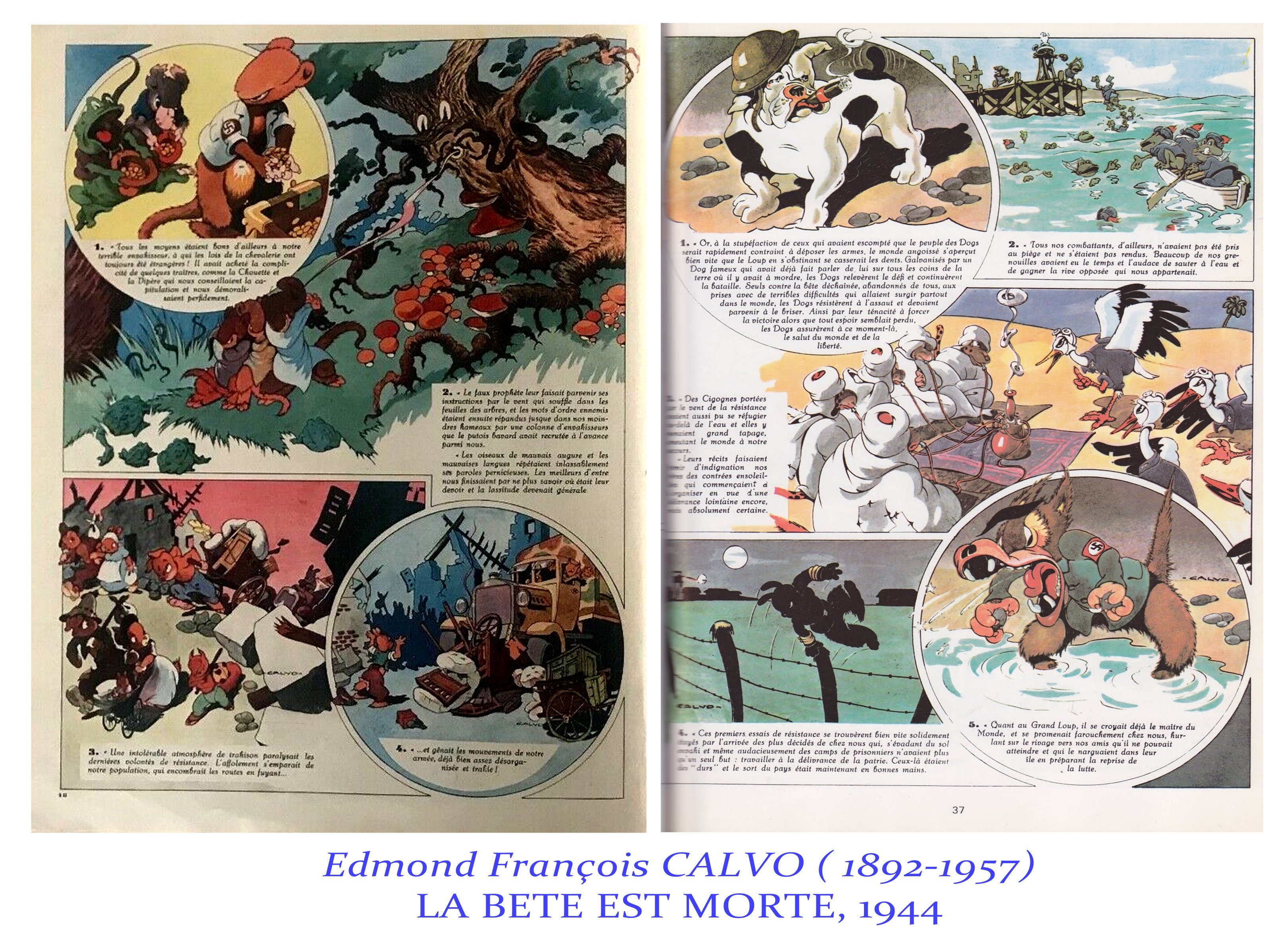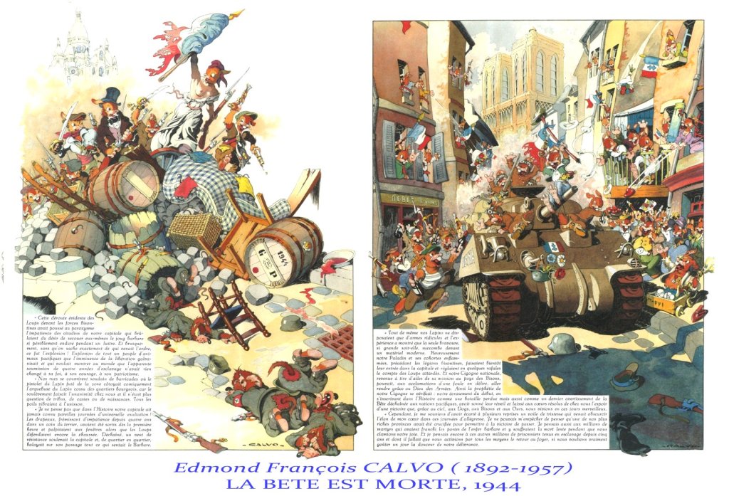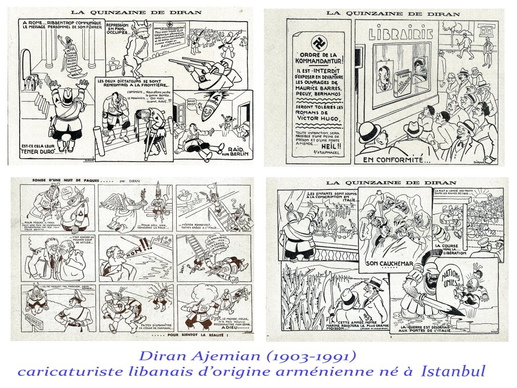 A noter quelques rares dessins antinazis de Diran Ajemian, mais publiés en Afrique du Nord. La presse étant muselée et censurée pendant la guerre, il n’y a pas de caricatures du côté de la Résistance, sinon, le chef d’œuvre de Calvo » la bête est morte », parue après le débarquement.